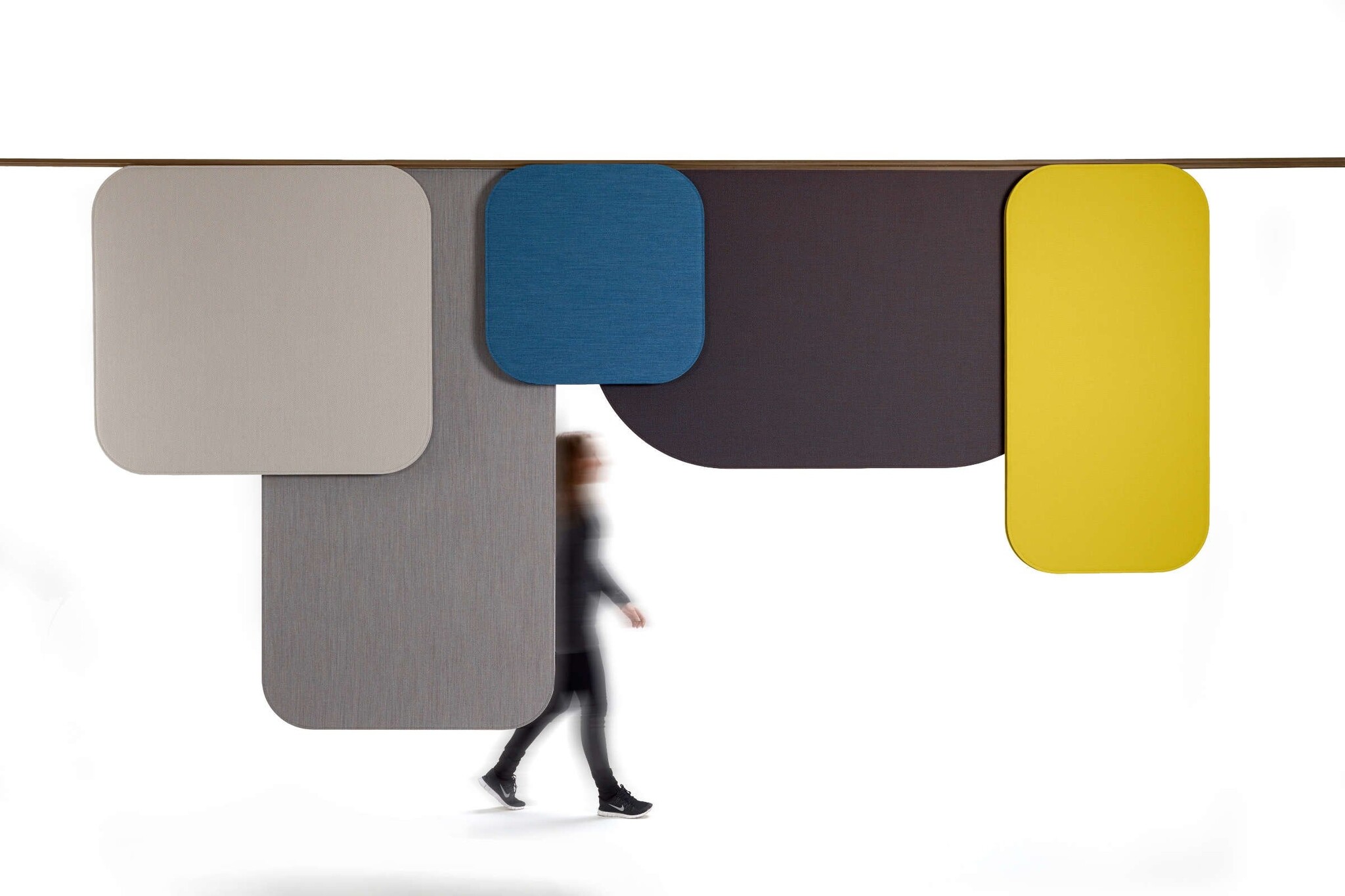De Offecct Notes akoestische panelen absorberen niet alleen geluid, maar dienen tevens als een fraaie ruimteverdeler. Doordat de panelen aan een railsysteem aan het plafond bevestigd zijn, kan er creatief met de rangschikking omgesprongen worden. In de open ruimtes in kantoren is geluidsoverlast een groot probleem. Met akoestische oplossingen, zoals kasten, banken maar ook akoestische panelen, zoals deze Offecct Notes wordt het geluid gereduceerd, doordat het geluid geabsorbeerd wordt door de panelen. Het voordeel van de Offecct Notes is, is dat ze makkelijk ana het plafond te bevestigen zijn.