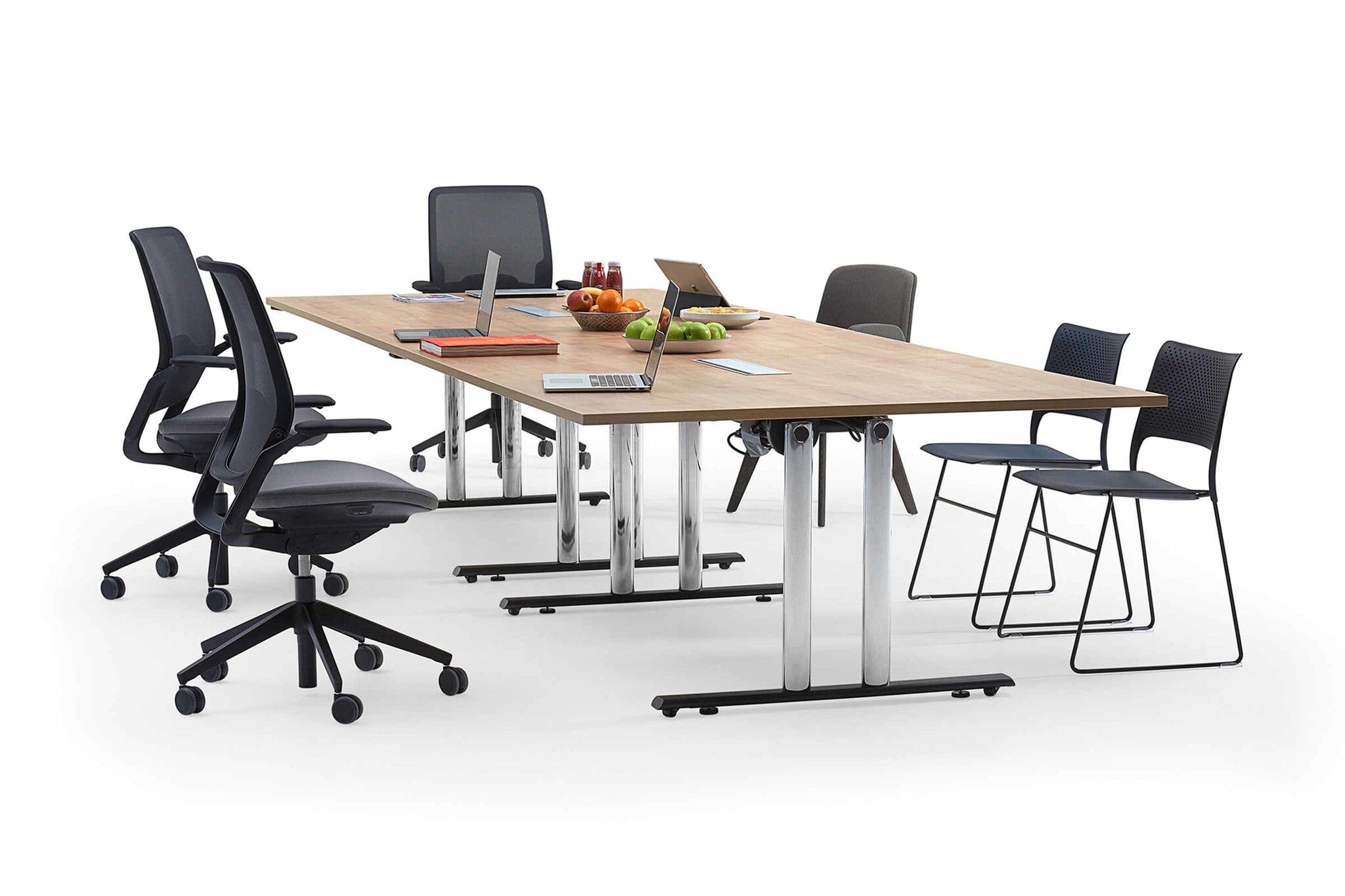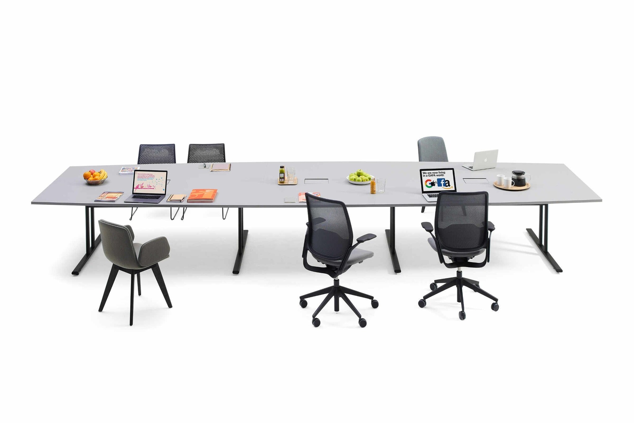 Bij informelere ontmoetingen zijn ronde tafels geschikter dan rechthoekige of tonvormige tafels. Zo voorkomt u dat er iemand aan het hoofd zit. Een tussen oplossing kan nog een ovale tafel zijn om toch met een grotere groep te vergaderen.