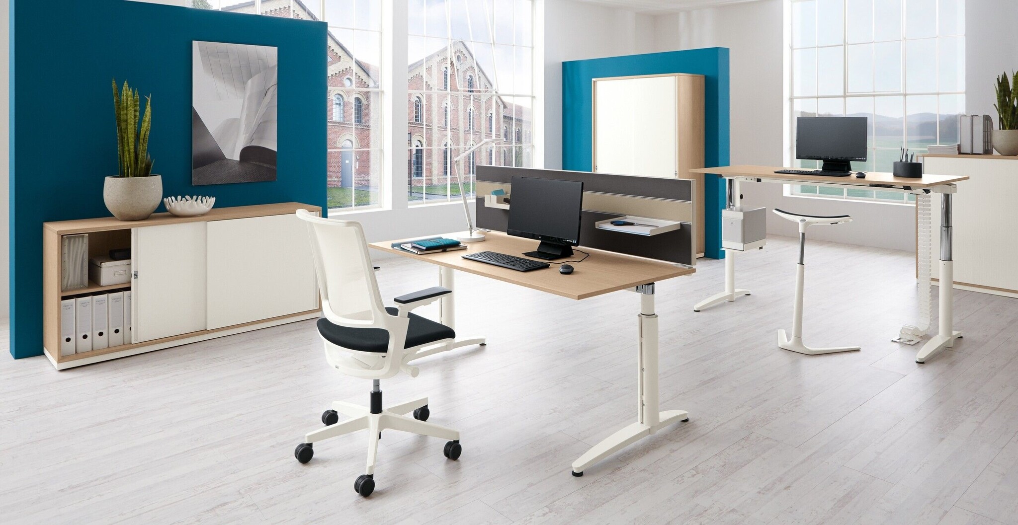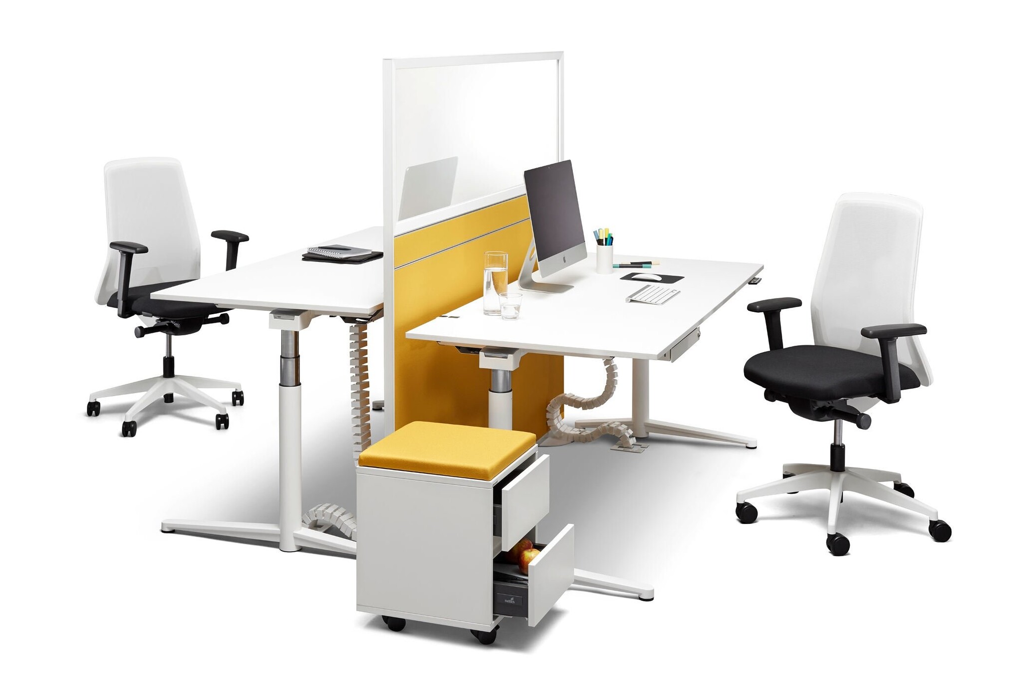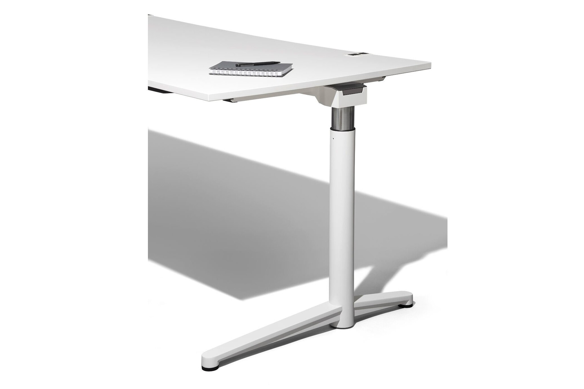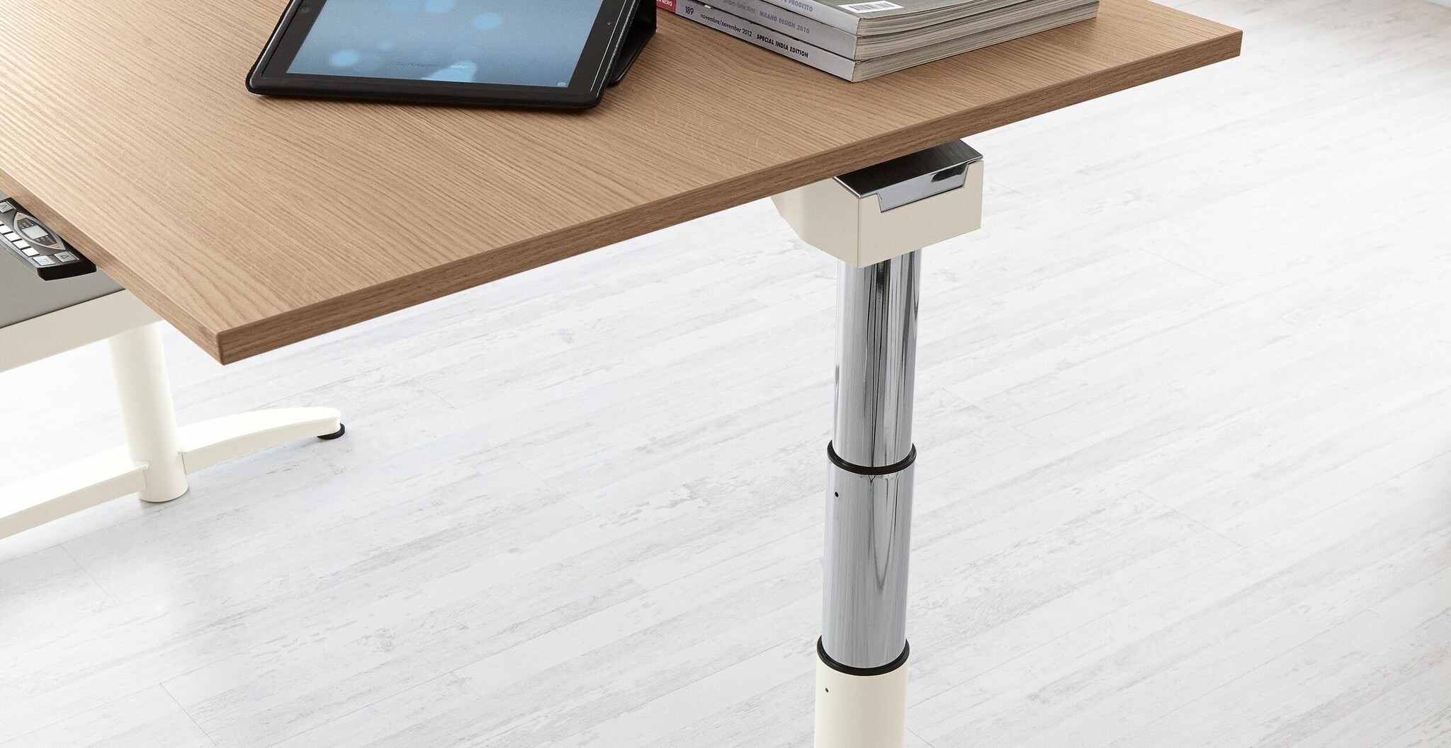 De werkwijze van de medewerkers op kantoor is vandaag de dag vaak zeer verschillend. Daarom is het zinvol om de verschillende teamspelers de ideale werkplekhoogte te bieden. Met de C-poot van het CALDO bureau vindt u voor elke situatie een oplossing. CALDO biedt de gebruiker een hoogteverstelling in vijf varianten. Naast de vaste tafelhoogte kan het CALDO bureau ook individueel in hoogte worden versteld via een traploze veersteun of een slinger. Daarnaast biedt het bureausysteem nog twee andere varianten als in hoogte verstelbaar bureau - de elektromotorische zit-sta oplossing. Het bureau heeft een representatieve uitstralingen is in hoogte verstelbaar. Het is de opvolger van de Caldo C en heeft een aangepaste teen.