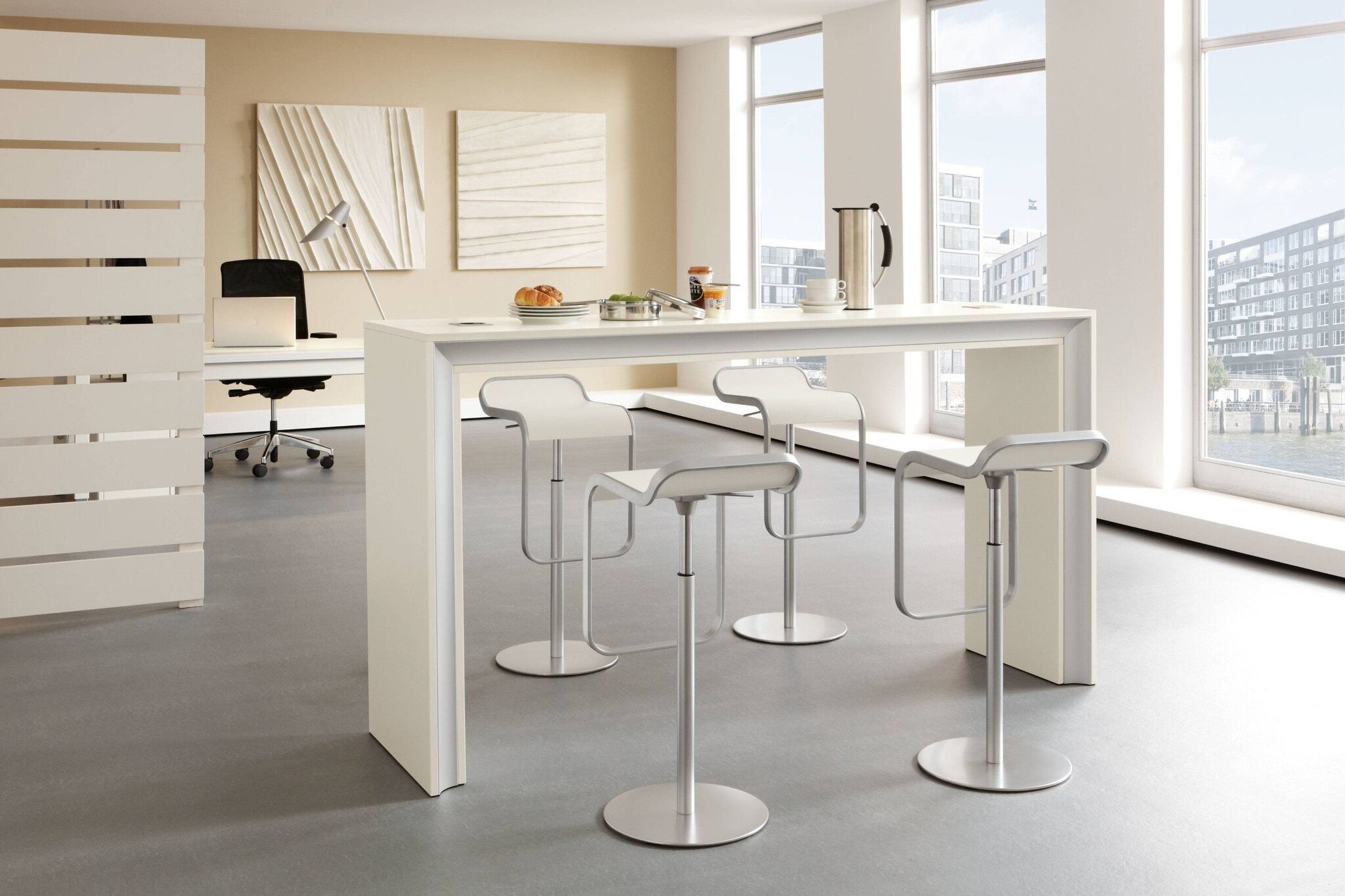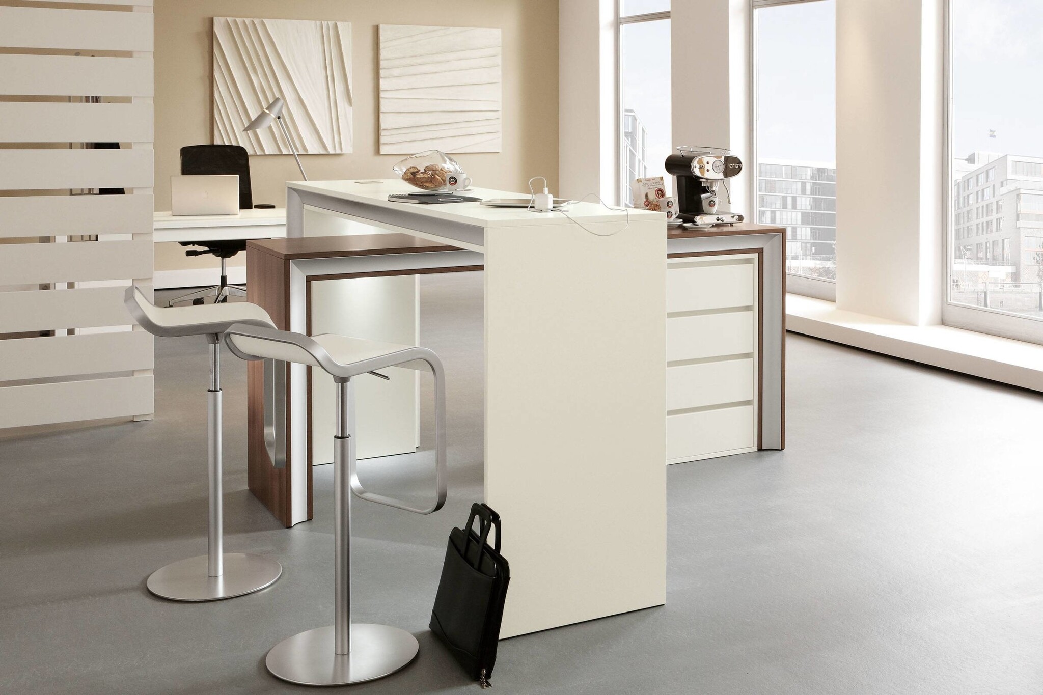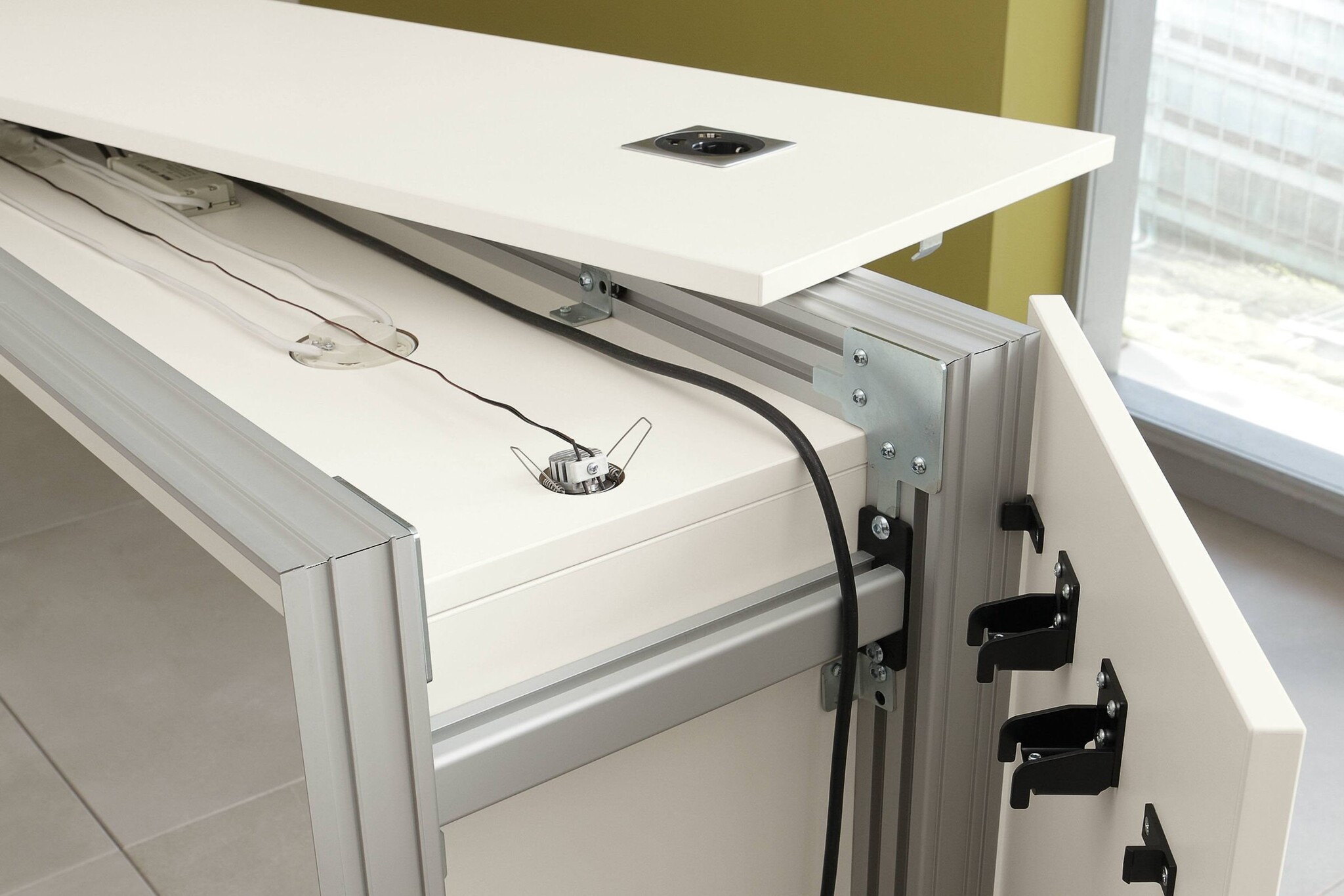 Dit is een representatief communicatie meubelprogramma met verschillende functie- en multimedia elementen. In verbinding met het sideboard programma Select en het vergadertafelsysteem Palma ontstaat door Kit een inspirerende en multi- functionele kantoorinrichting. Het rechtlijnige en zelfstandige design verlenen de Kit tafel een elegante, moderne en hoogwaardige uitstraling. Bruggen bestaan uit een concaaf aluminium profiel met een verstekverbinding van 45°, die tot een constructieframe samengesteld worden. Door de binnenliggende dwarsbalken worden de zijgedeeltes (frames) met elkaar verbonden. De binnenpanelen zijn aan het aluminiumframe vastgeschroefd. De buitenpanelen zijn 90 mm groter dan de binnenpanelen. De buitenpanelen en topbladen worden met clips met het brugprofiel verbonden. Daardoor is een eenvoudige demontage van bekabeling en elektrificatie mogelijk. De omlopende binnenwerk afstand tussen de buiten- en binnenpanelen bedraagt 62 mm en biedt hierdoor veel ruimte voor verschillende elektrische toepassingen. Bruggen voor opdokken op ladeblokken en sideboards of voor montage aan wanden en zijkanten van kasten zijn 913 mm of 1105 mm hoog. Elektrificatiemodules zoals stekkerdozen, Coni-boxen, licht-sets etc. kunnen optioneel ingebouwd worden.Palmberg Kit specificaties: