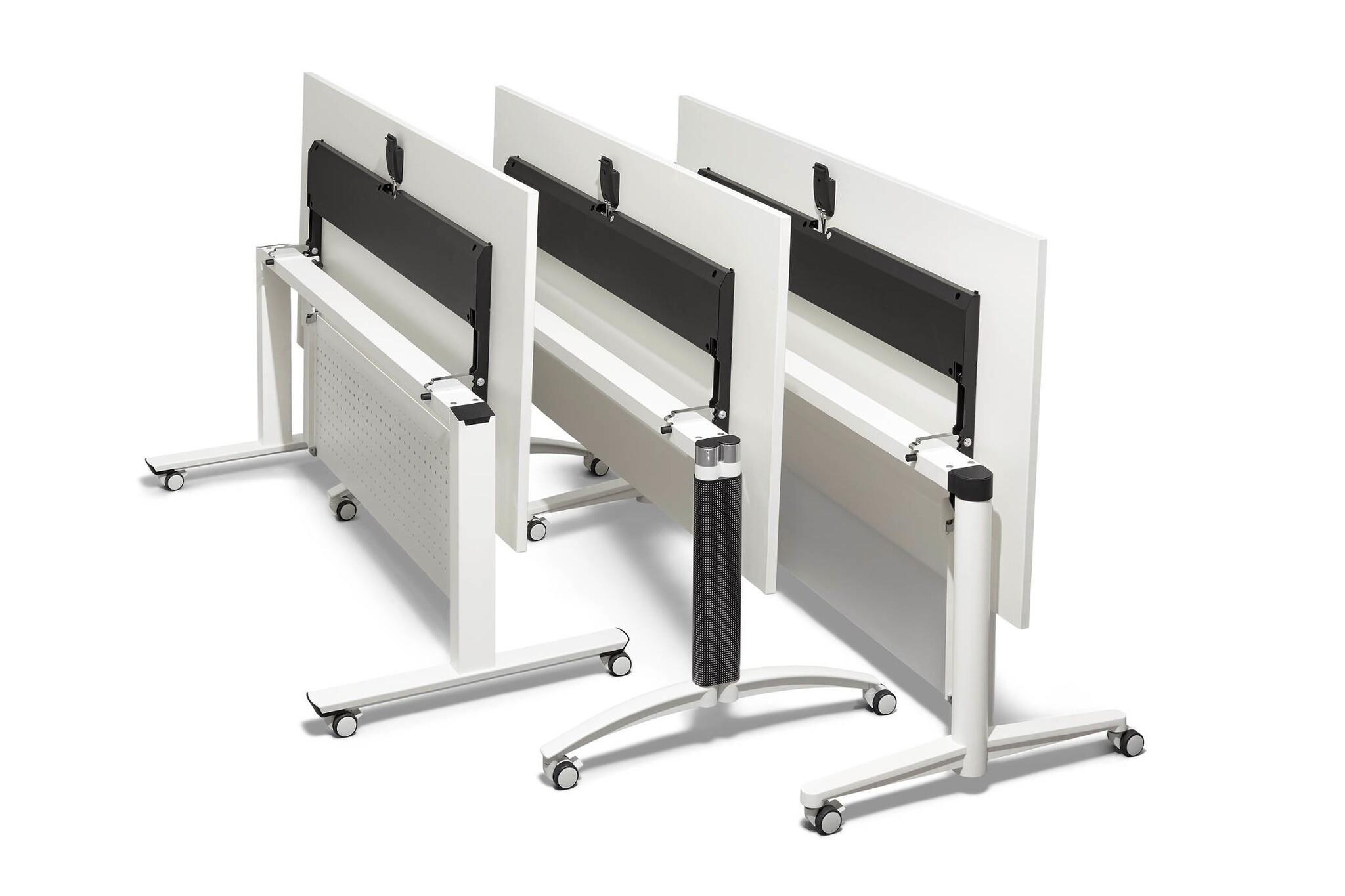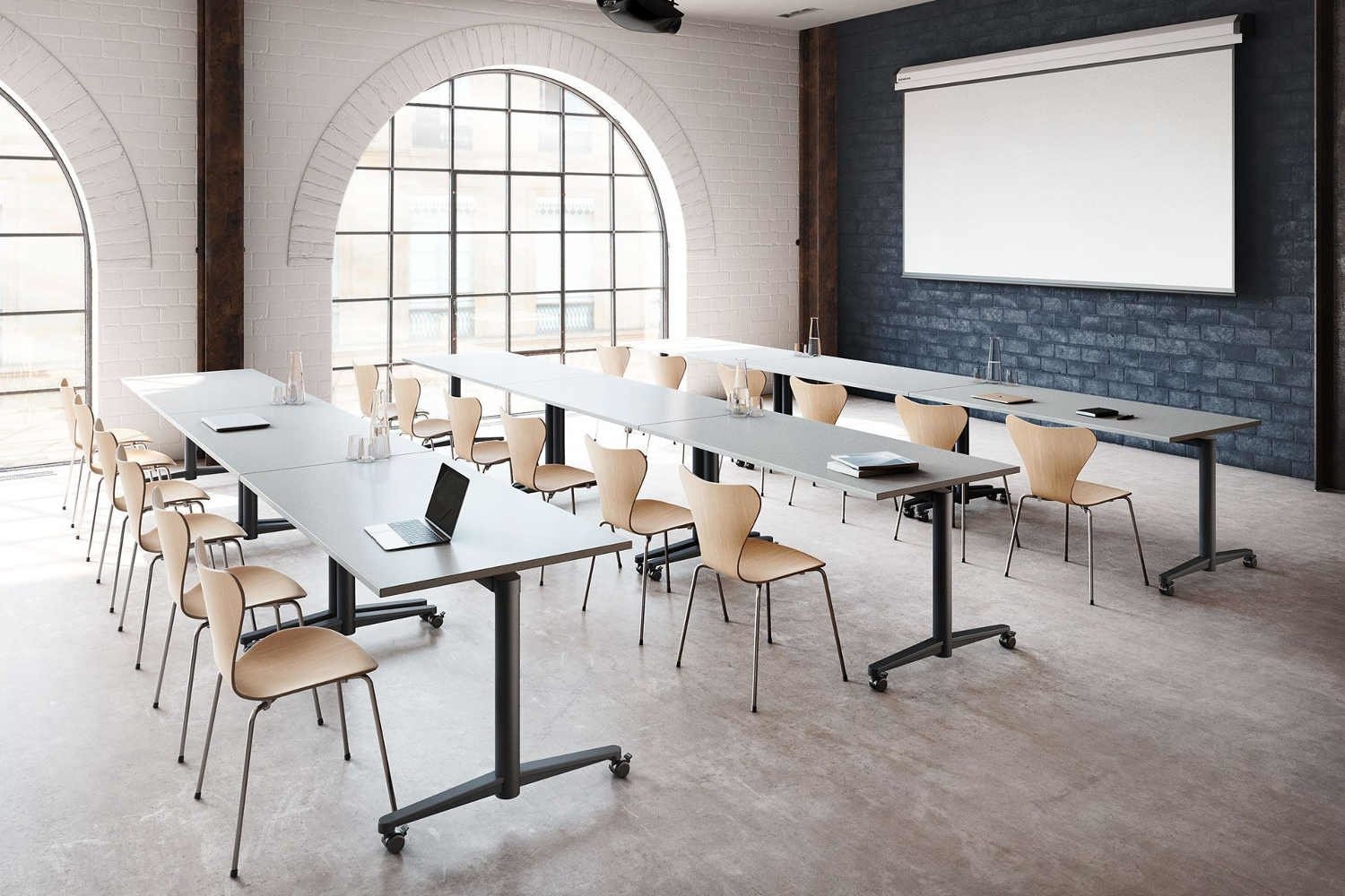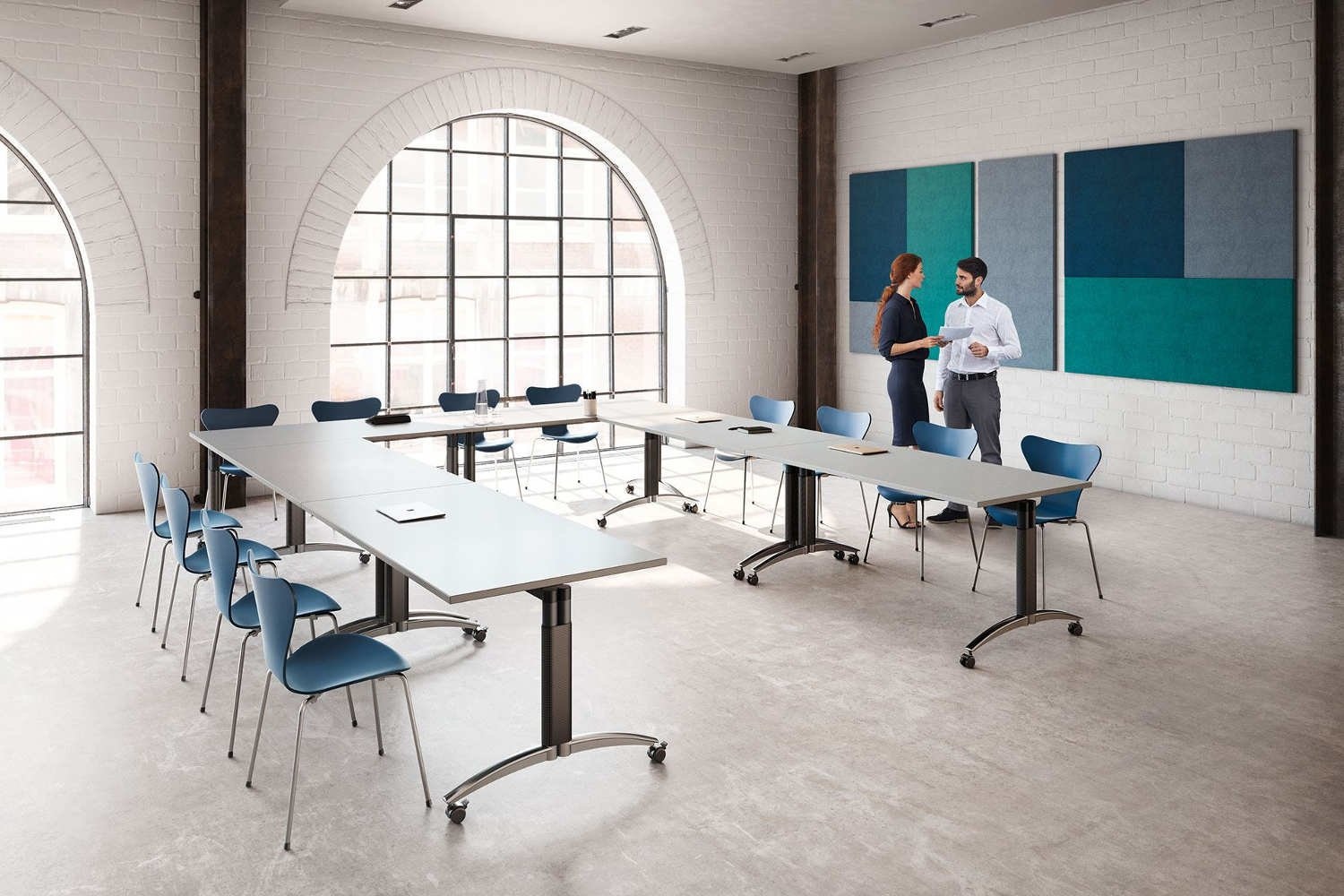 In moderne werkomgevingen moeten kantoormedewerkers de mogelijkheid hebben om flexibel te zijn en snel en eenvoudig configuraties aan te passen aan hun behoeften - van kortstondige teamwork en trainingssituaties tot conferenties en vergaderingen in kleine groepen en weer terug. De mobiele klaptafels van Palmberg, die op wielen kunnen worden gebruikt, passen zich flexibel aan de veranderende eisen van uw communicatie aan. En wanneer ze niet meer nodig zijn, kunt u de tafels parkeren in een ruimtebesparende ruimte die daarvoor beschikbaar is.