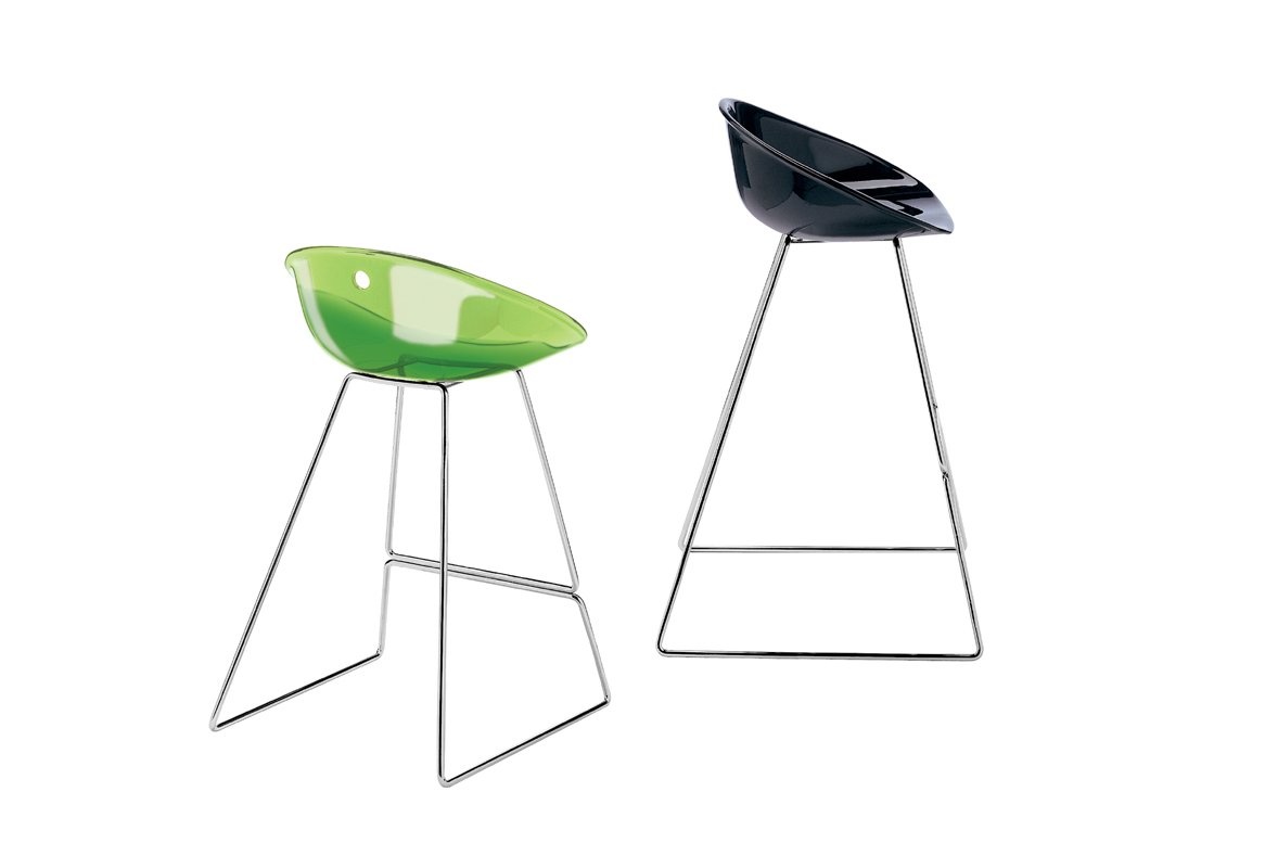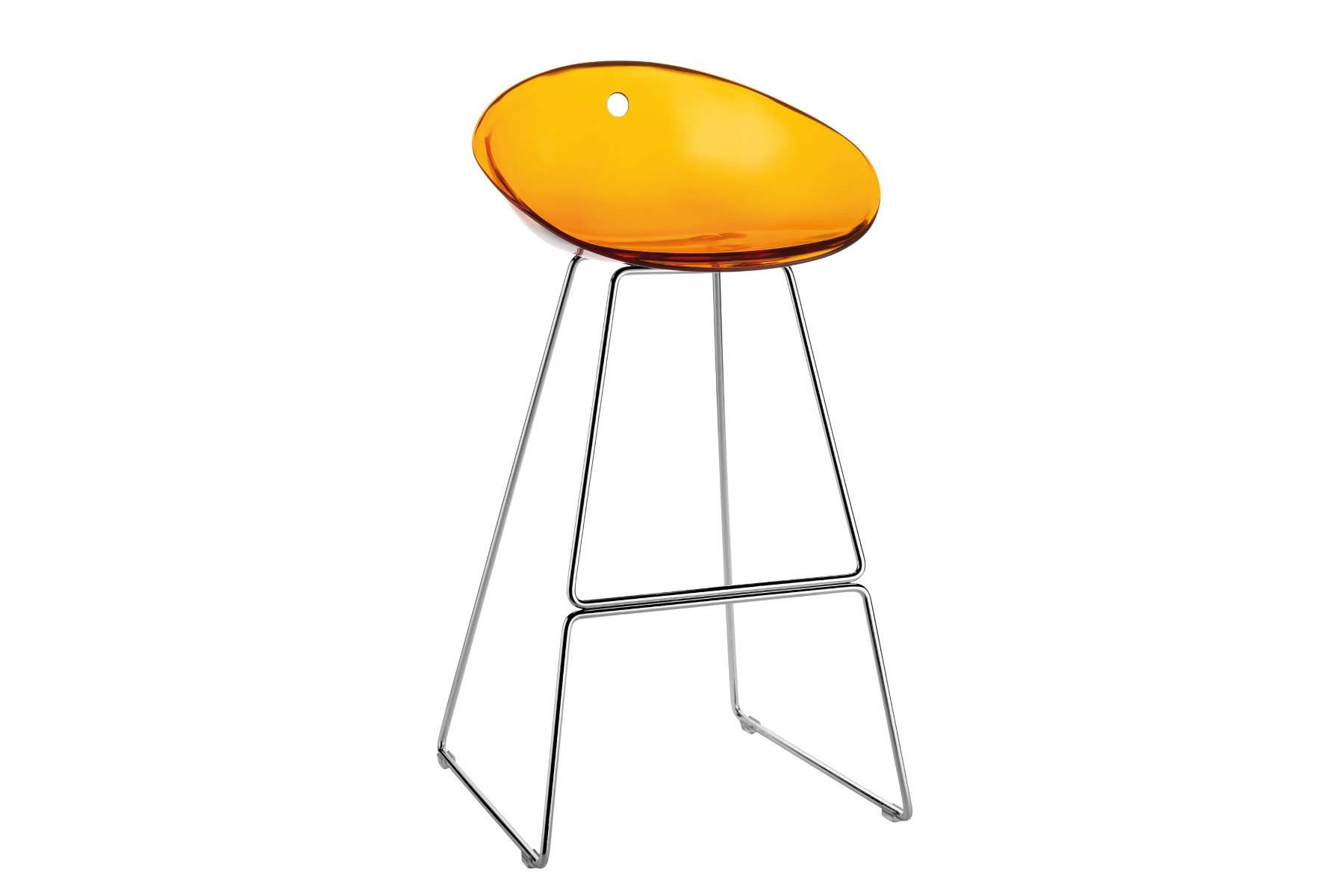 De Pedrali Gliss 906 is een sledebarkruk met een zithoogte van 75 cm. De zitschaal is verkrijgbaar met een glanzende kleur wit en zwart, of transparante versie in de kleuren rood, oranje, groen, smokey grijs en transparant. Frame met een verchroomde buis.