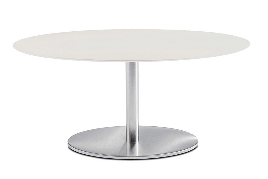 Lage tafels met een centrale kolom en een geborstelde of gepolijste roestvrij stalen basis. Tafelbladen van laminaat verkrijgbaar in de verschillende kleuren ivoor, weng é en gebleekt eiken.