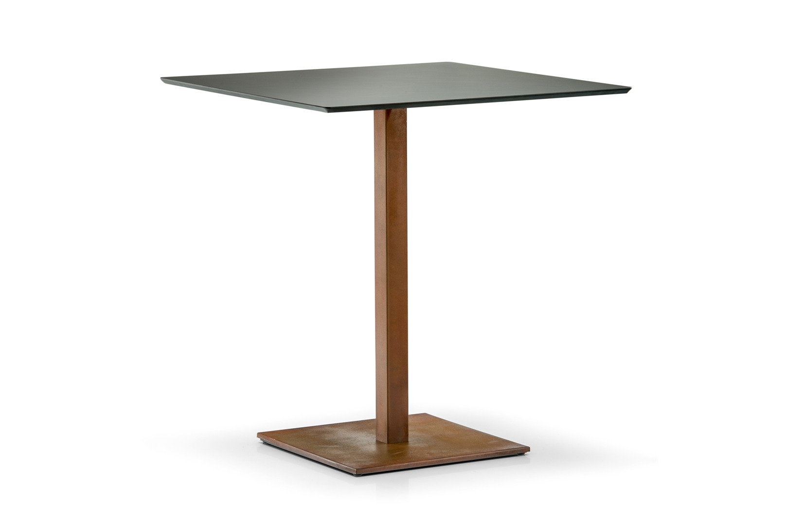 Tafel met gezandstraald gietijzeren basis en een geborstelde, gepolijste of poedercaoted roestvrij stalen kolom. Verkrijgbaar met verstelbare glijders. Het onderstel is te combineren met tafelbladen in verschillende maten en afwerkingen.