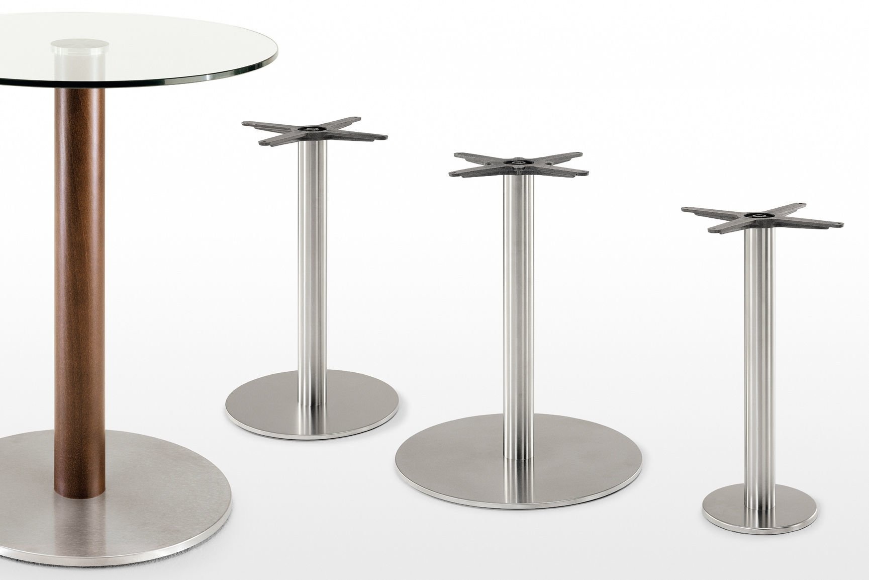 Inox tafel basis met gepolijst of geborsteld roestvrij stalen onderstel met een Ø van 450 mm en massief beukenhout kolom, natuurlijke of wengé gebeitst. Ook beschikbaar in gekleurd kersen, mahonie en walnoot.