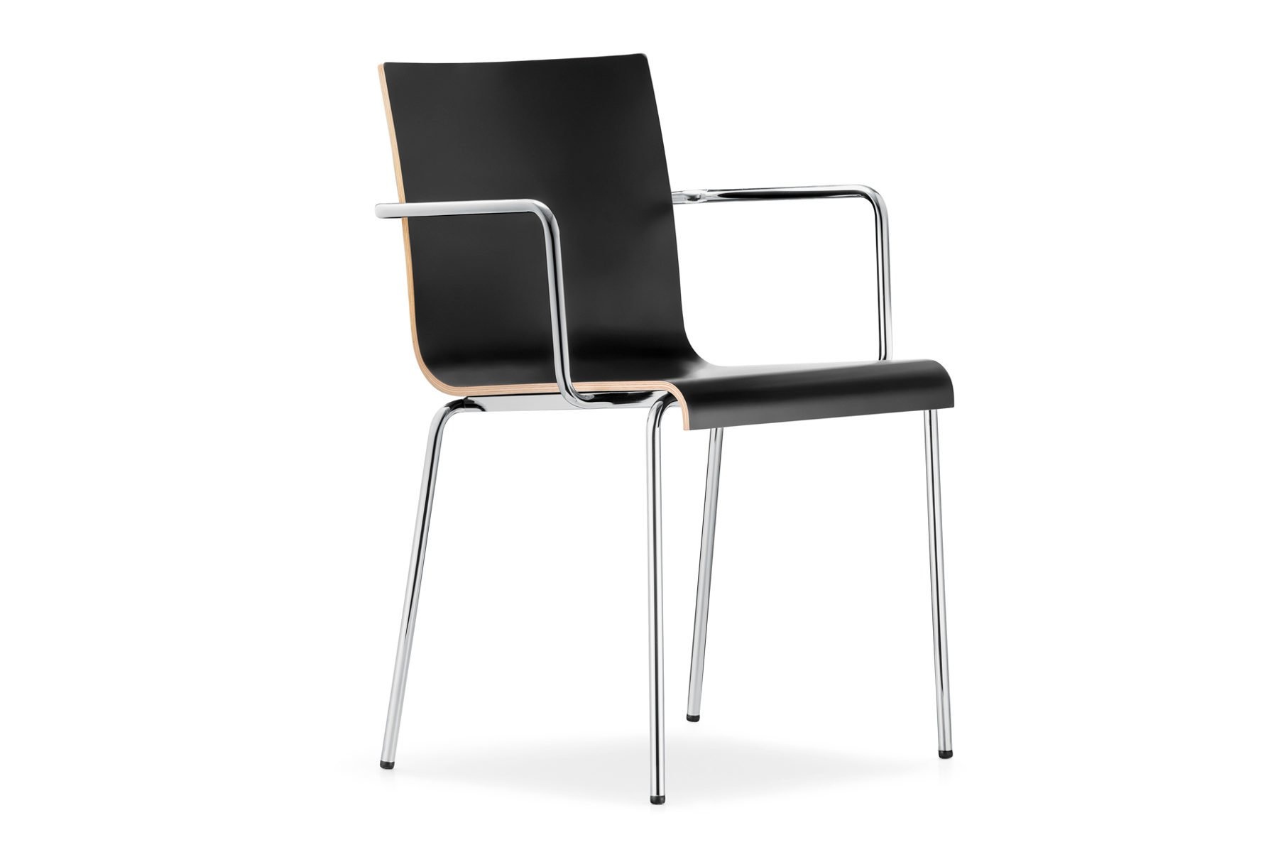 De gestoffeerde Kuadra 1055_CR van Pedrali is stapelbaar tot maximaal 4 stuks. De stoelen hebben armleggers en een stalen frame met een Ø van 16 mm.