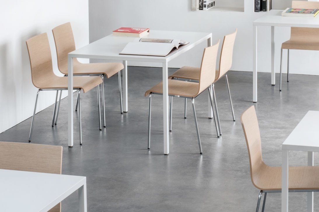De vierpootstoel Kuadra 1151_AL is stapelbaar tot 8 stuks en verkrijgbaar in de kleuren wit en lichtgrijs. Het onderstel heeft een stalen frame met een Ø van 16 mm.