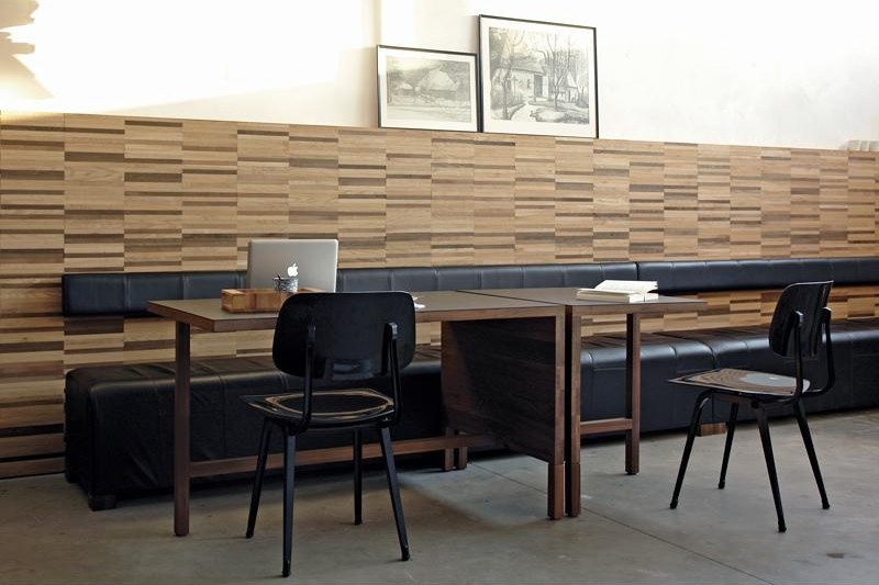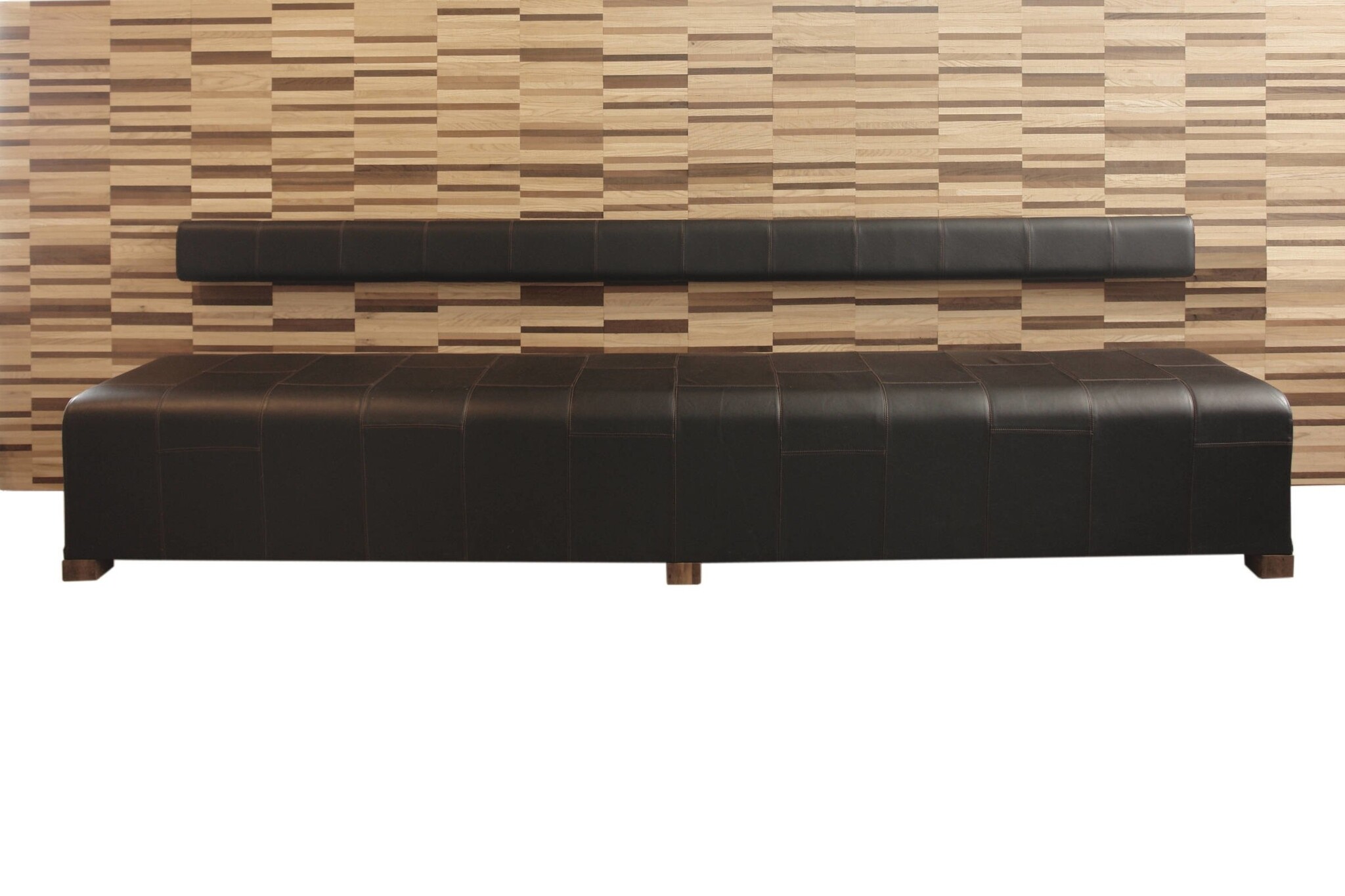 Pilat en Pilat Hinke is een combinatie. Een lambrisering opgebouwd uit verschillende houtsoorten. De wand kan gecombineerd worden met een zitbank en rugleuning met een bekleding van zwart leer. De wand kan ook gecombineerd worden met een tafelblad.