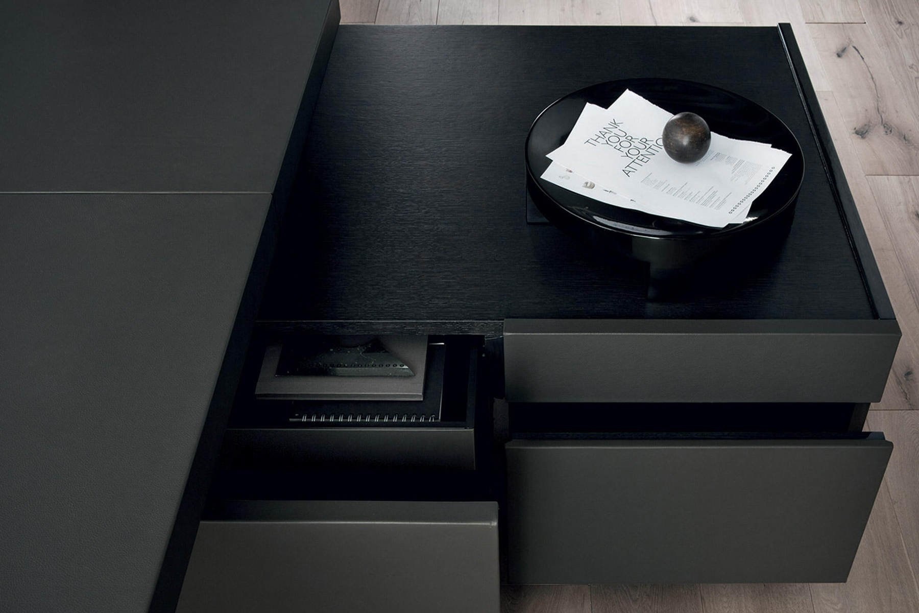 Poltrona Frau Jobs Desk is ideaal geschikt als directiebureaus vanwege zijn uitstraling. Jobs Desk is een verzameling van directiemeubilair. Er zijn drie versies van het bureau: Easy Desk, Executive Desk en President Desk, elk verkrijgbaar met tal van accessoires en variaties. Er is bij het ontwerp van de Poltrona Frau Jobs Desk veel aandacht besteed aan elk detail. De bovenkant is geïntegreerd met een opbergeenheid die via een kabeldoorgang op het bureau is aangesloten. De Jobs President Desk heeft een open vak en twee laden. De Jobs Executive Desk heeft twee laden en archiefkast. De fronten van de laden, uitgerust met een soft-close mechanisme zoals de archiefkast, zijn bedekt met Pelle Frau® leer uit de kleurencollectie van Poltrona Frau. De structuur van beide bureaus is in MDF (vezelplaat met gemiddelde densiteit) met lood- of tabak gekleurd eikenfineer.
