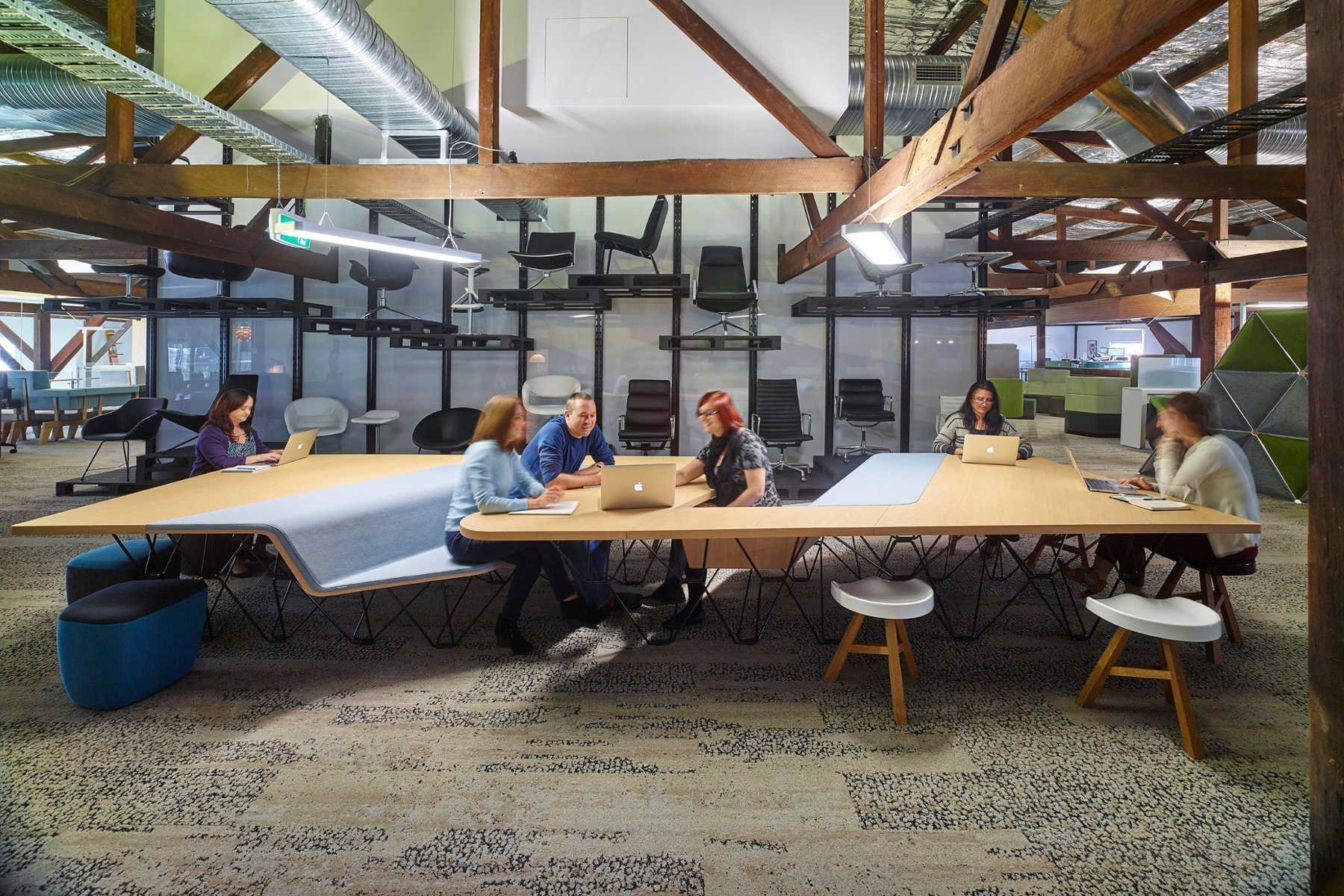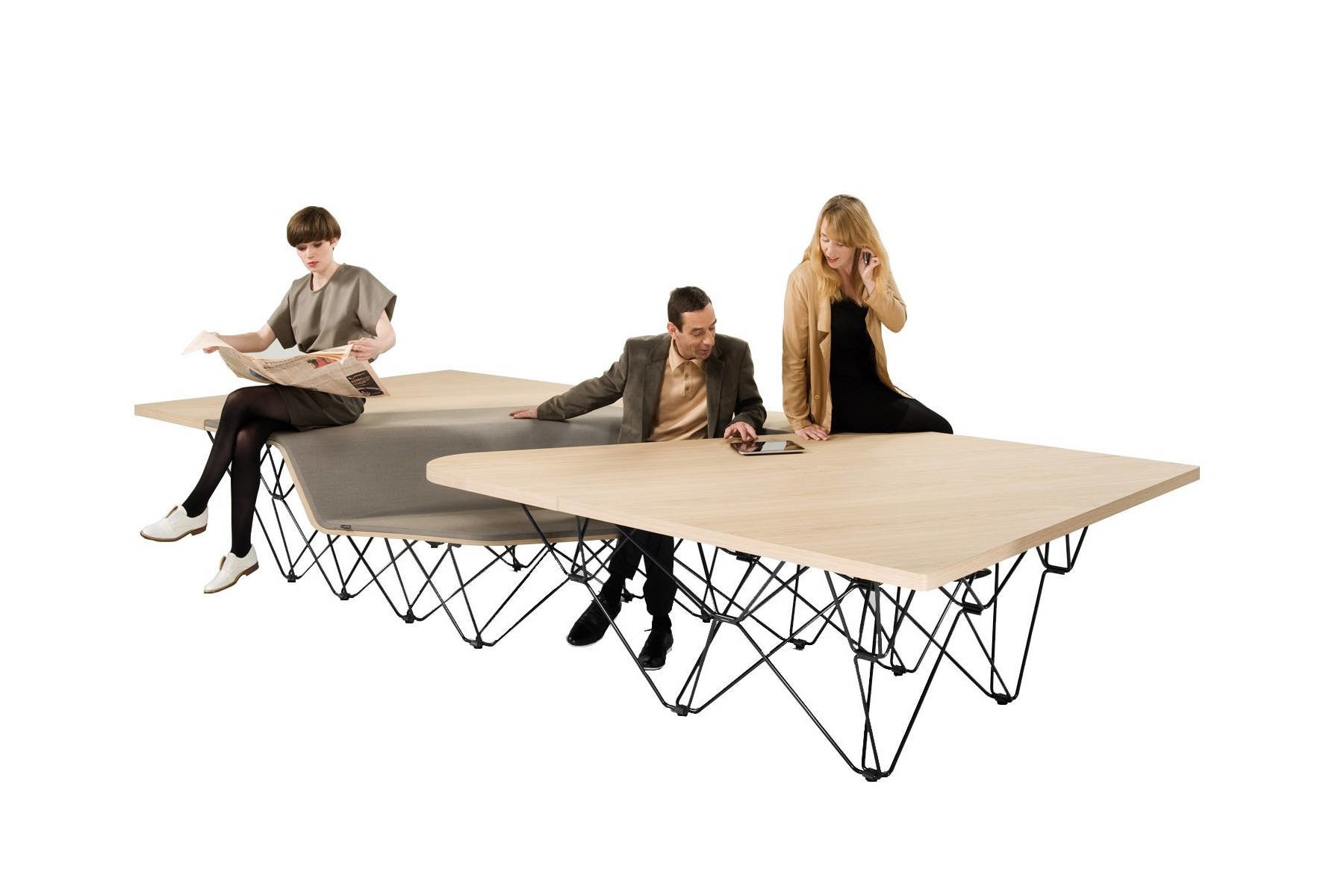 De SitTable bestaat uit een houten tafelblad, metalen frame, schuim voor de zitting van de bank.