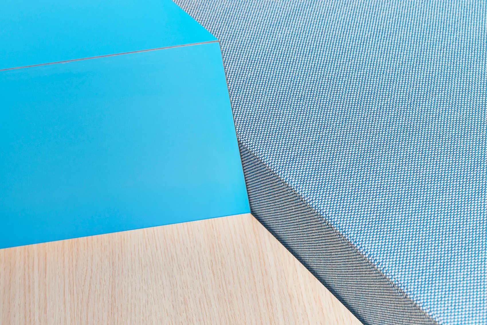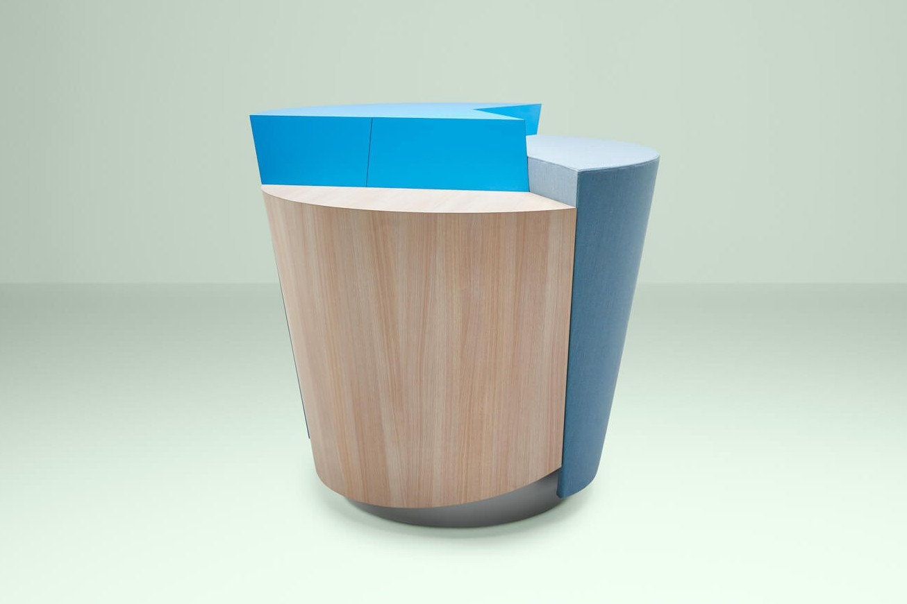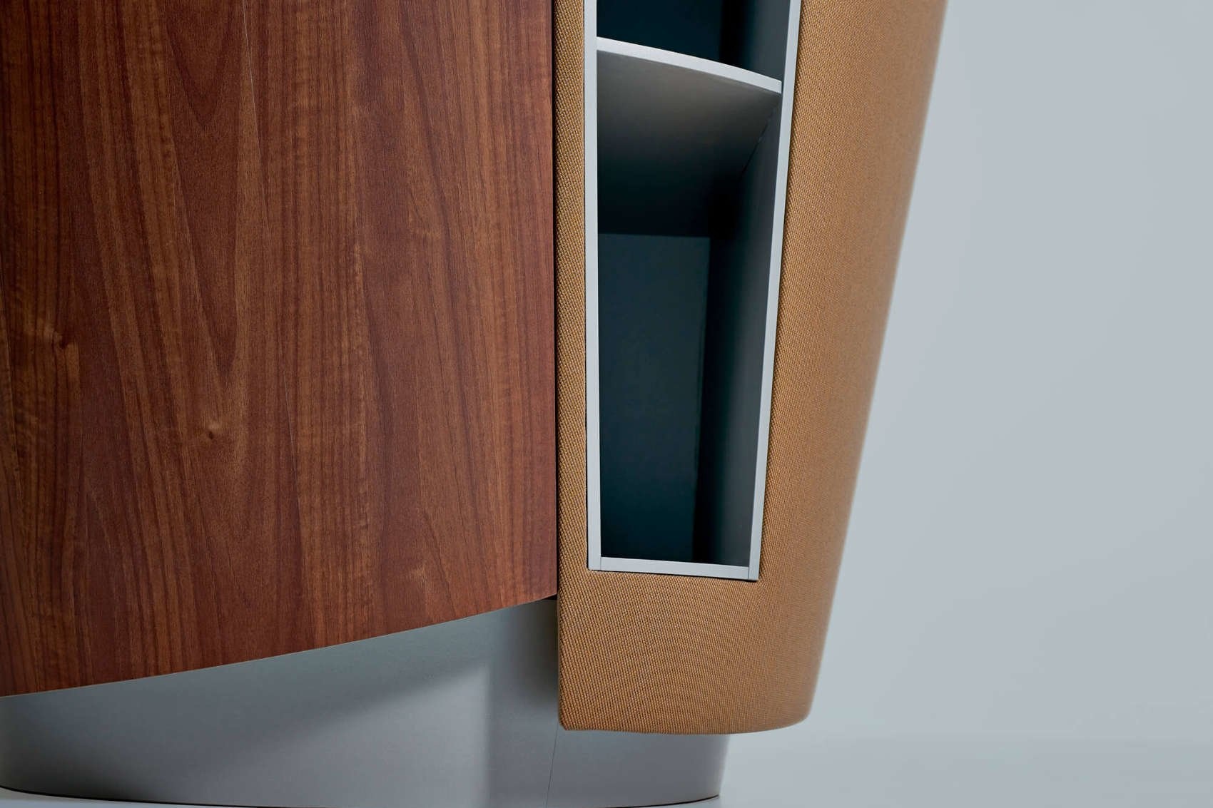 De StandTable is verdeeld in drie compartimenten met oppervlakken in verschillende materialen en hoogte. Het onderste gedeelte (96 cm) is afgewerkt in houtfineer, het middelste deel (104 cm) in Steelcut Trio-stof en het hoogste deel (114 cm) in laminaat. De basis (en optioneel de kast) is gelakt in RAL 9006.