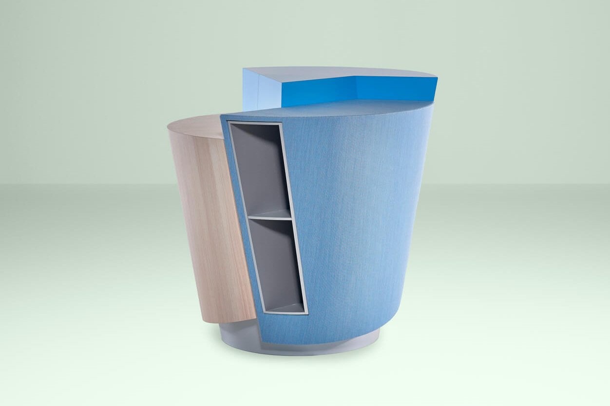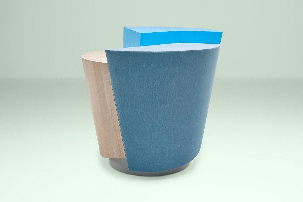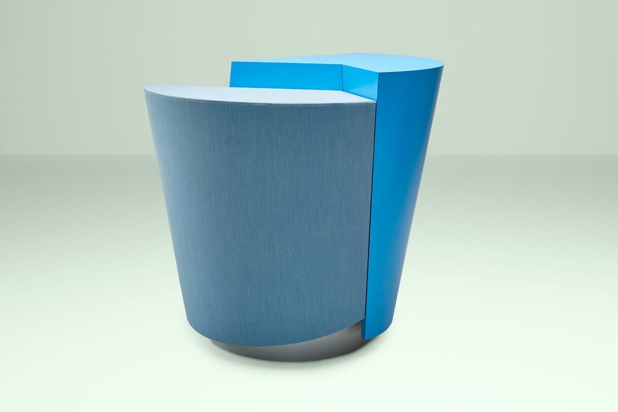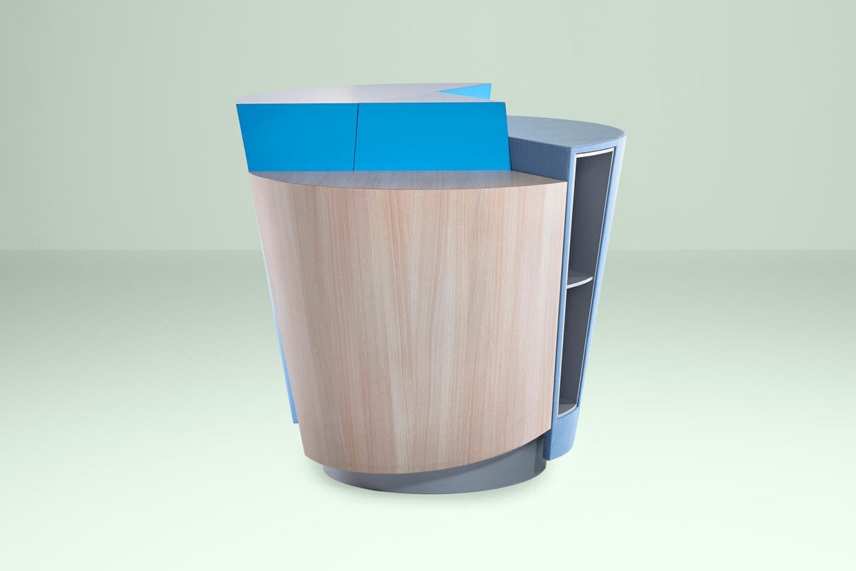 De StandTable is verdeeld in drie compartimenten met oppervlakken in verschillende materialen en hoogte. Het onderste gedeelte (96 cm) is afgewerkt in houtfineer, het middelste deel (104 cm) in Steelcut Trio-stof en het hoogste deel (114 cm) in laminaat. De basis (en optioneel de kast) is gelakt in RAL 9006.