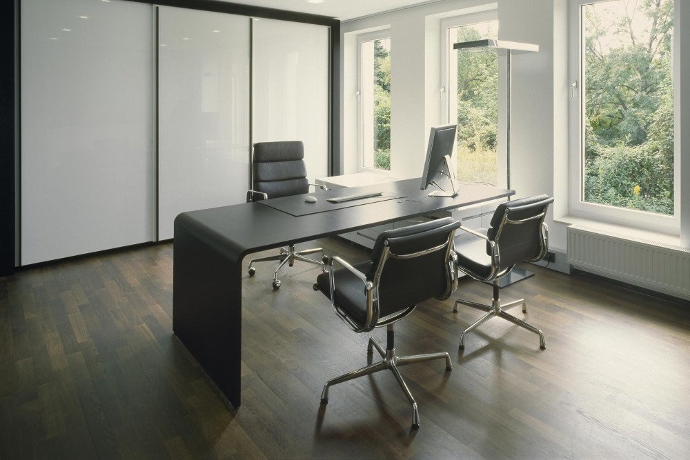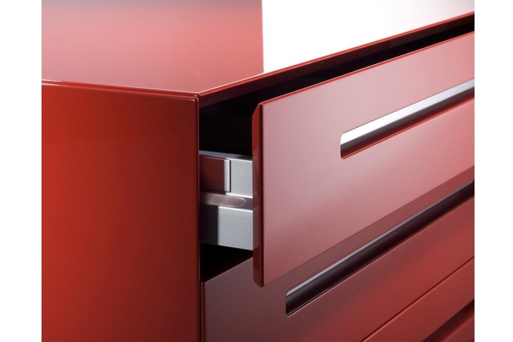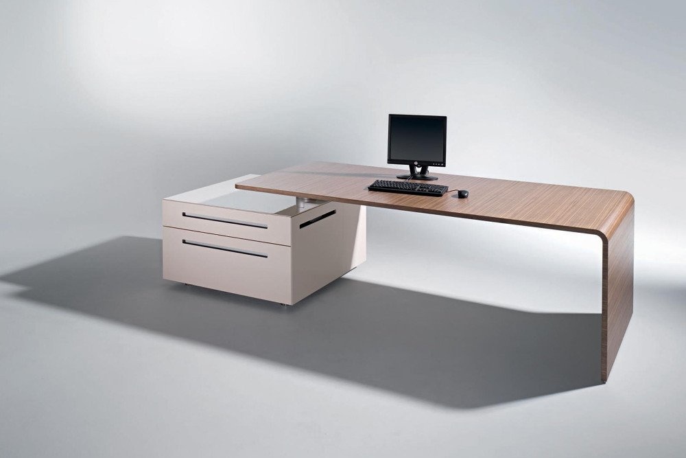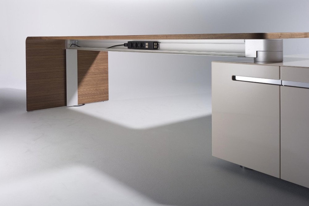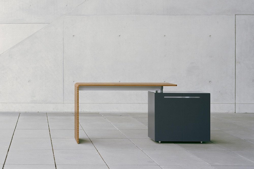 Een tafelprogramma en een modulair containersysteem met intelligente functies. Achter een deur met PC beugel en printerlade laten zich de technische onderdelen zinvol onderbrengen. De containers worden in verschillende hoogglans als ook matglans kleuren aangeboden. Ze kunnen individueel gecombineerd worden. De hoogwaardige fineerafwerkingen van Ahorn tot Zebrano donker gebeitst laten een bijzonder contrast zien.