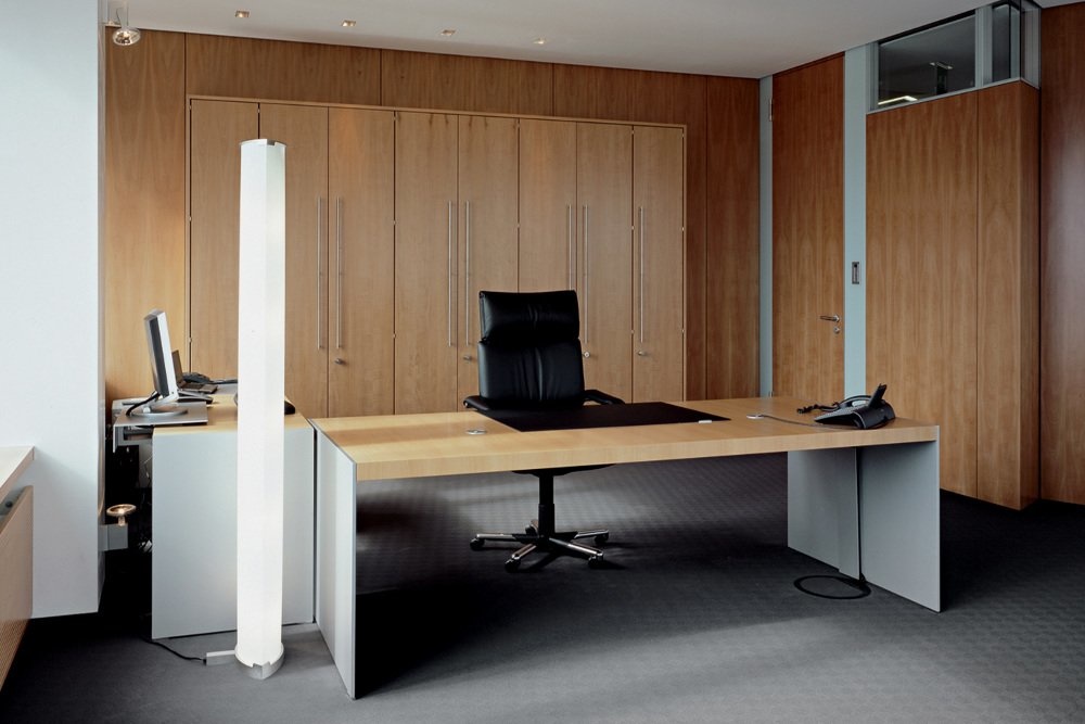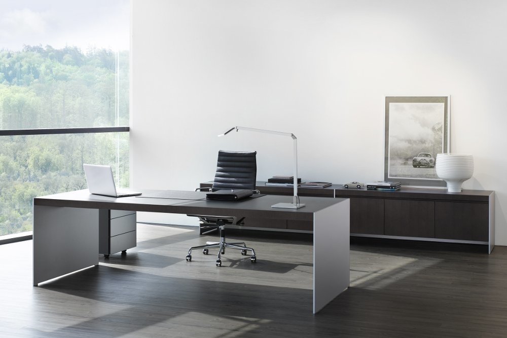 Renz Size - Minimalisme als principe. Dunne wangen en corpussen in verschillende uitvoeringen dragen met schijnbaar gemak een 60 mm dik tafelblad - een archaïsche vormgeving, die de behoefte naar rust en duidelijkheid in deze hectische wereld tegemoet komt. Eerste klasmaterialen zoals metallic-lak, speciaal uitgezochte houtsoorten maken een persoonlijke nuancering van uw directieruimte mogelijk. De uitgesproken kwaliteit wordt door de combinatie van materialen benadrukt. De wangen en de container in de kleuren Metallic aluzilver en Metallic alugrijs gelakkeerd.