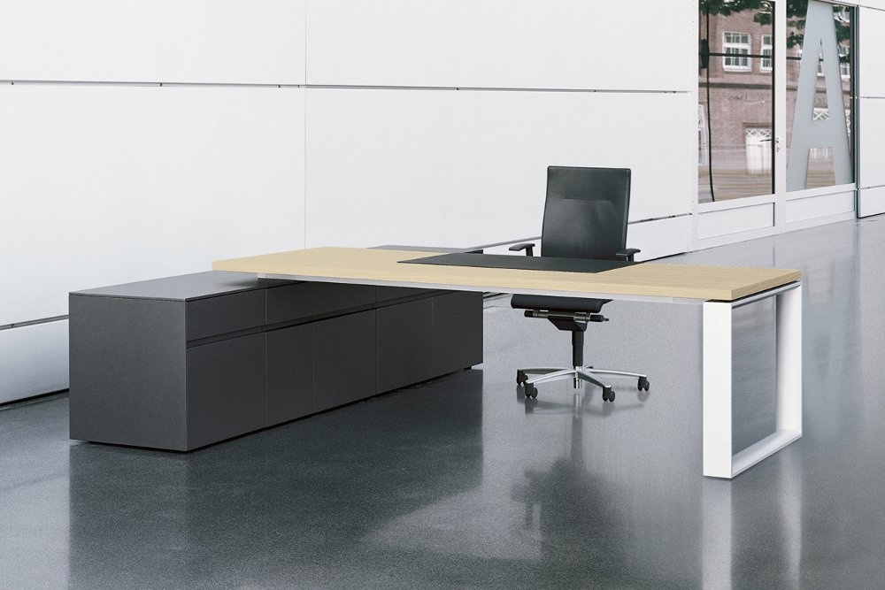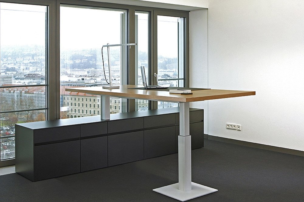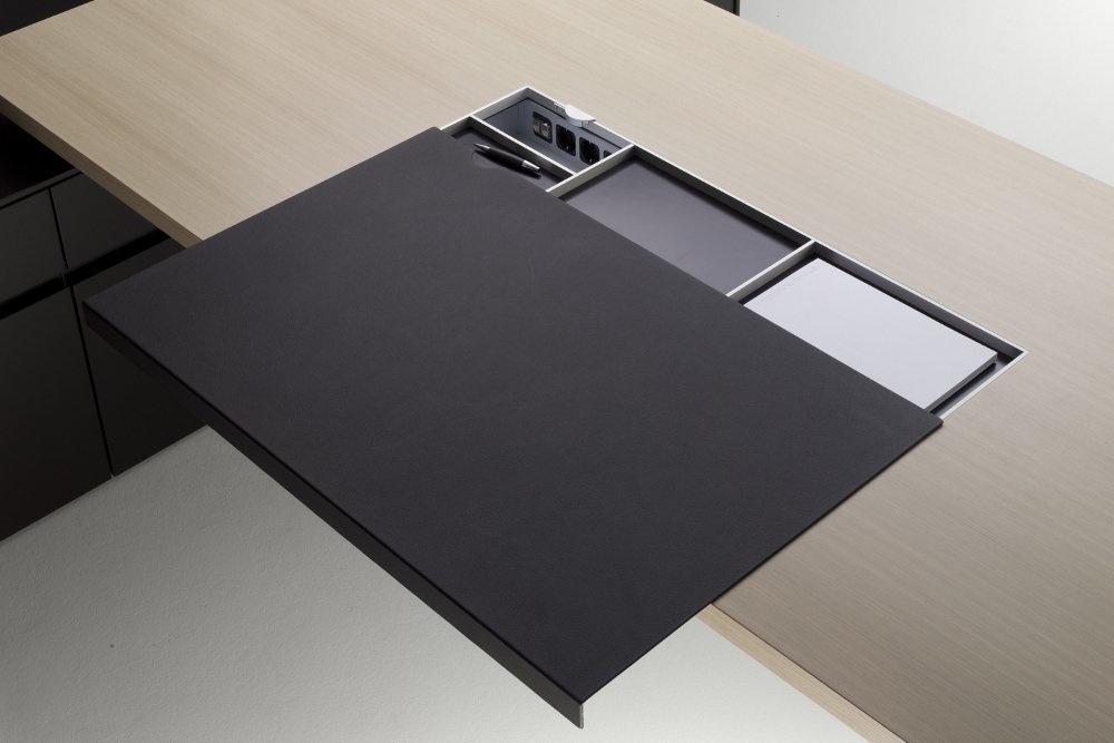 In contrast met de rechte en geometrische vormen van het sideboard staan de hoge afwerkingen van de tafelbladen. Uitvoeringen varieren van Ahorn tot Zebrano donker gebeitst of in glas. Rechthoekige frames uit aluminium geven de toon aan. Het bureaublad lijkt over het frame te zweven en geeft op deze manier lichtvoetigheid en transparantie aan. Door deze details staan de hoogwaardige materialen in de voorgrond. Een exclusieve verschuifbare lederinlay verdekt vakken die dan in tafelblad geintegreerd zijn. Afleg voor accessoires en aansluitingen voor stroom/data-telefonie behoren dan tot de mogelijkheden van Renz Sono.
