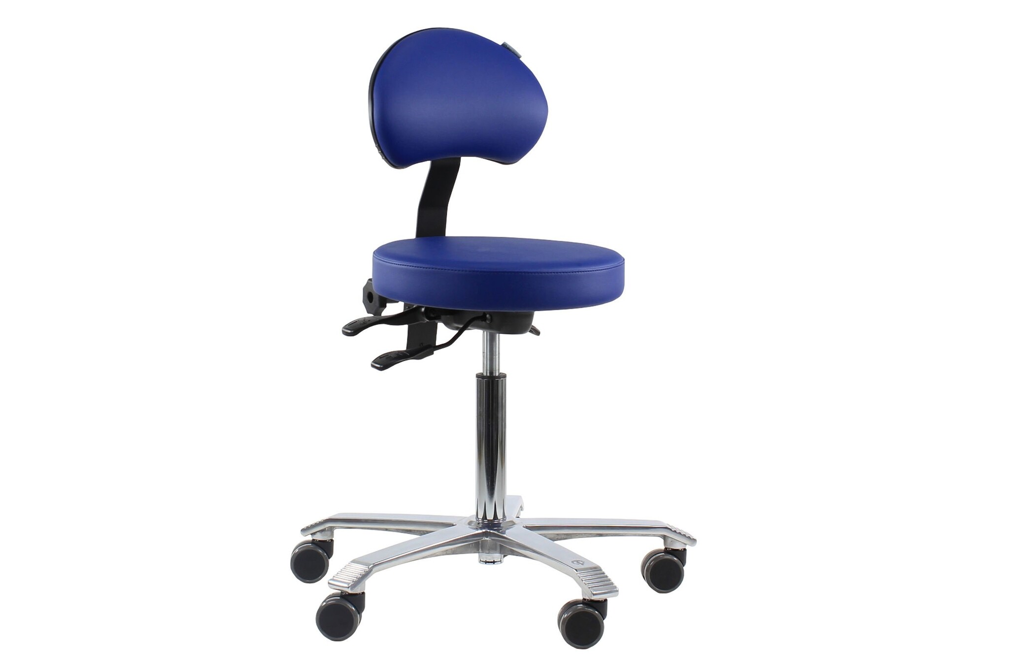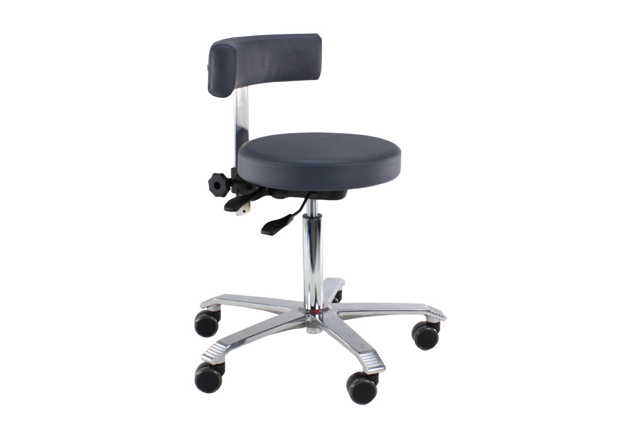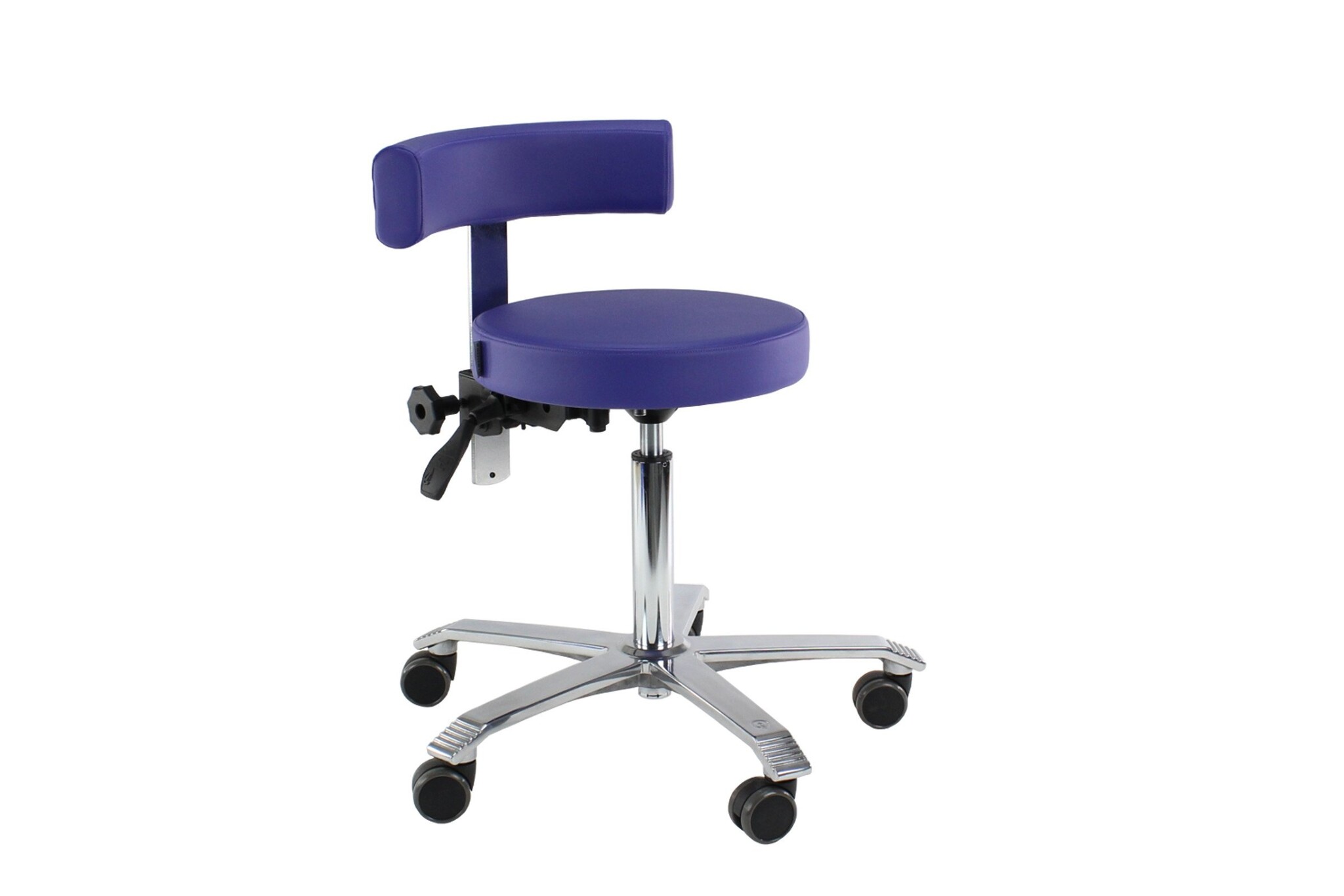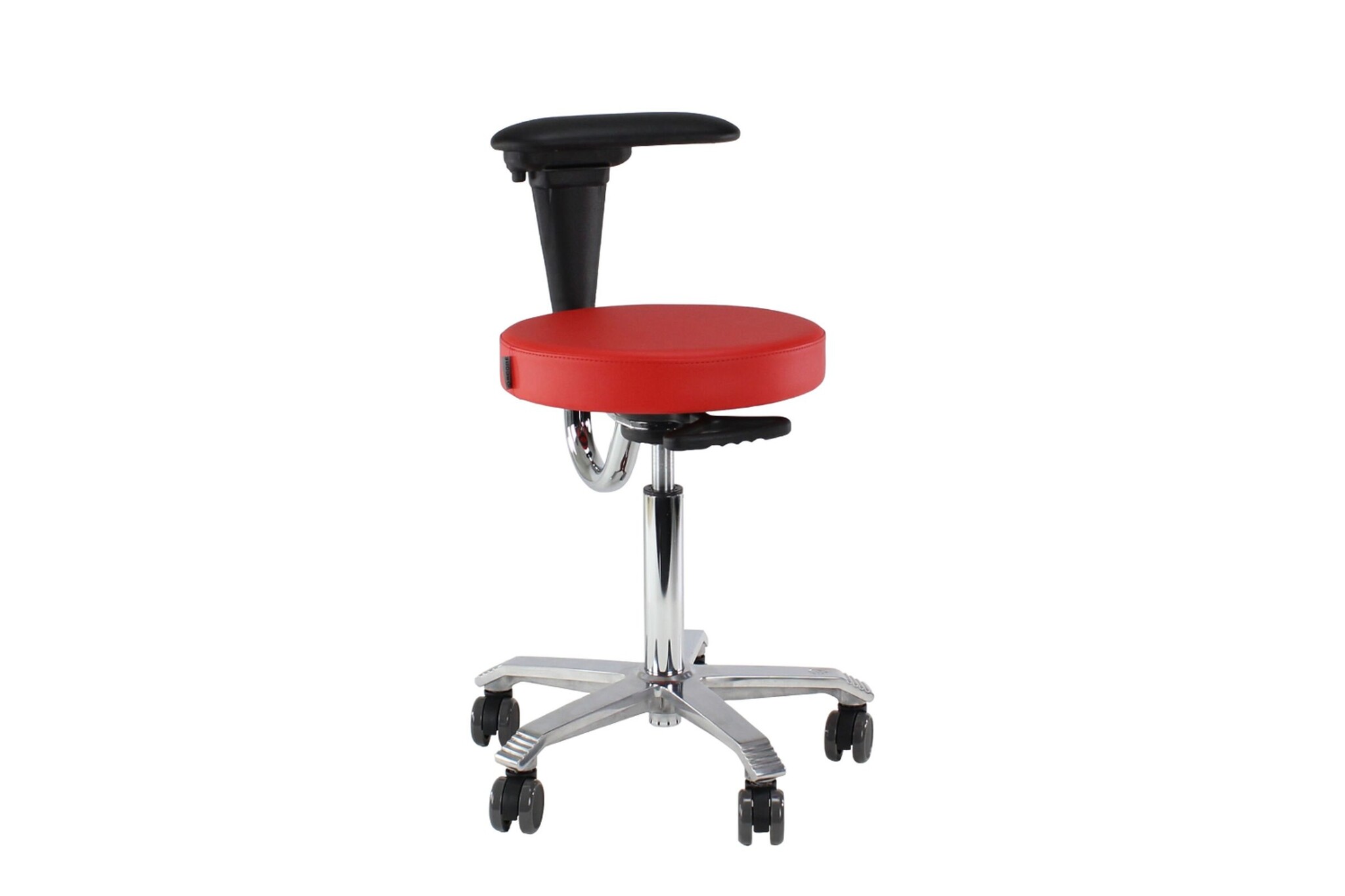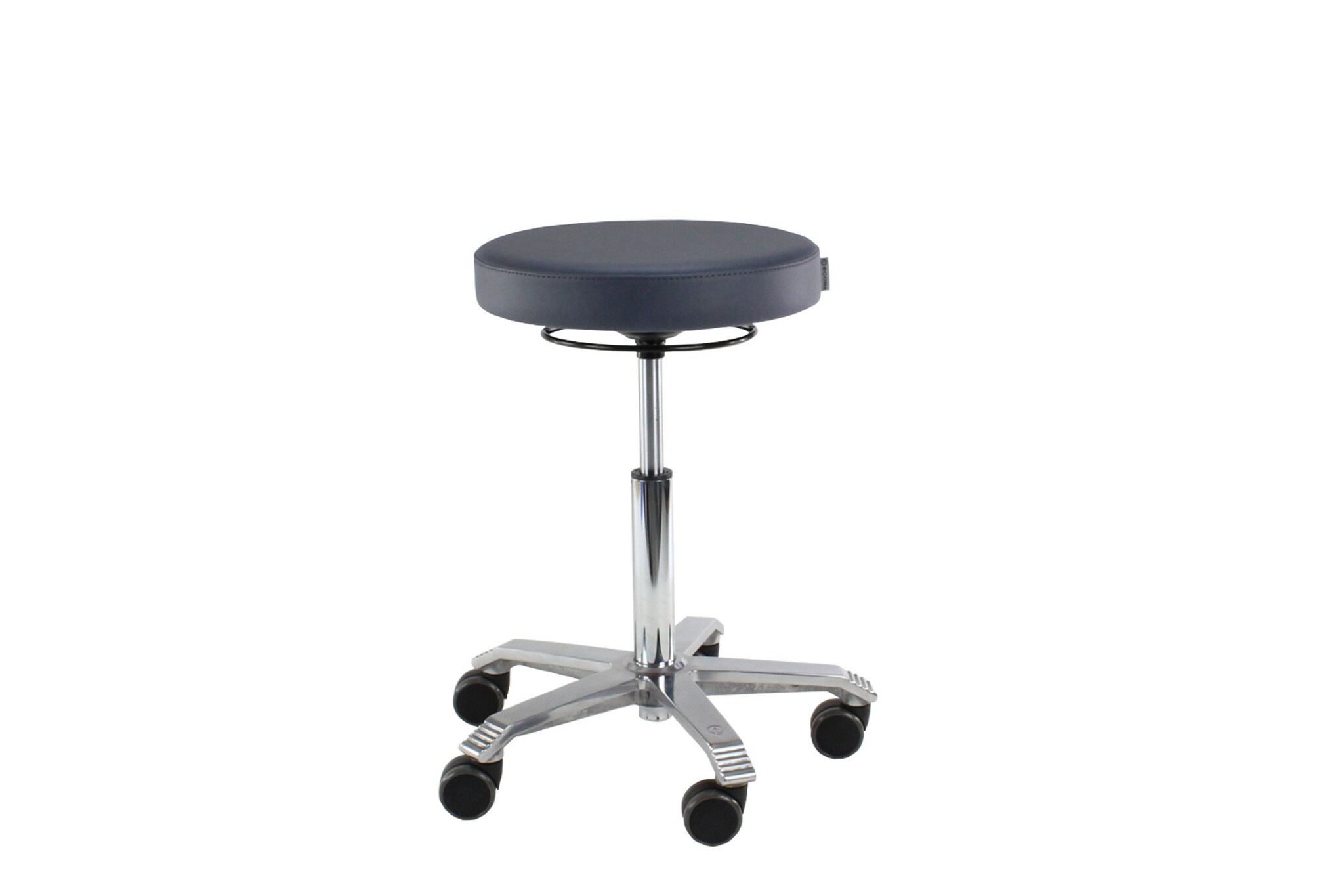 Score Medical -stoel met een ronde zitting (Ø 40 cm). De stoel is bekleed met het bacteriewerende stamskin dat tevens een antivuilbehandeling heeft ondergaan Stamskin is niet alleen urine-, bloe-, zweet-, en schimmelbestedig maar ook waterdicht. De Score Medical Line is speciaal ontwikkeld voor gebruik in ziekenhuizen, poliklinieken, dokterspraktijken, fysiotherapiepraktijken, etc. De Score Medical Line is veelal voorzien van speciale armleggers en speciale rugleuningen. De Score Medical Line is te leveren met voetbediening voor situaties waarin men bijvoorbeeld de handen vrij moet houden vanwege steriele redenen. Als bekleding kan men kiezen voor Stamskin met bacteriewerende eigenschappen; waterdicht, urinebestendig en vlamwerend.De 6200 modellen zijn voorzien van een vlakke zitting, de 6300 modellen van een ergoshape zitting met uithollingen ter vermindering van drukpunten in de dijen.