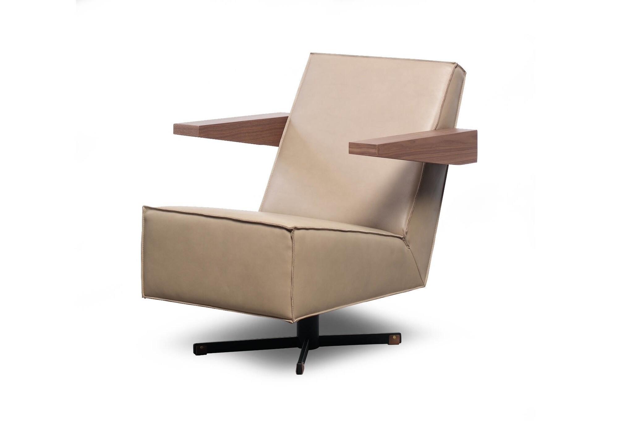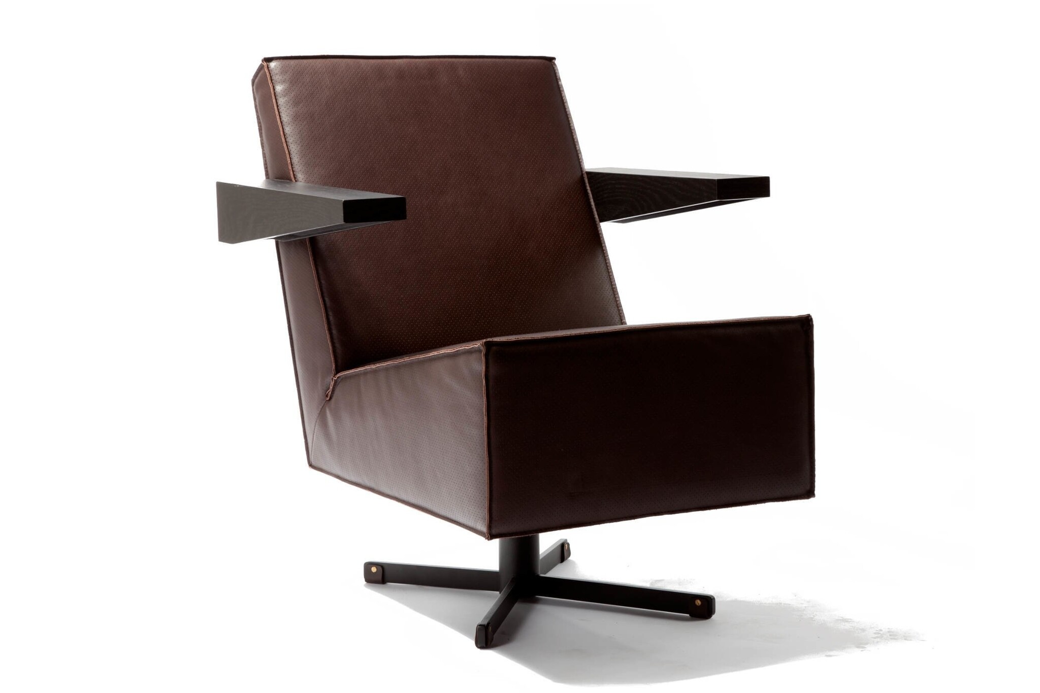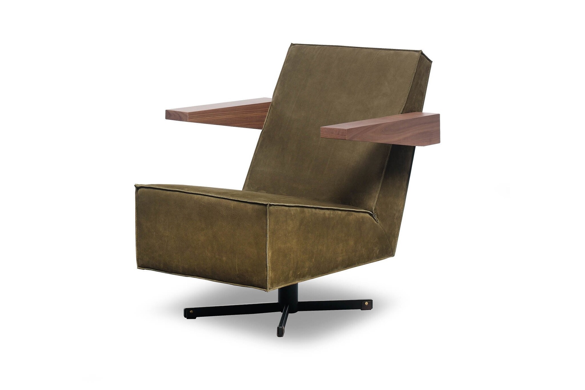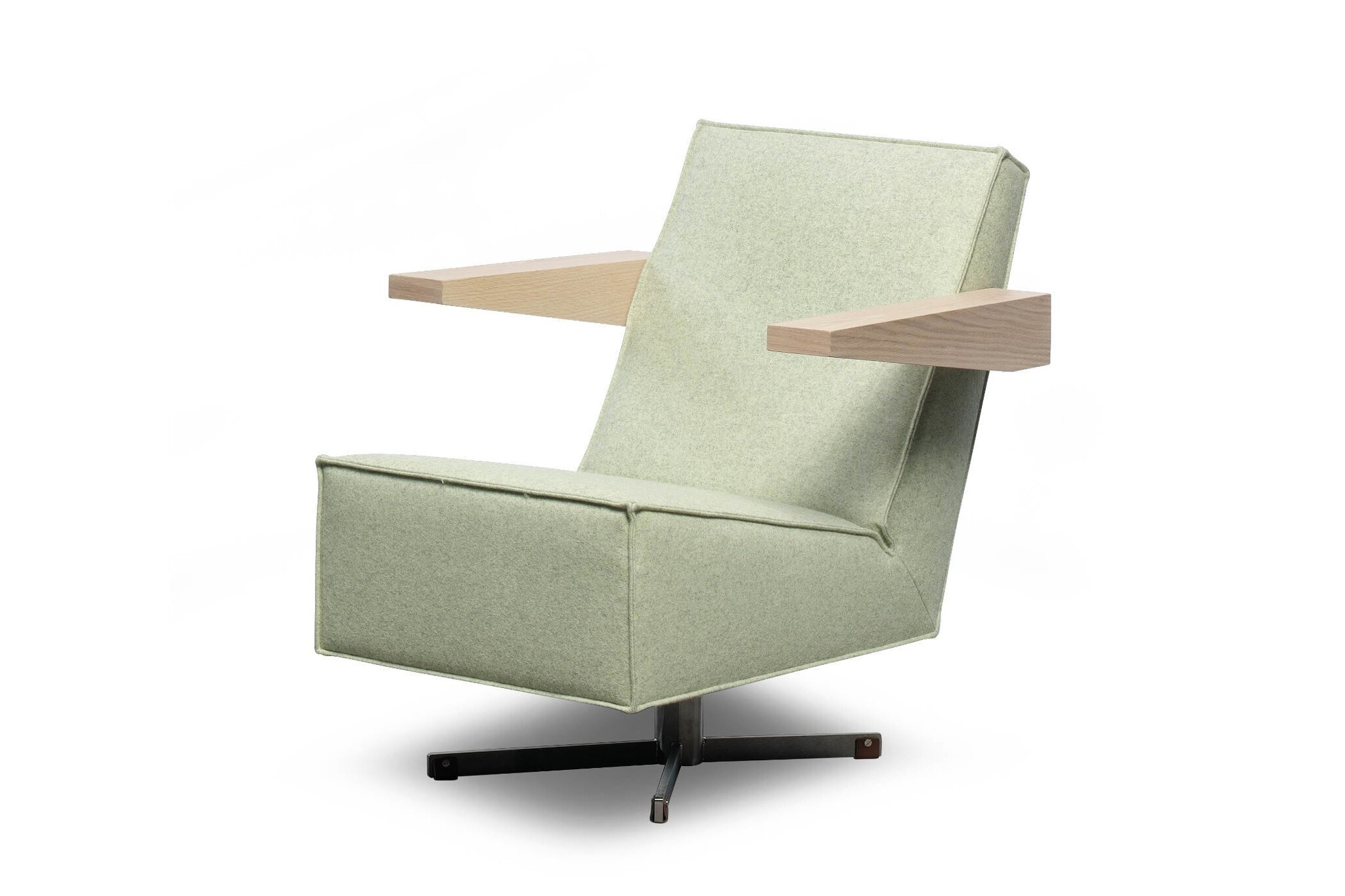 De Press Room Chair is leverbaar in een gestoffeerde en een leren uitvoering. De bijzondere afwerking van de stiknaden accentueert de strakke, heldere vlakverdeling van de fauteuil, die bovendien in de brede, houten armleggers terug komt.