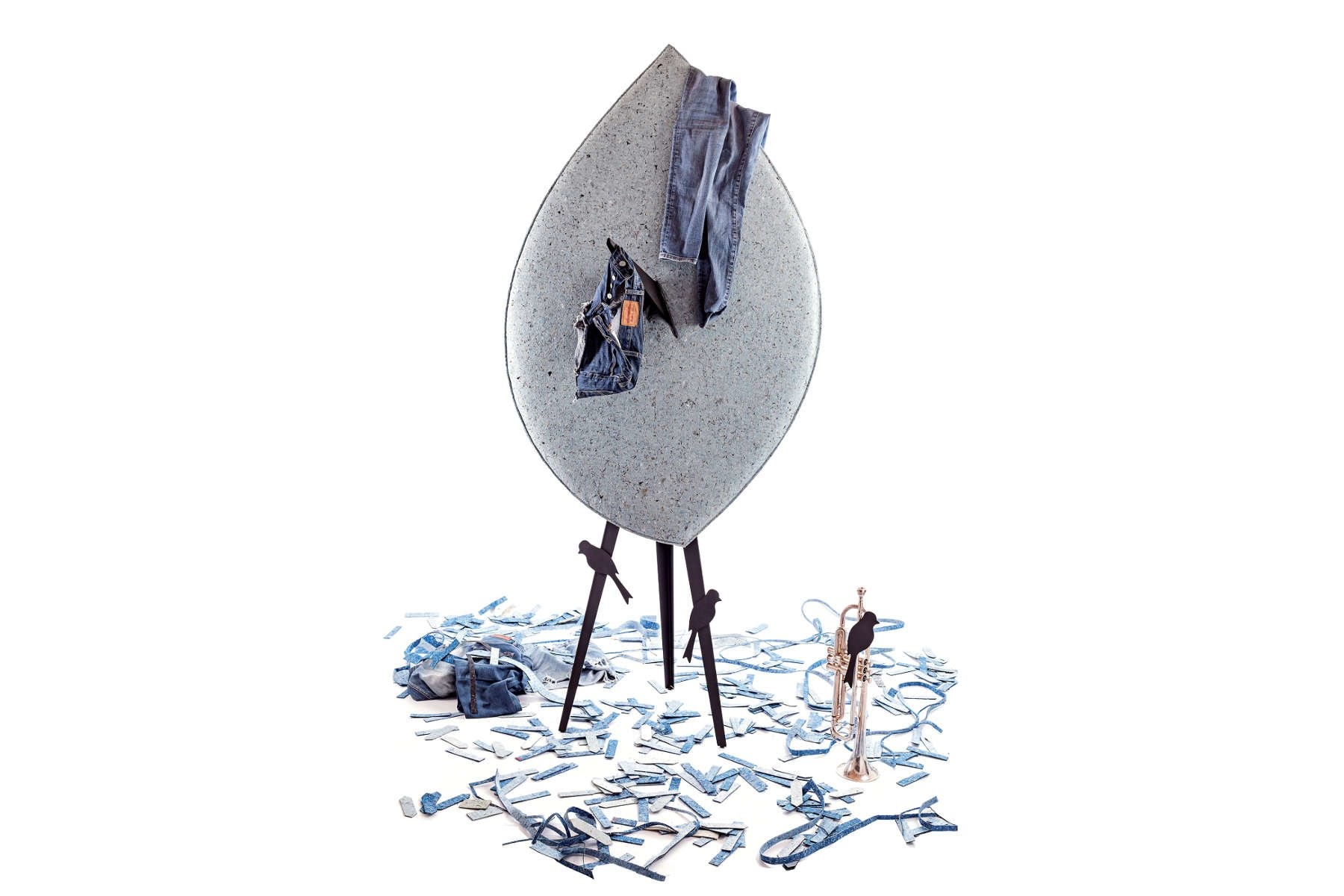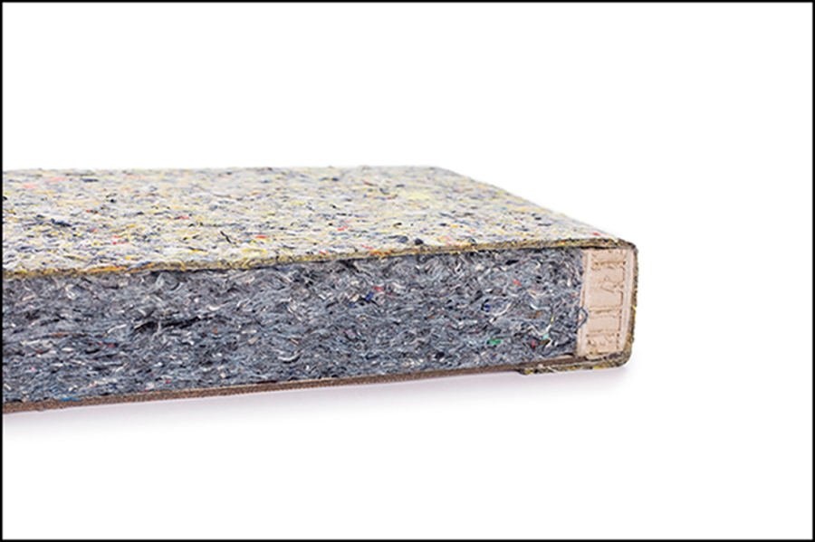Het blad is gemaakt van vilt van gerecycled textiel. De binnenzijde hiervan is gevuld met hardgeperste oude spijkerbroeken zodat het geluid goed wordt gedempt. Het blad is tevens gemaakt uit Ecor.