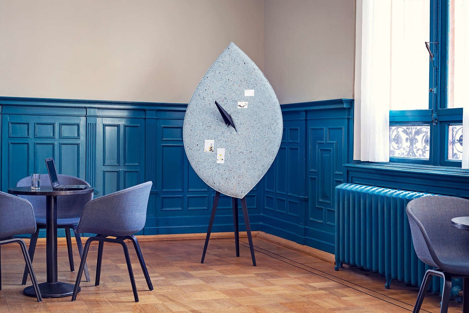 Dit akoestische scherm is multifunctioneel. Het dempt geluid, maar is daarnaast ook als prikbord, kapstok en magnetisch frame (vogelmagneten) te gebruiken.