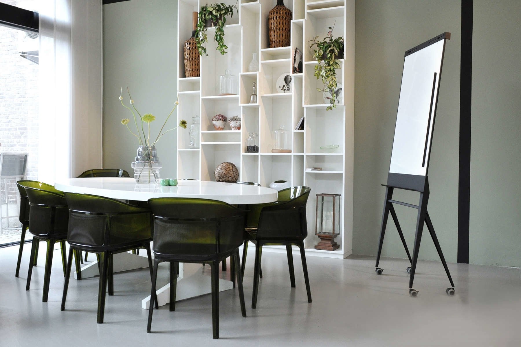 Extra mobiel is dit design bord wanneer deze is voorzien met zwenkwielen, die altijd erop en eraf te draaien zijn.