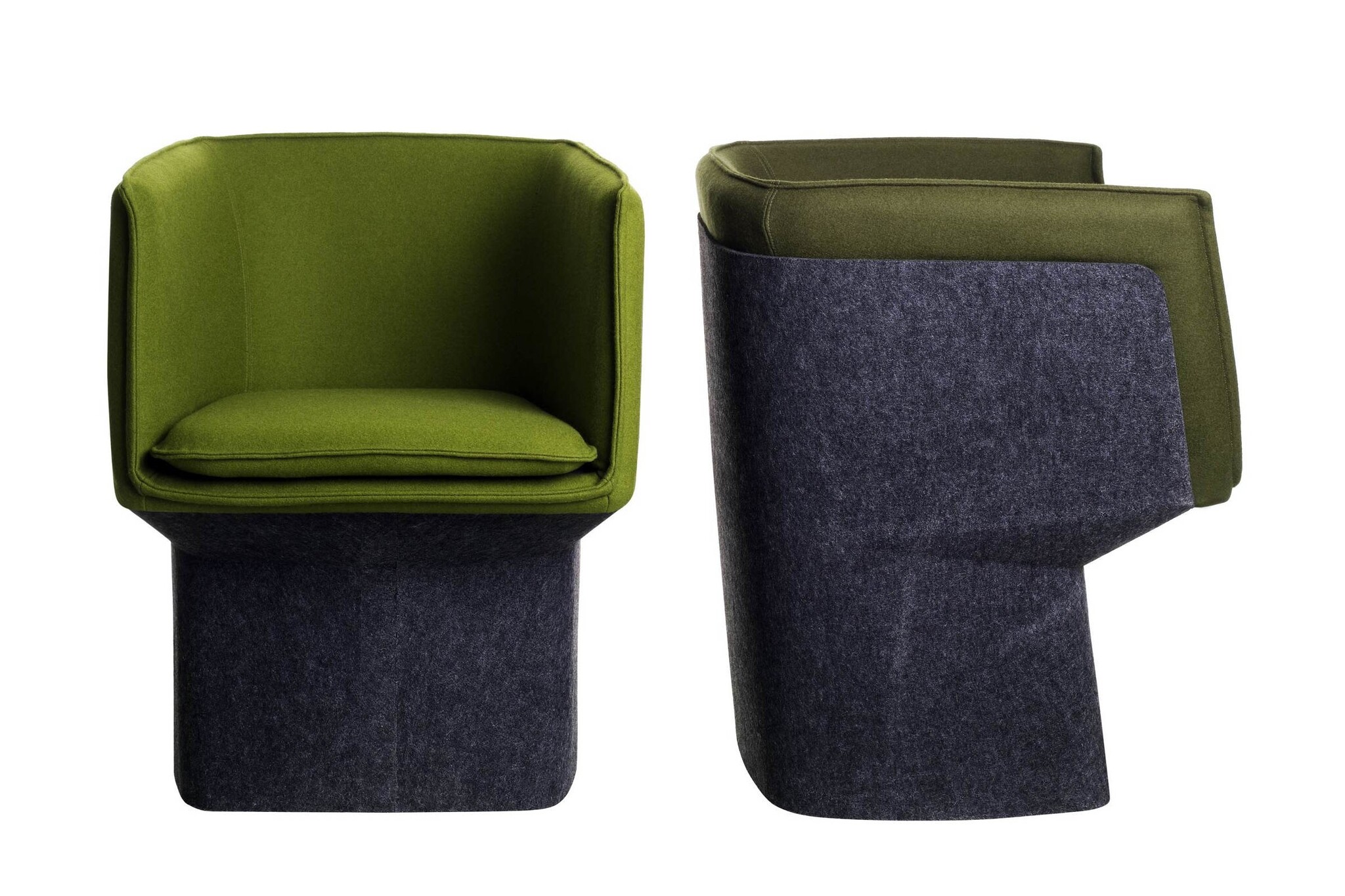 Gebruikt materiaal: Frame is van gelamineerd hout fineer. Zitting en de binnenkant rug is bekleed met stof of leder, buiten in gerecycled polyester.