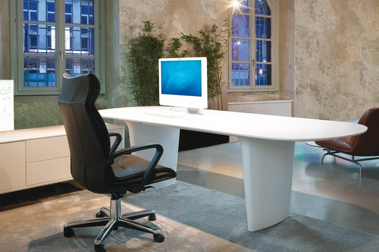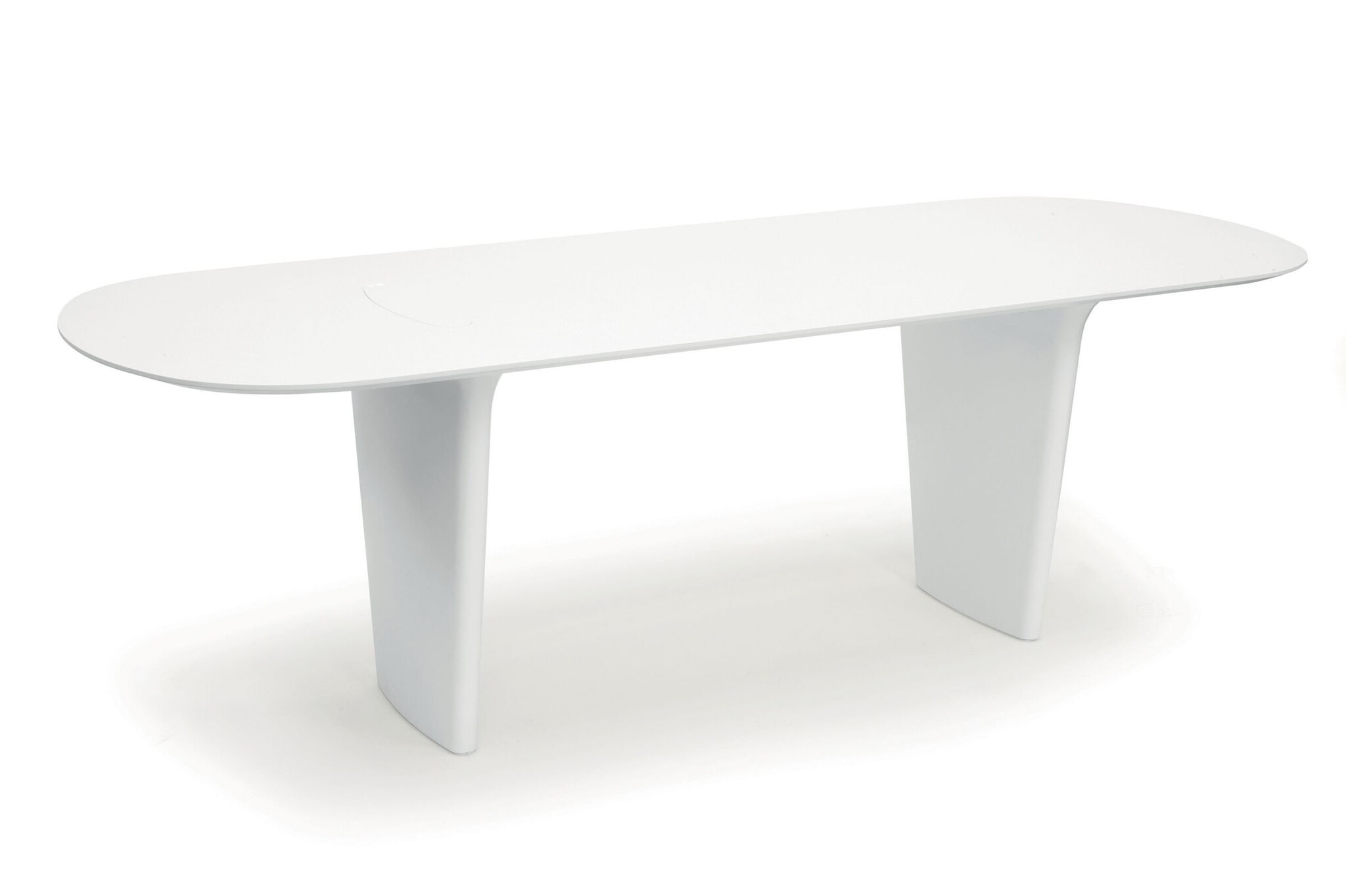 De tafel | bureau met de afmetingen 240 x 95 cm en hoogte 75 cm heeft een eenvoudige, ovale vorm, het is duidelijk ontworpen voor veelzijdigheid. Elektrische kabels lopen via kabelgoten in de slanke benen.