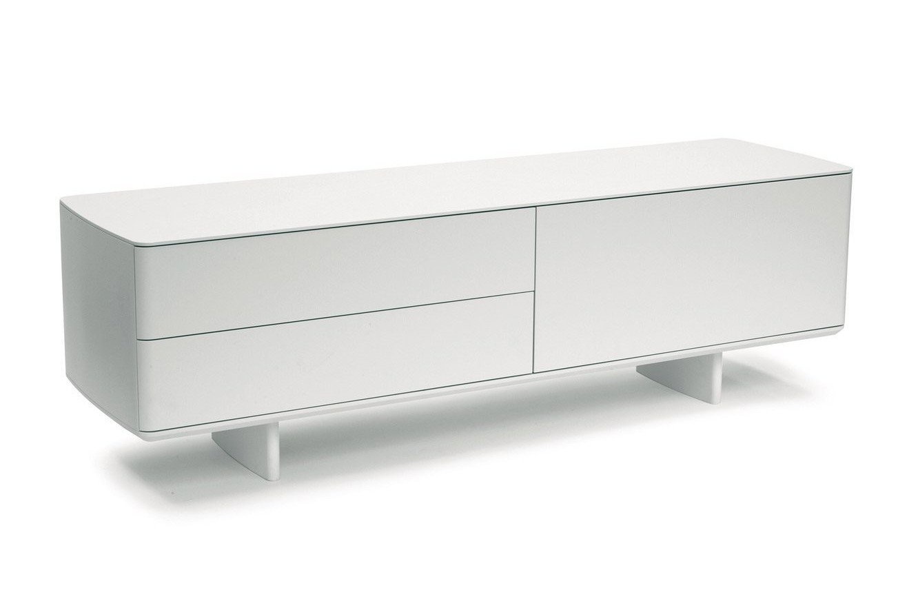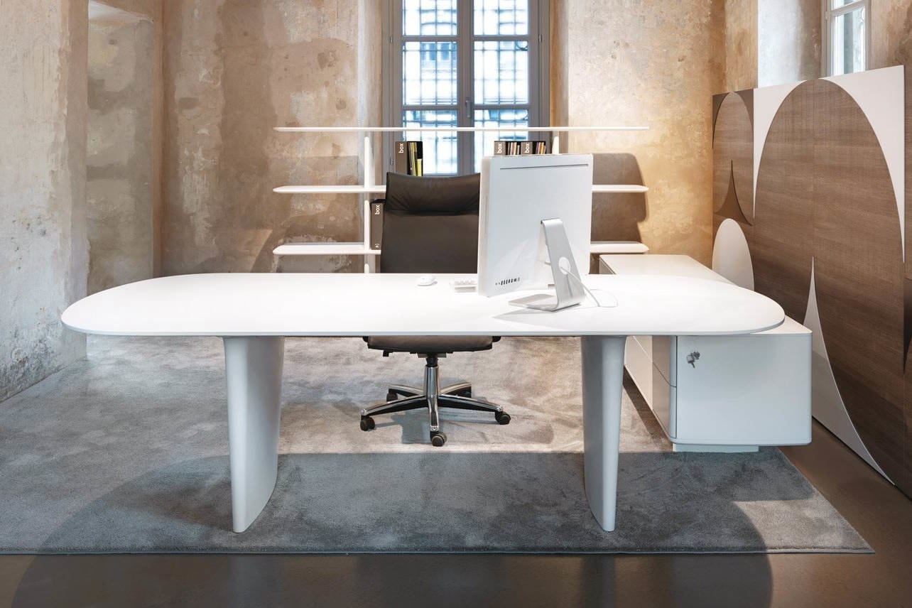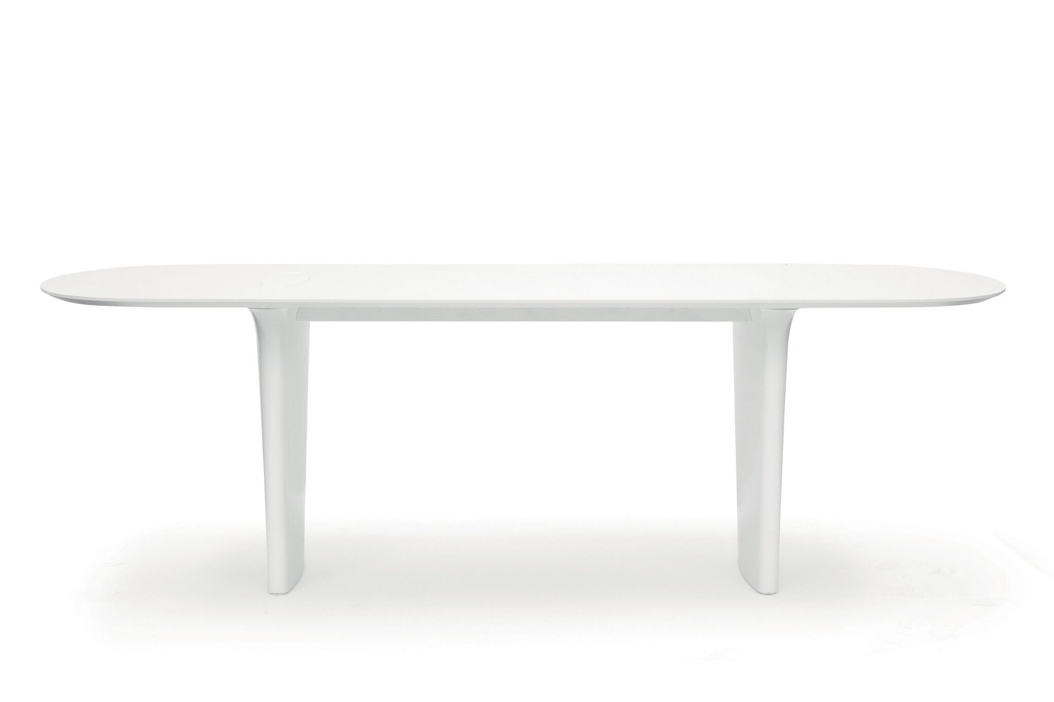 De tafelbladen hebben elegante afgeronde hoeken en zelfs de onderkant is afgewerkt in mat wit gelakt. De bases zijn in Cristalplant® en zijn ook afgewerkt in mat wit.