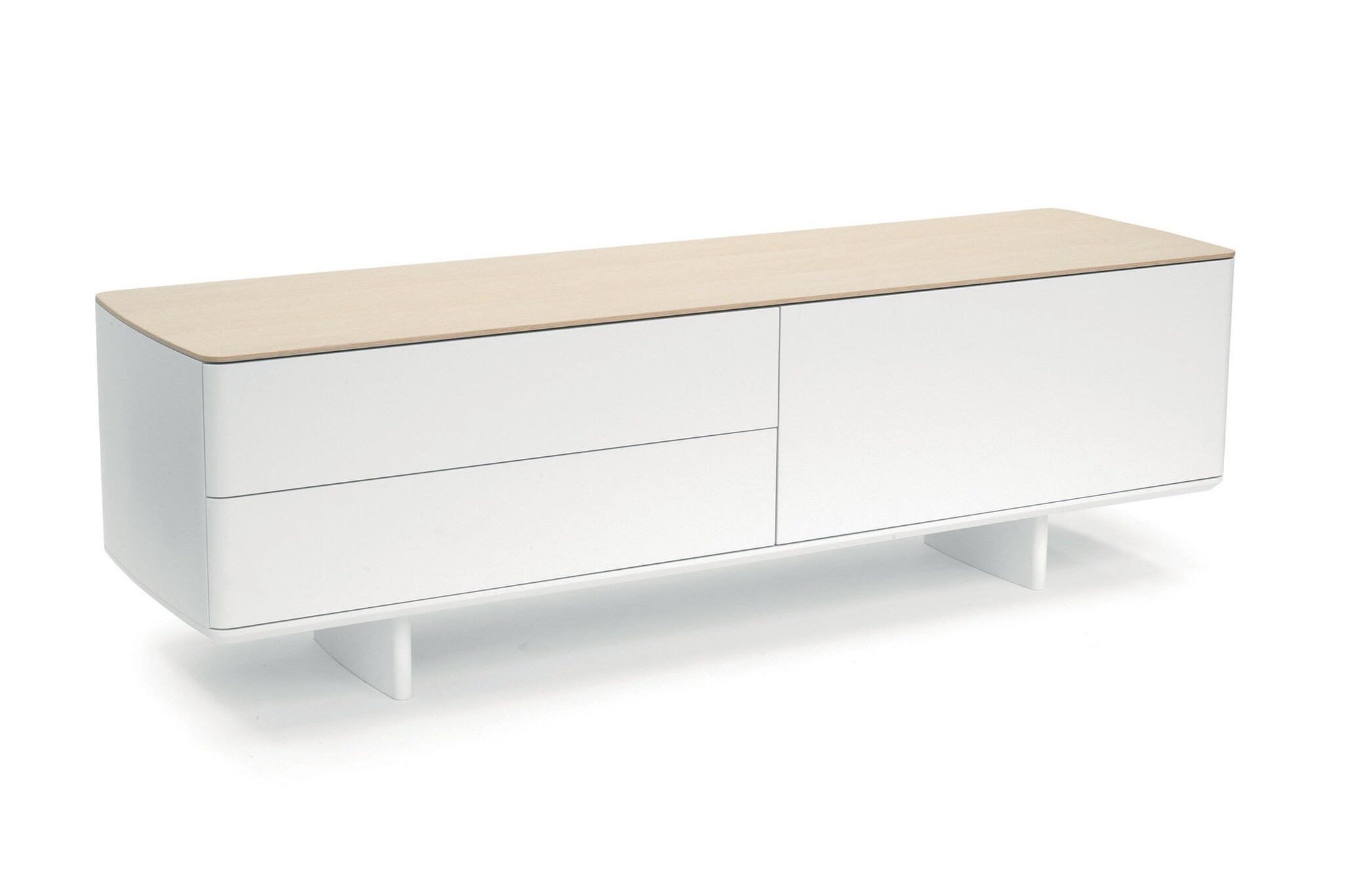 De Tecno Shift kast, met de afmetingen 190 x 53 cm en hoogte 59 cm wordt gekenmerkt door strakke lijnen en deelt dezelfde krachtige, expressieve vormen zoals de tafel. De kast is verkrijgbaar in vier versies:
