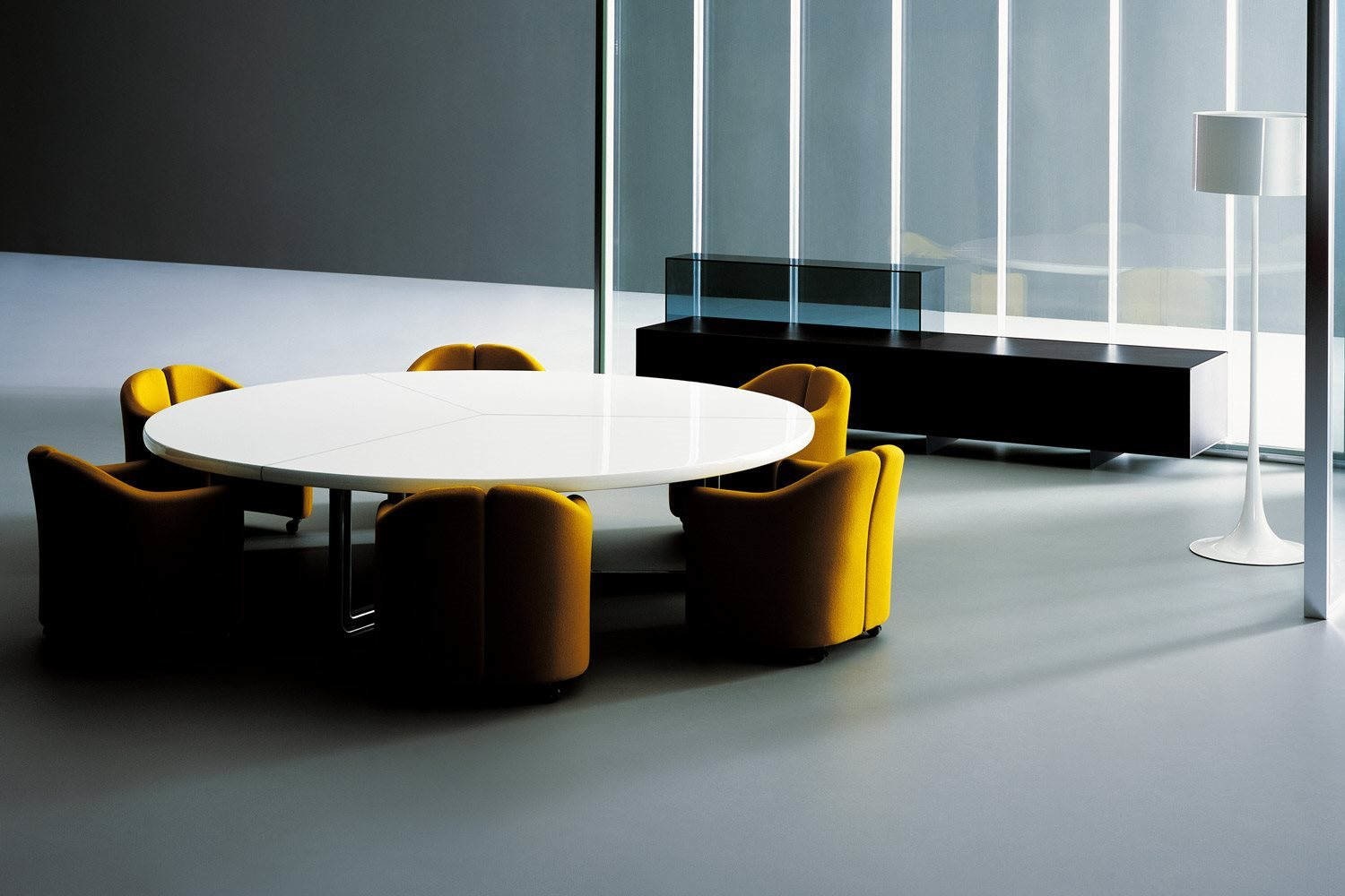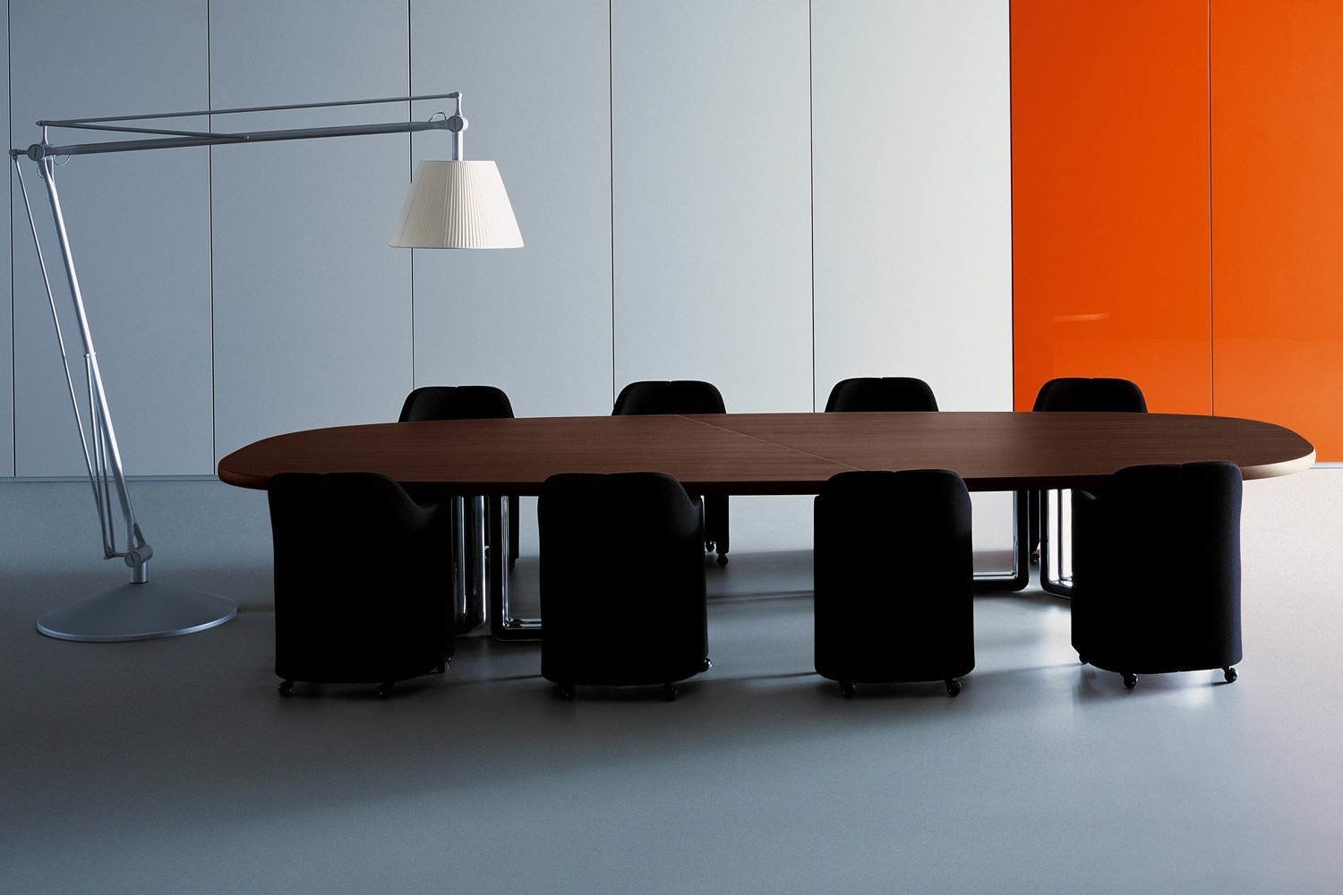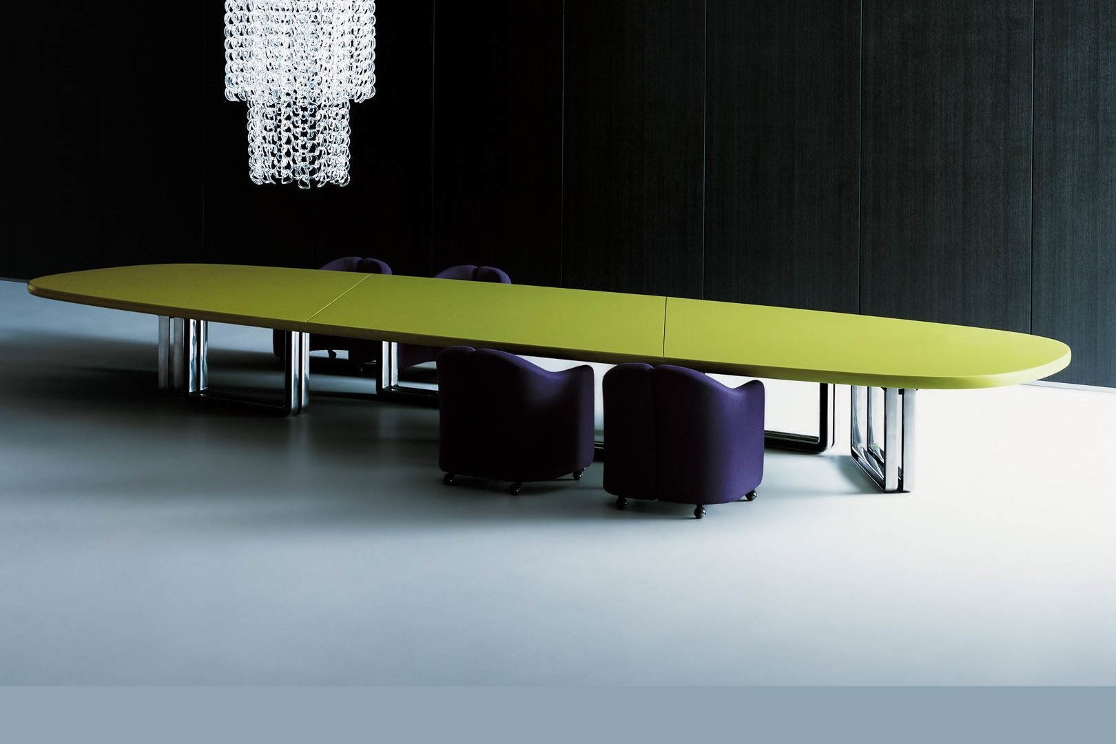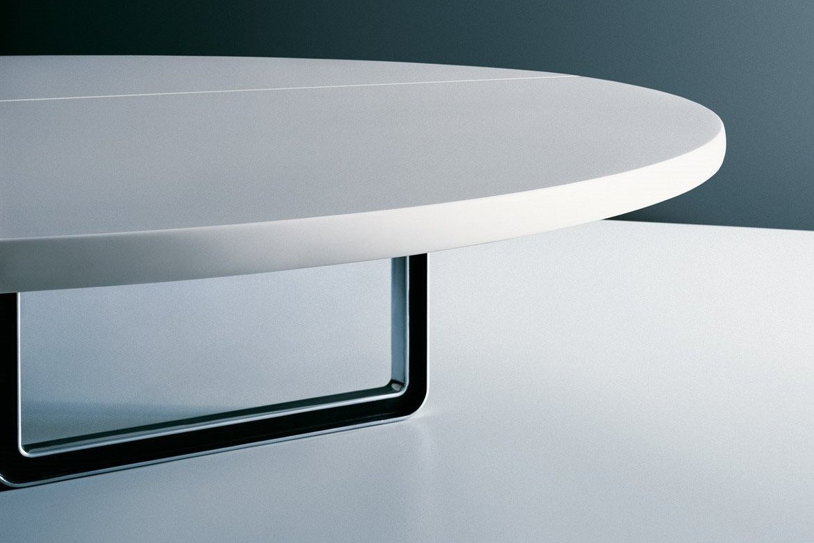 De tafelbladen zijn cirkelvormig of langwerpig van vorm met afgeronde hoeken. De langere tafels zijn geschikt voor gebruik als grote vergadertafels.