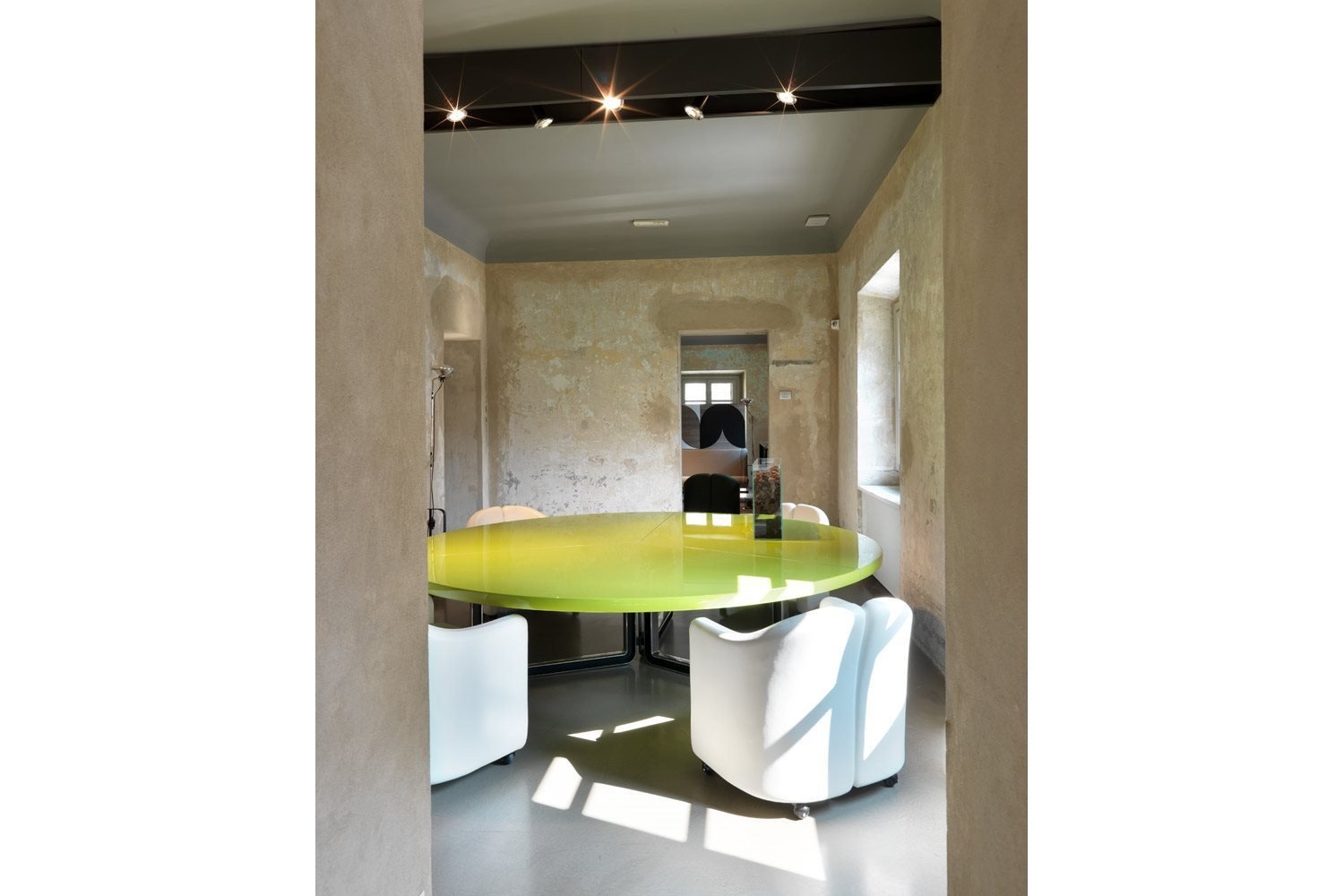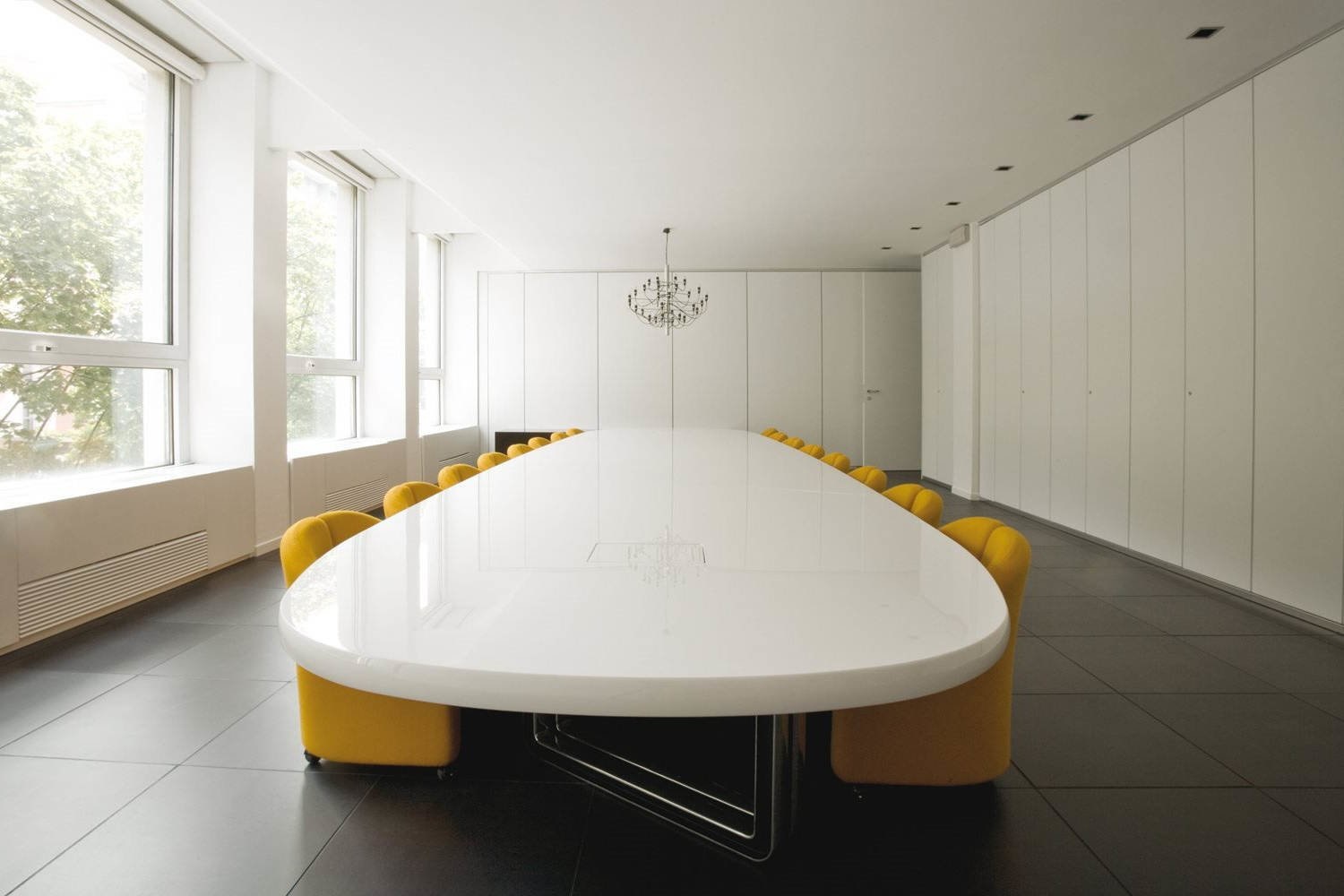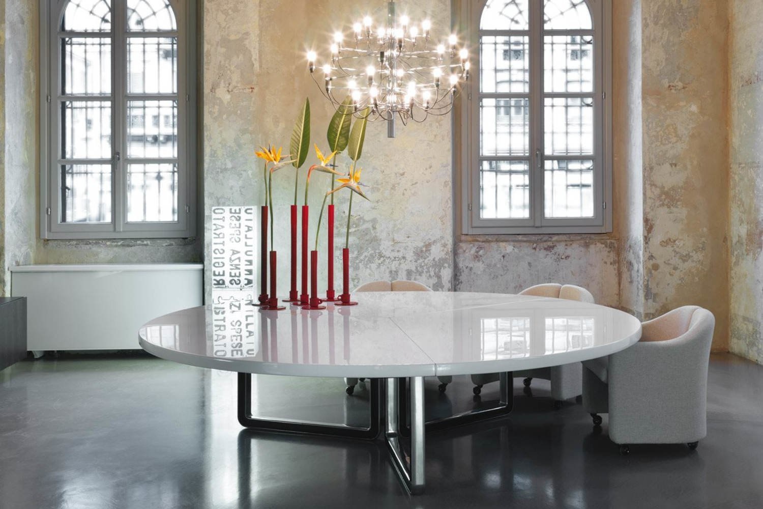De tafelbladen zijn cirkelvormig of langwerpig van vorm met afgeronde hoeken. De langere tafels zijn geschikt voor gebruik als grote vergadertafels.