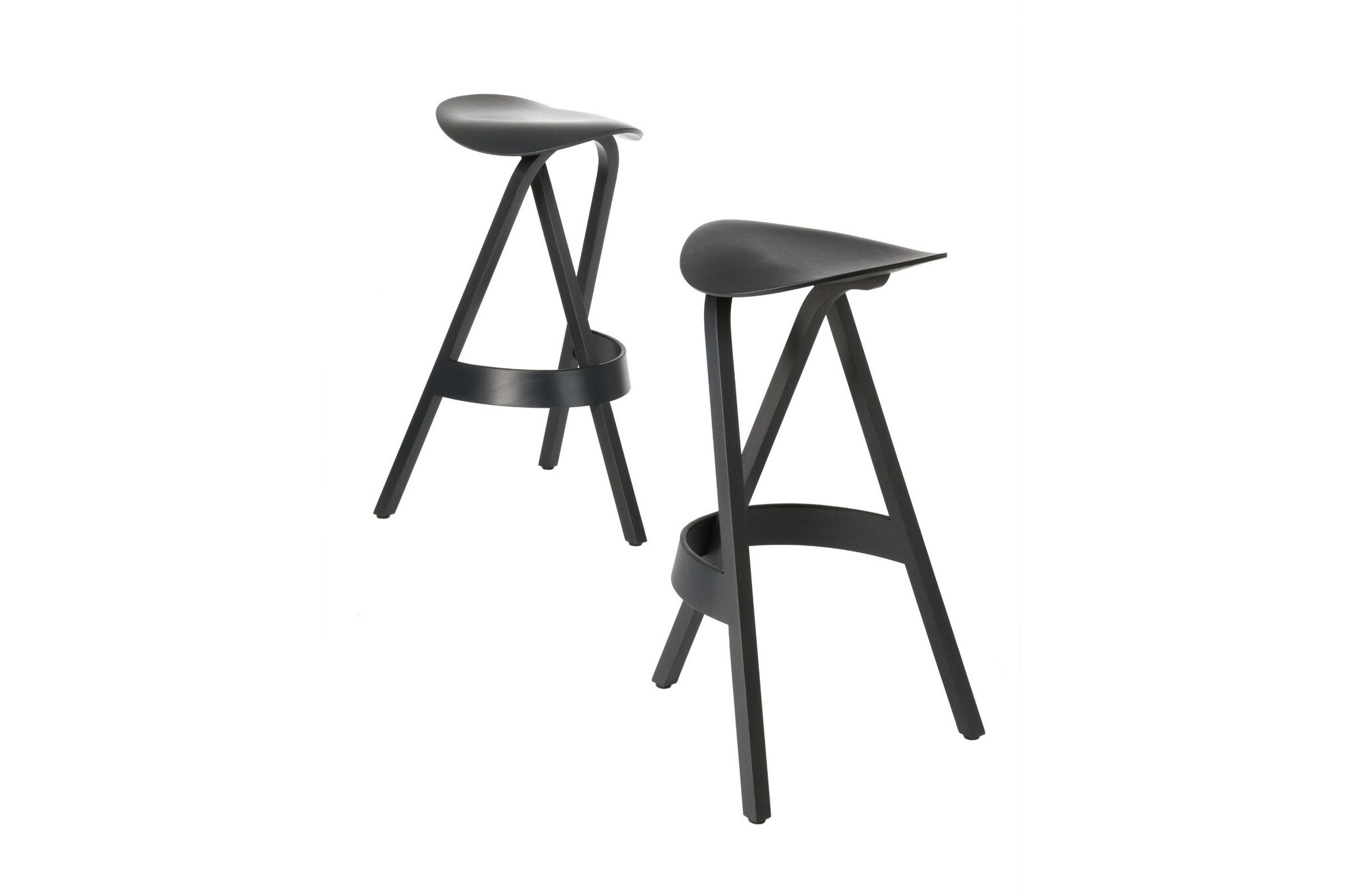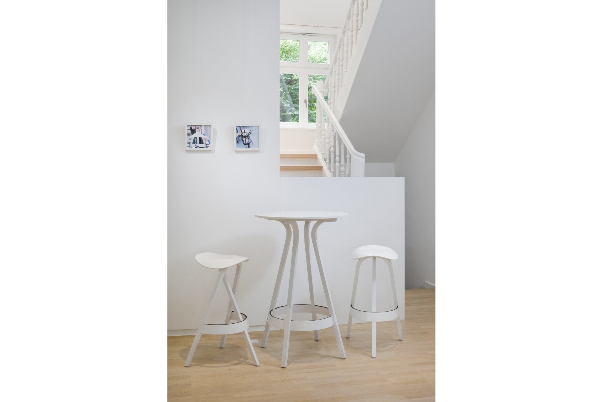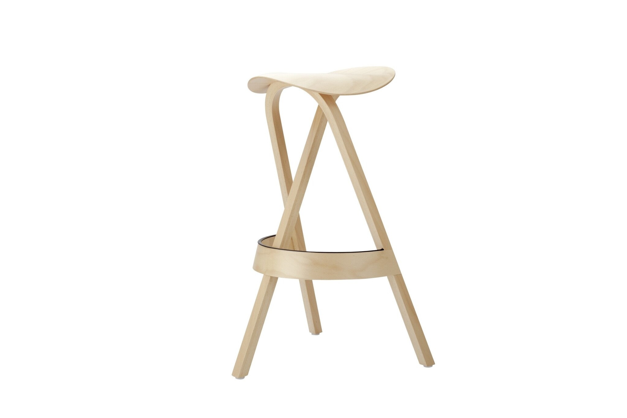 Thonet 404 H houten Thonet barkruk met 3-poots onderstel. Frame beuken gelamineerd, voetsteun voorzien van zwarte rubberen beschermstrip. Uitvoering gebeitst of gelakt beuken. Zithoogte 77 cm.