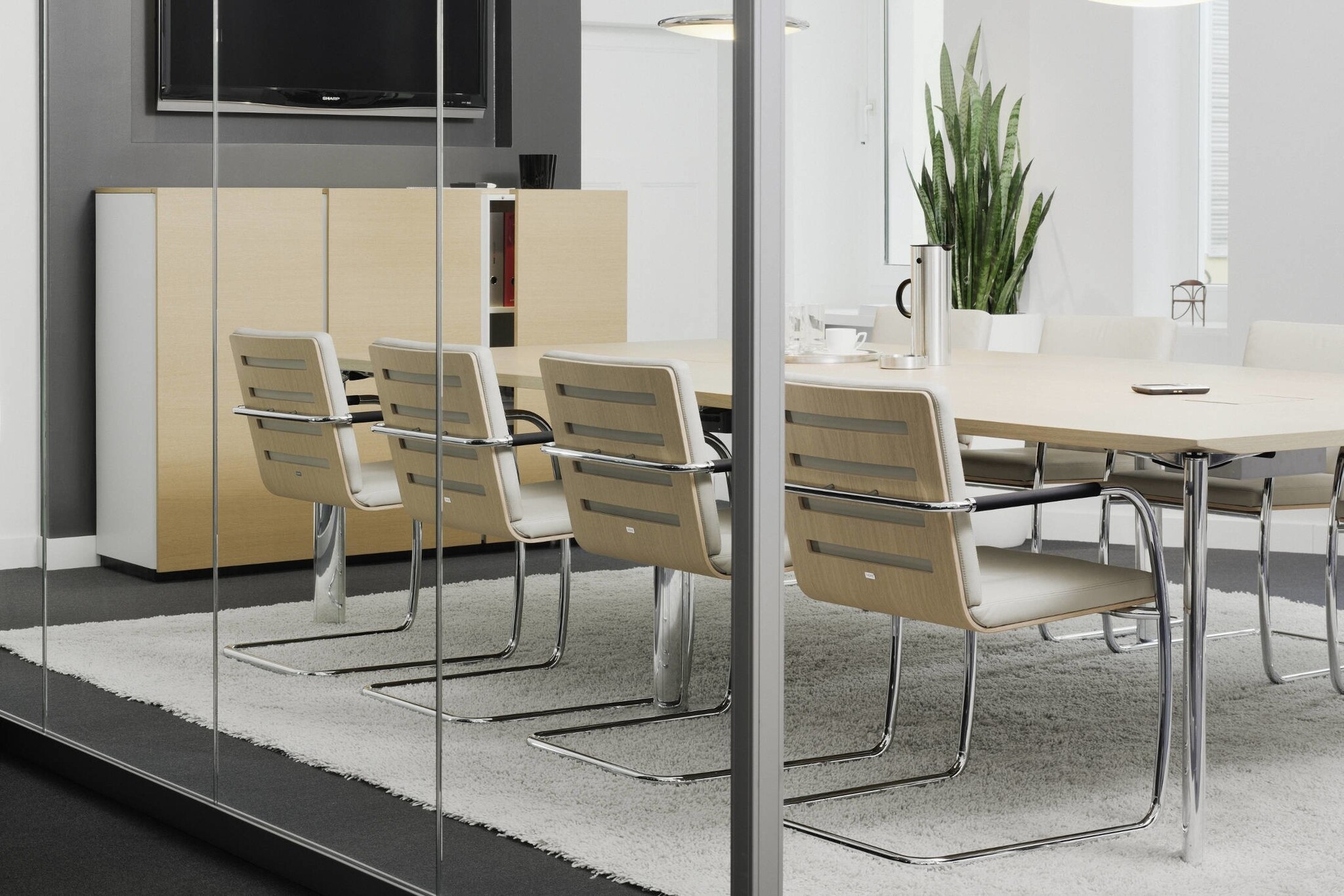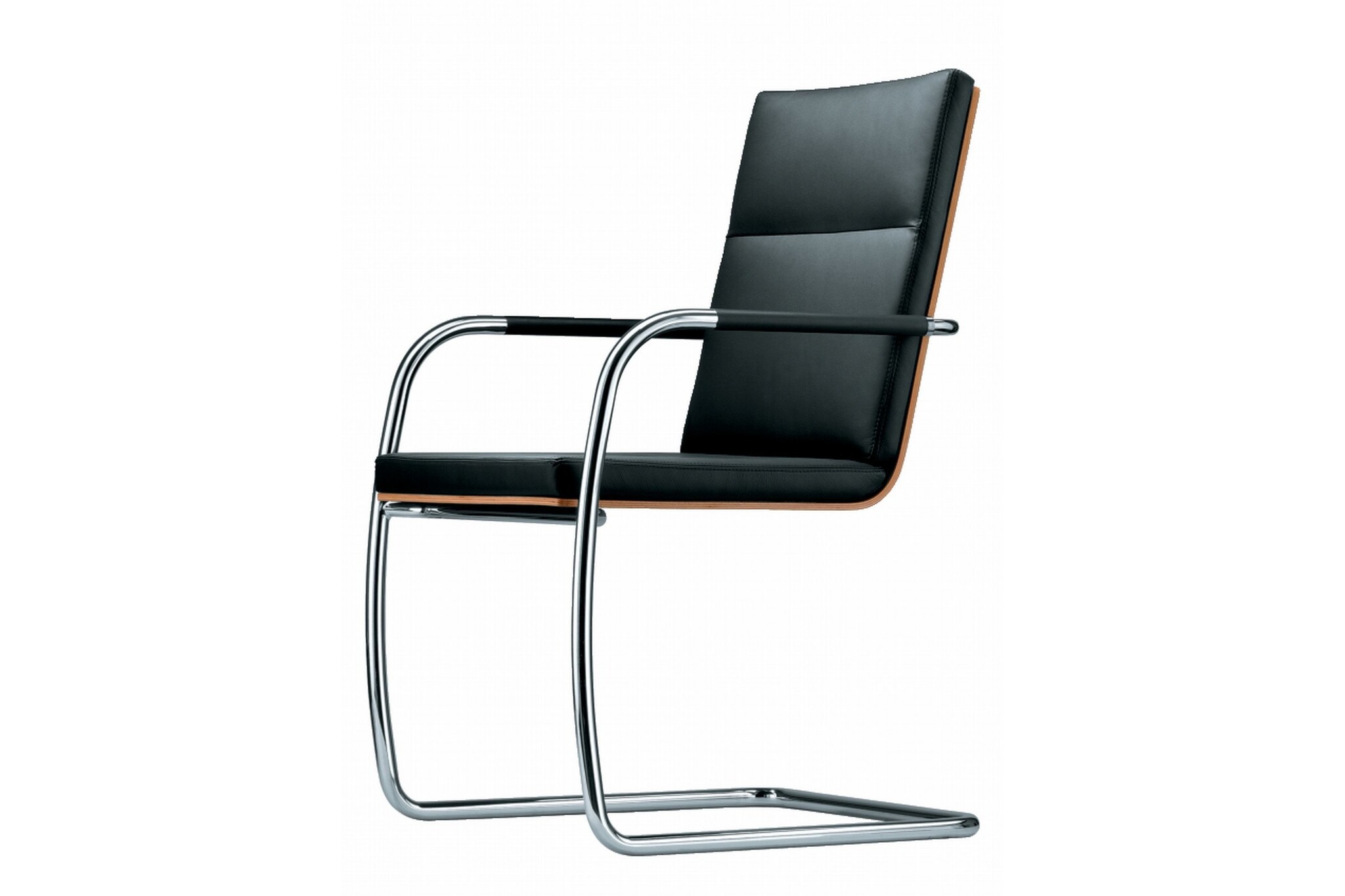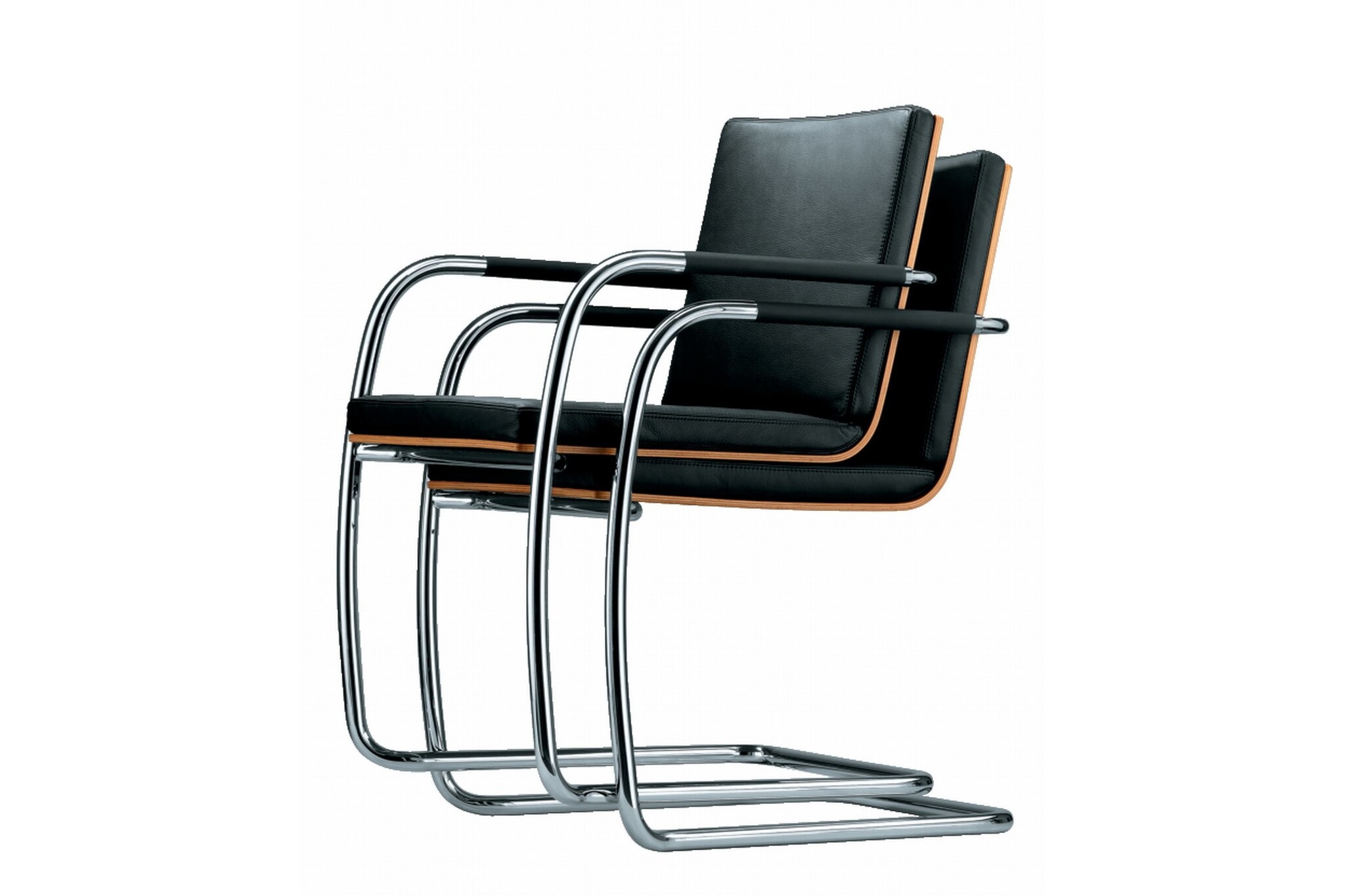 Thonet S60 vergaderstoel voorzien van een slede frame en armleggers. De S60 stoel is leverbaar in verschillende uitvoeringen en kan in het stof of leder bekleedt worden. De armleuningen zijn bedekt met elastomeer en tegen meerprijs ook in het leer leverbaar. Van de S60 is ook een stapelbare stoel uitvoering. Thonet S60 uitvoeringen;