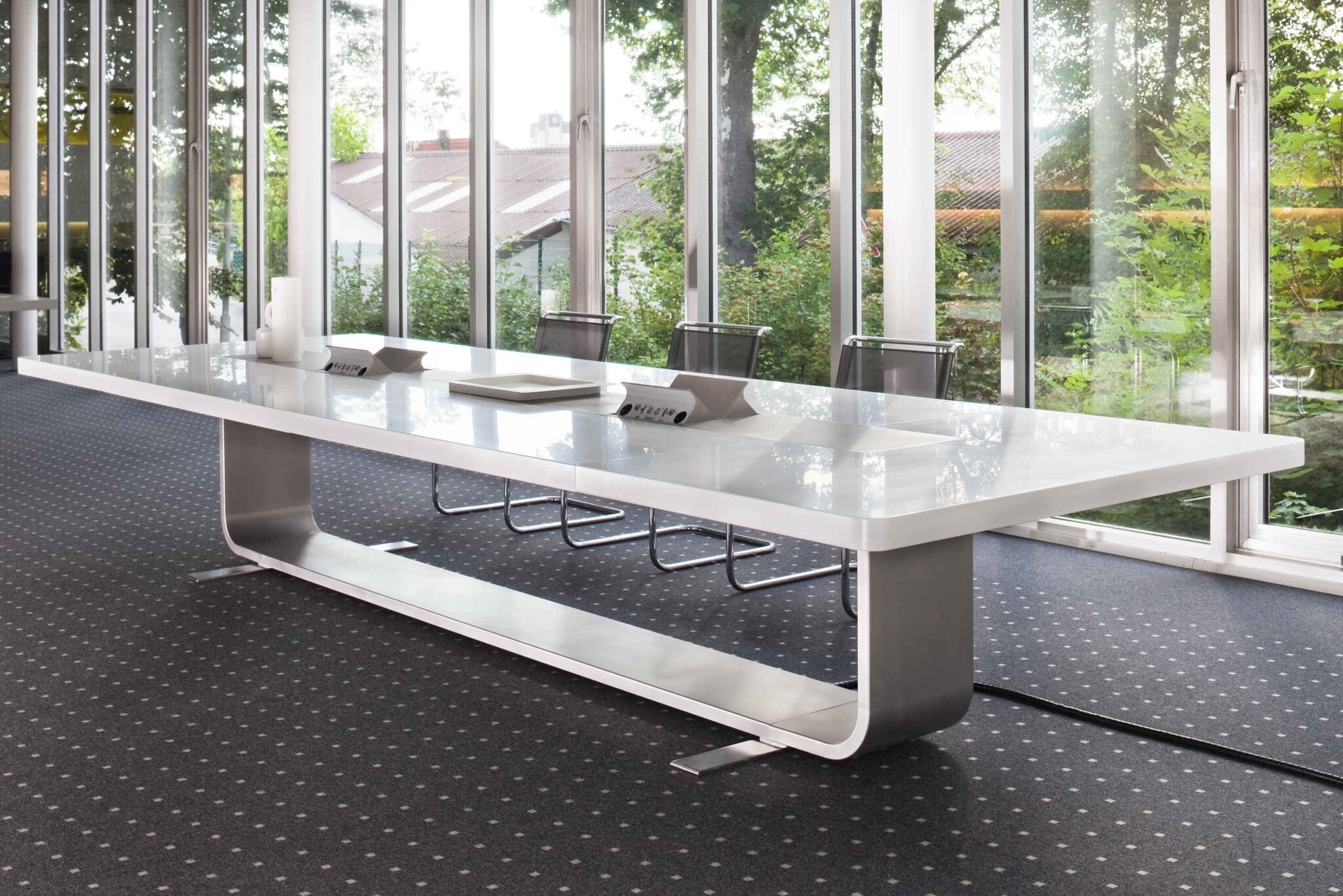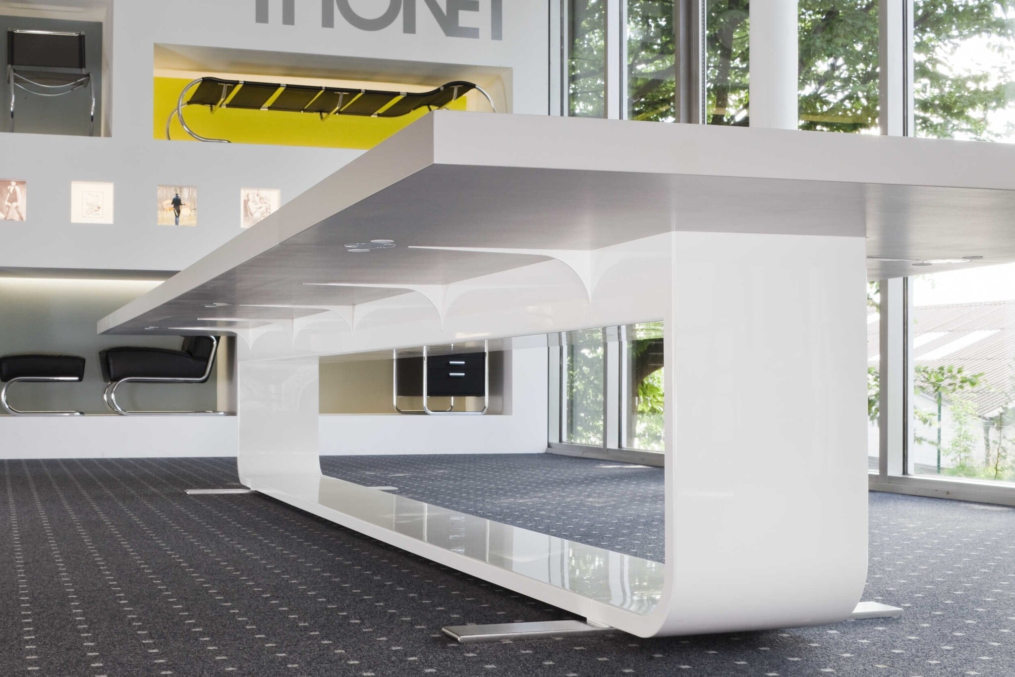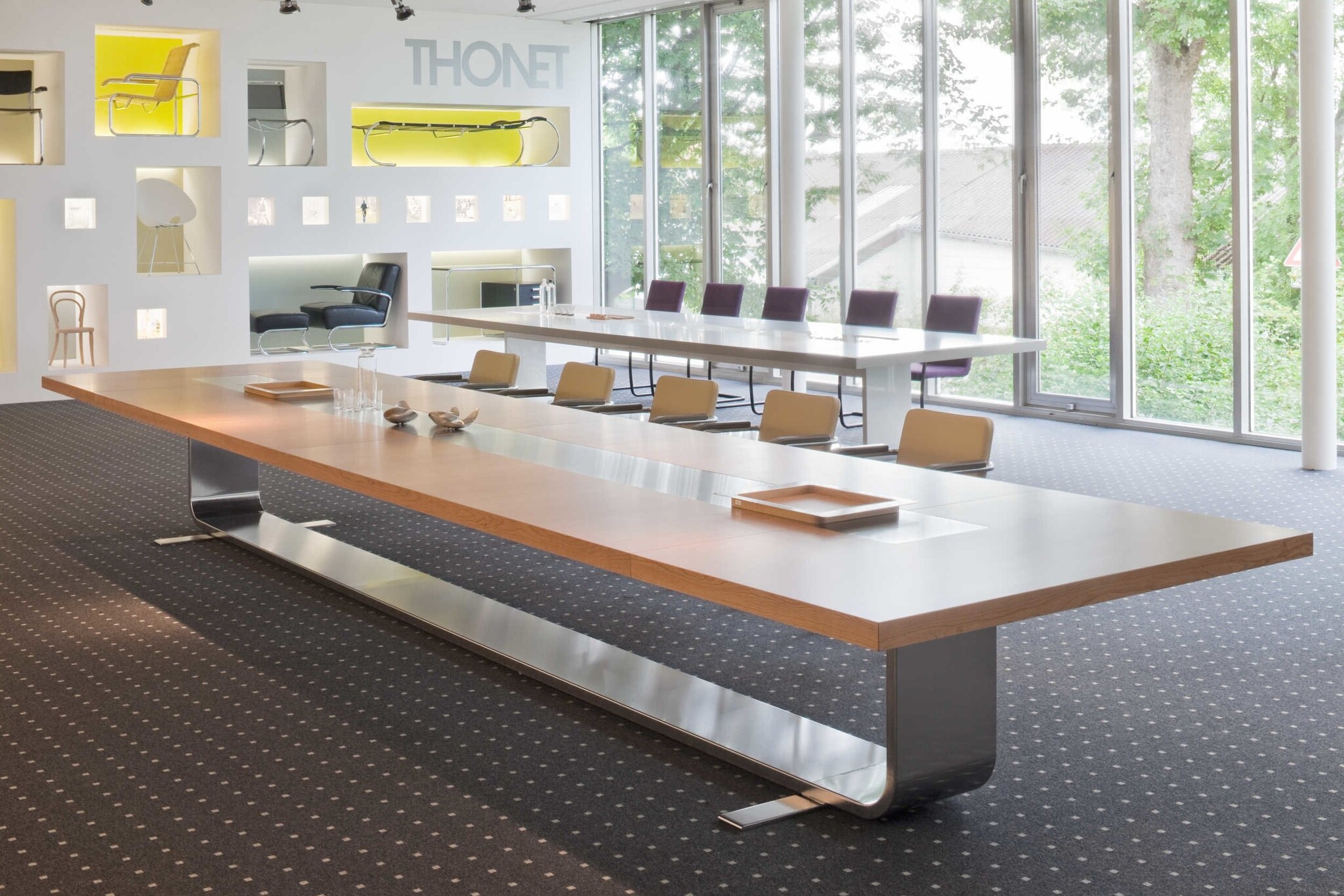Conferentietafels voorzien van hoogwaardige kwaliteit, zichtbaar gemak en hoge functionaliteit. S8000 tafels van Thonet zijn leverbaar in diverse maatvoeringen, waaronder ook in een rond formaat. Deze conferentietafels zijn gemaakt van gefineerd meubelplaat, dwars gefineerd en zijn in Hi-Macs wit (quartz plaatmateriaal) leverbaar. Het tafelblad is 60 mm dik en heeft een rechte afwerking van 5 mm. Het bevat een multifunctioneel frame dat is voorzien van fijn geslepen RVS en van een RVS afdekplaat.