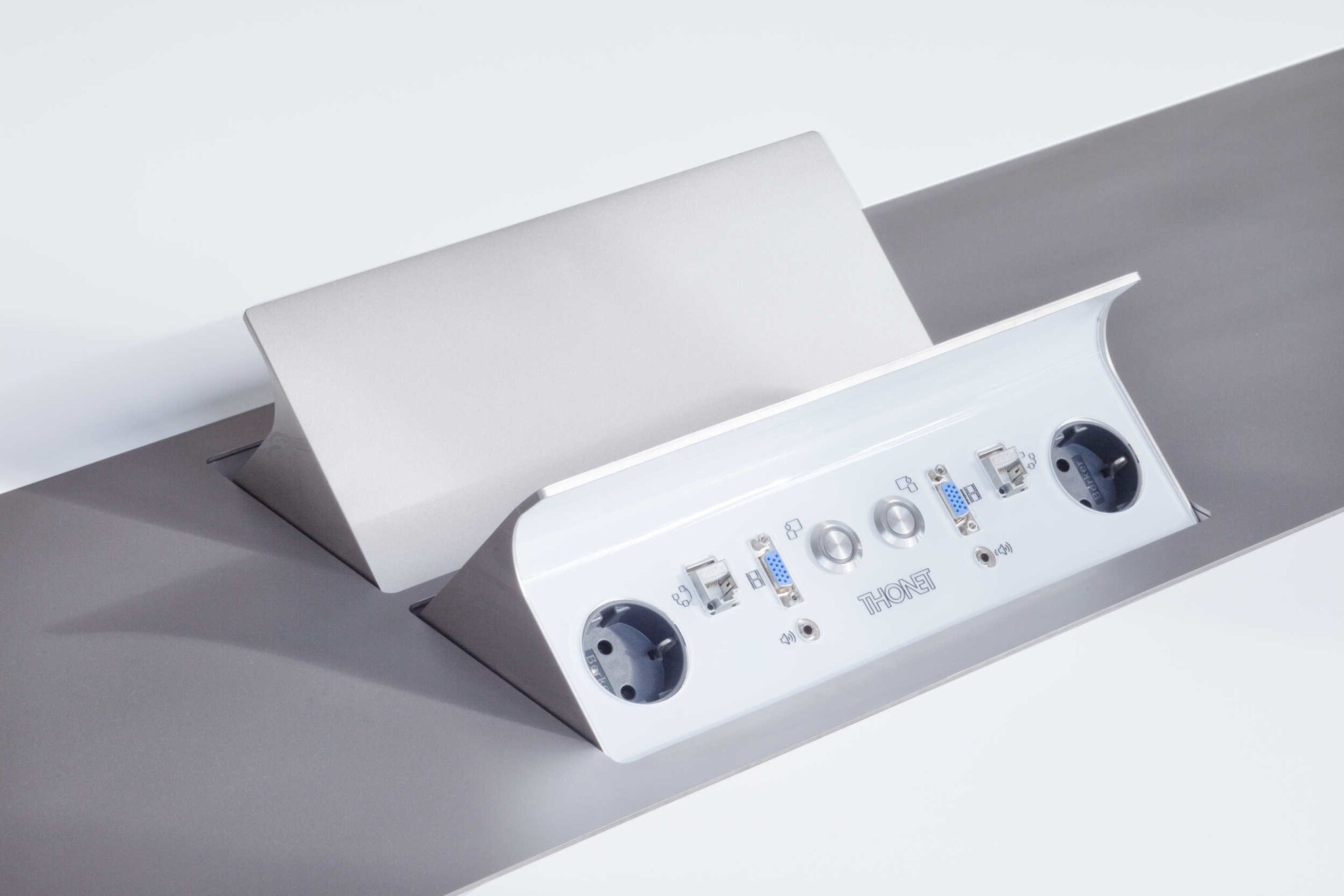 S8000 tafels kunnen worden uitgevoerd met inbouwunits voor het gebruik van data, stroom en HDMI aansluitingen. Dit maakt deze conferentietafels ideaal voor moderne kantooromgevingen en het nieuwe werken.