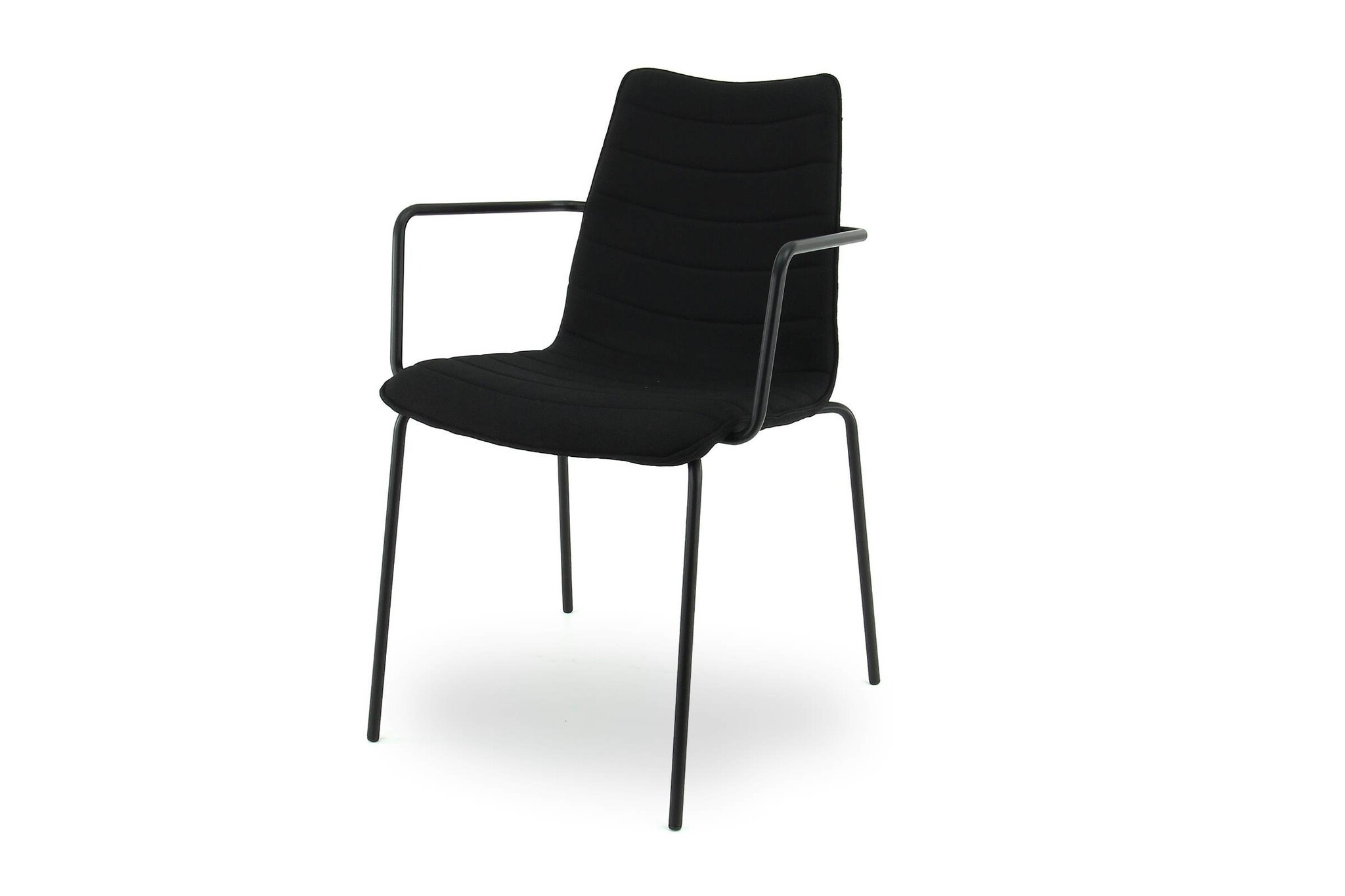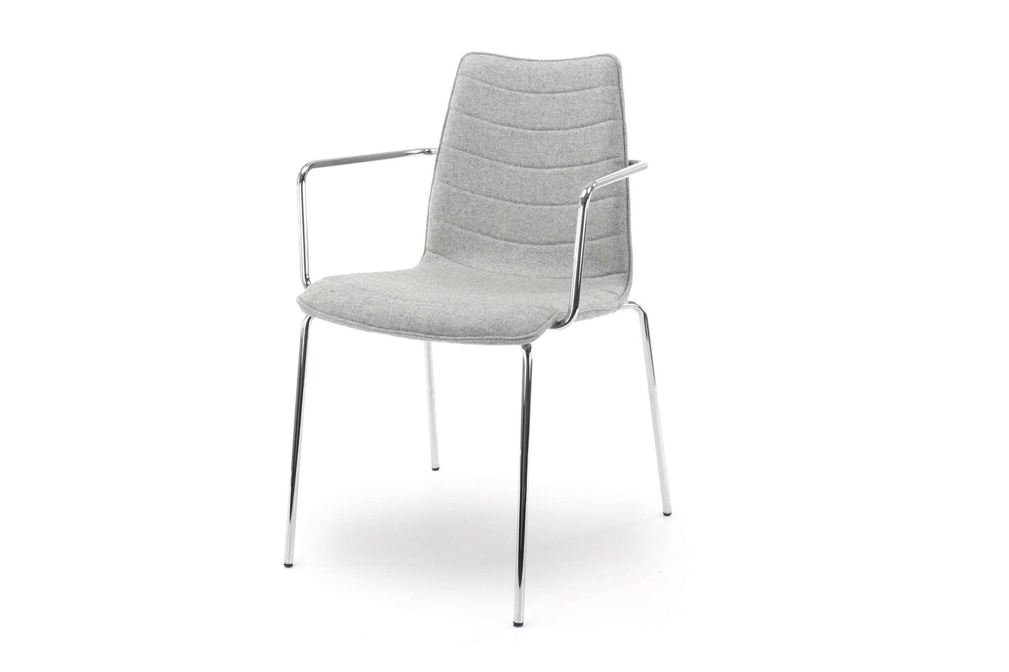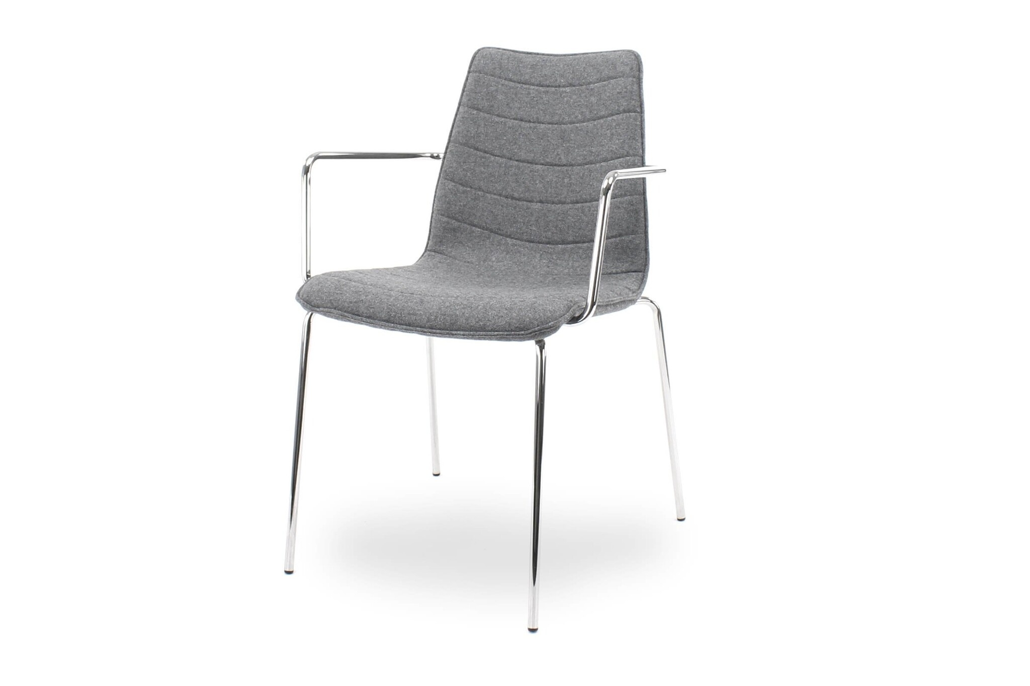 Deze Tint 4-poots vergaderstoel is rondom gestoffeerd in de stof Mirage (zwart) of Fenice wolvilt (licht grijs en middengrijs). Verder is de stoel voorzien van verchroomde armleggers en een verchroomd 4-poots onderstel.