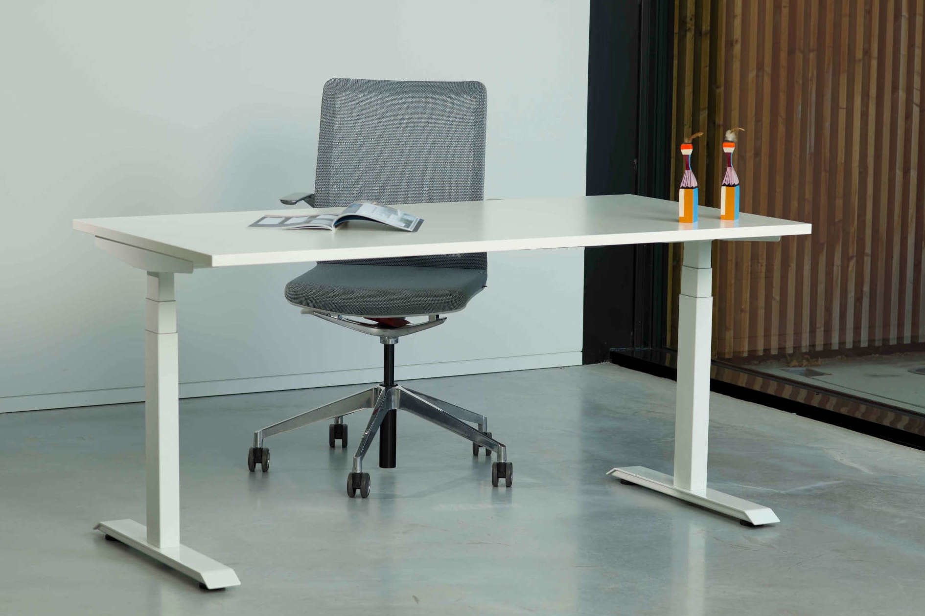 De Tint zit sta single is voor 1 persoon en zoals de naam het al noemt in hoogte verstelbaar. Veel mensen stappen over op een zit sta bureau omdat dit de kans op hart- en vaatziektes kan verminderen en de bloed doorstroom bevorderd. Naast dat het hiervoor zorgt werkt het ook nog mee aan een ergonomische houding. Dit bureau is ook ideaal toe te passen als thuiswerkplek.Wang-poot