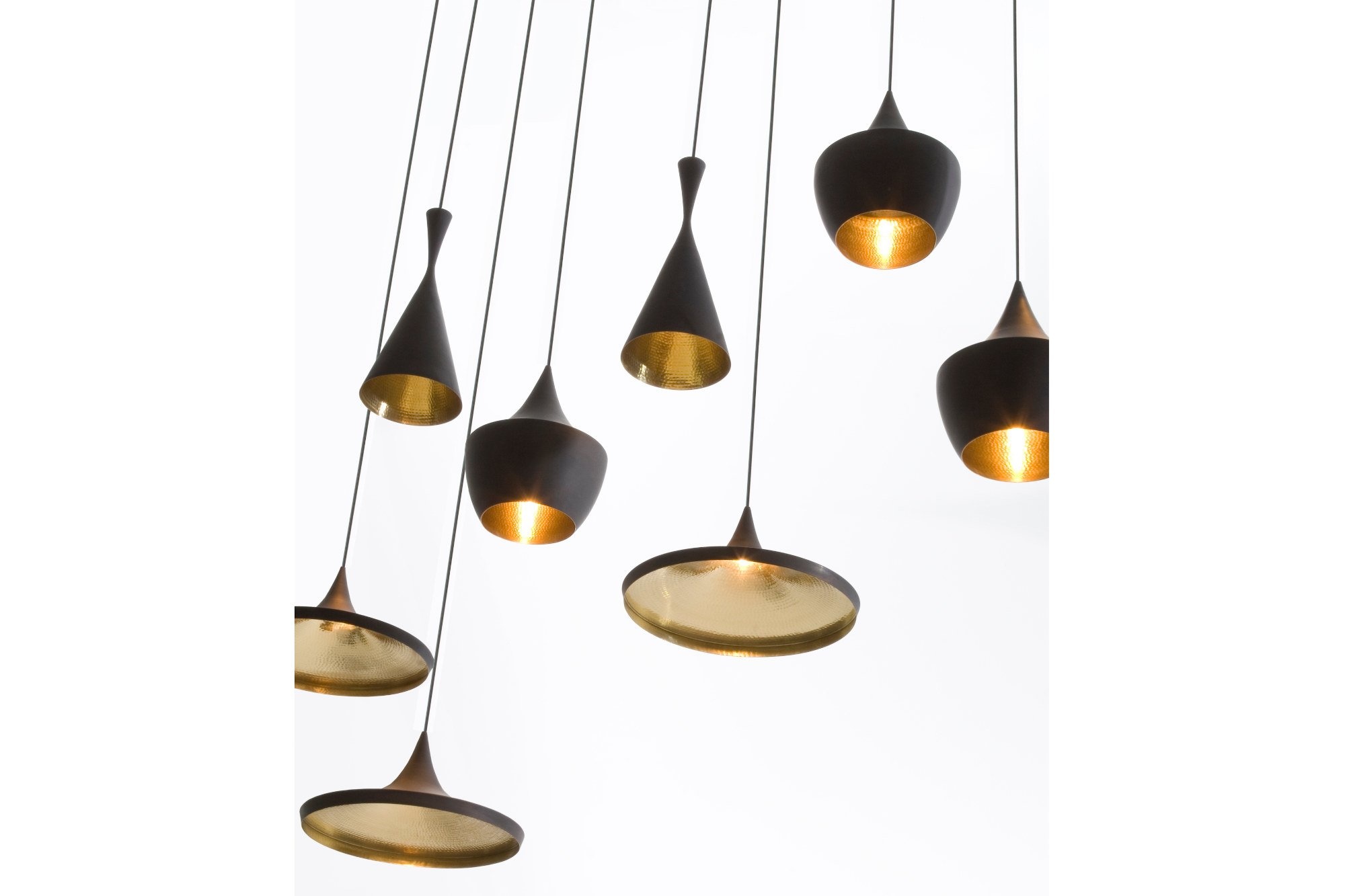 Beat verlichting van Tom Dixon is geïnspireerd door Indiase tradities, waaronder kokeren kookpotten en Indiase watervaten. Beat Fat is een variant binnen deze ruime collectie en is gemaakt van messing met een gepatineerde buitenkant. Het zijn gesponnen, met de hand geslagen lampen.