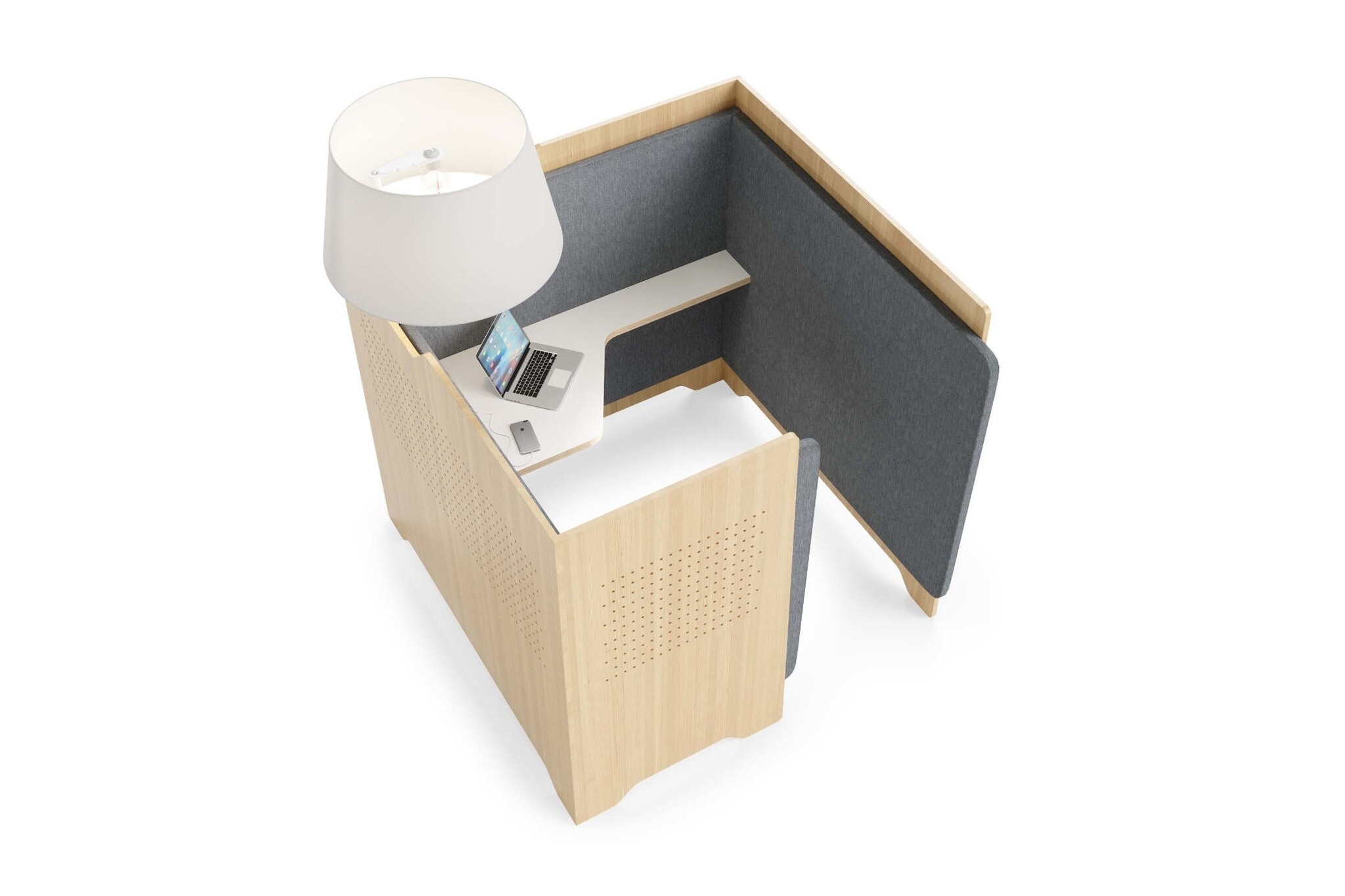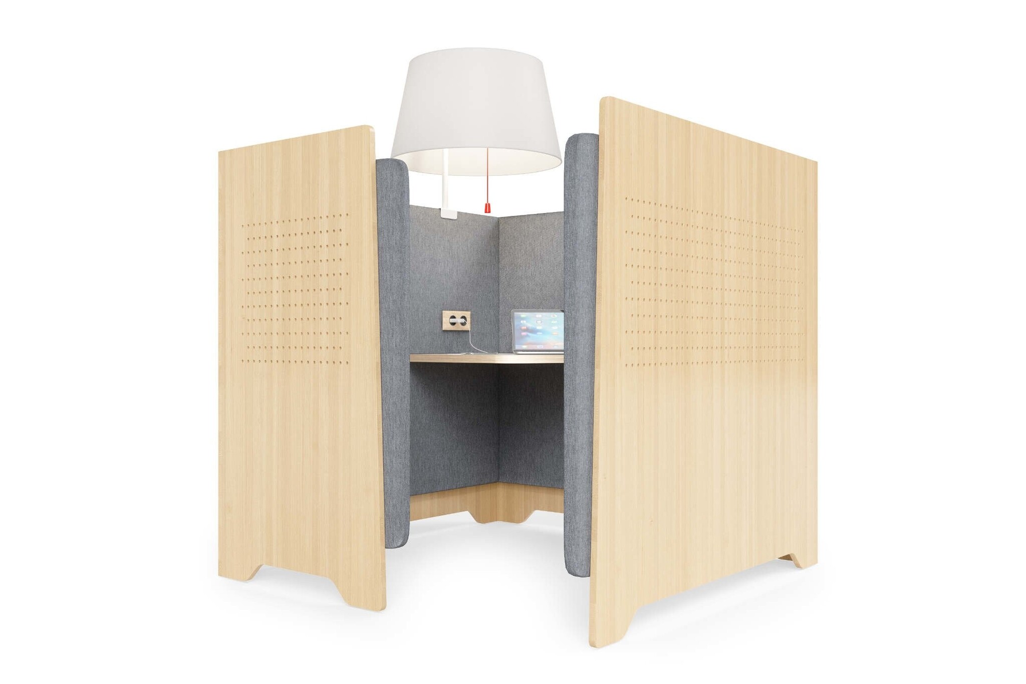 Complete werkplek afgeschermd met schermen, met verlichting en elektrificatie voor het opladen van de laptop of andere elektronische devices.