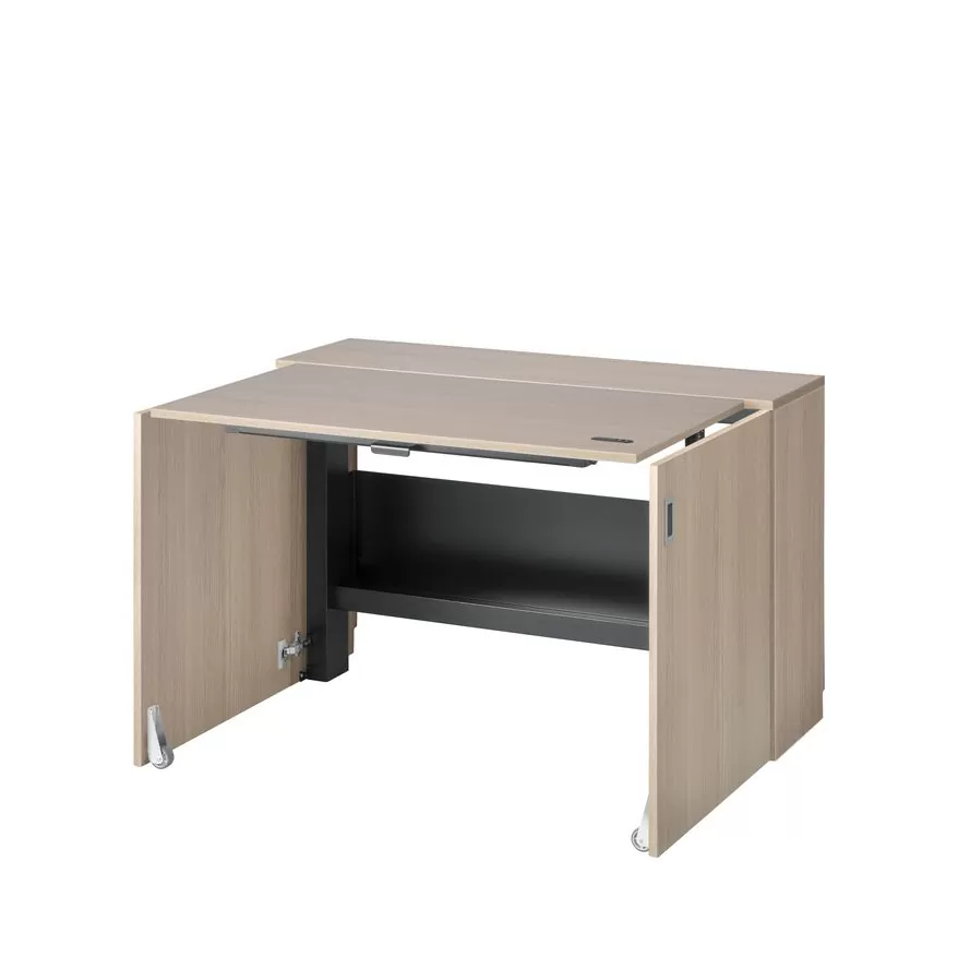 Het openen van de deuren en het opklappen van het werkblad kunnen de transformatie van het anonieme kastje tot een volwaardige werkplek snel en eenvoudig maken. De bediening voor de hoogteverstelling is in het werkblad opgenomen.