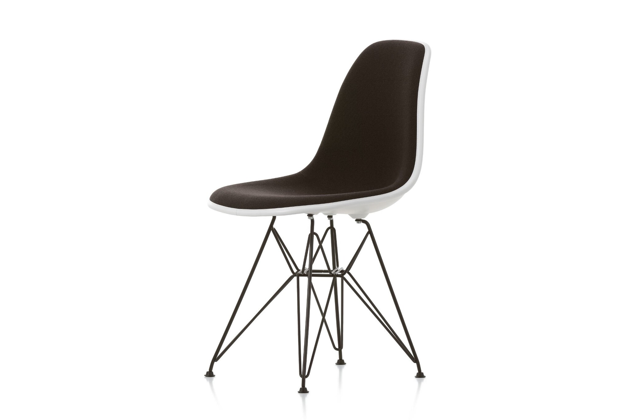 De Eames DSR stoel is leverbaar met een zitschaal van polypropyleen (kunststof) of volledig gestoffeerd.