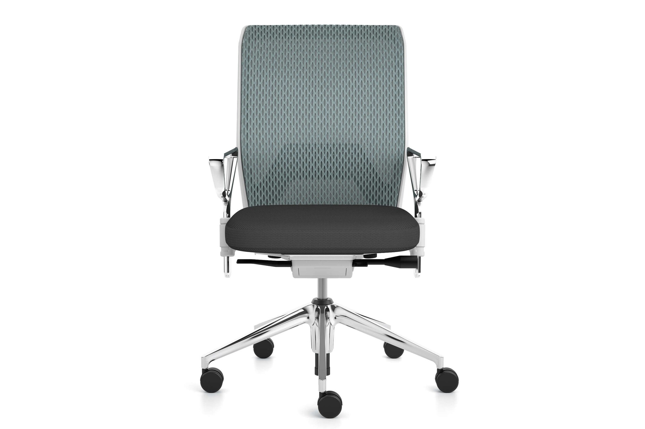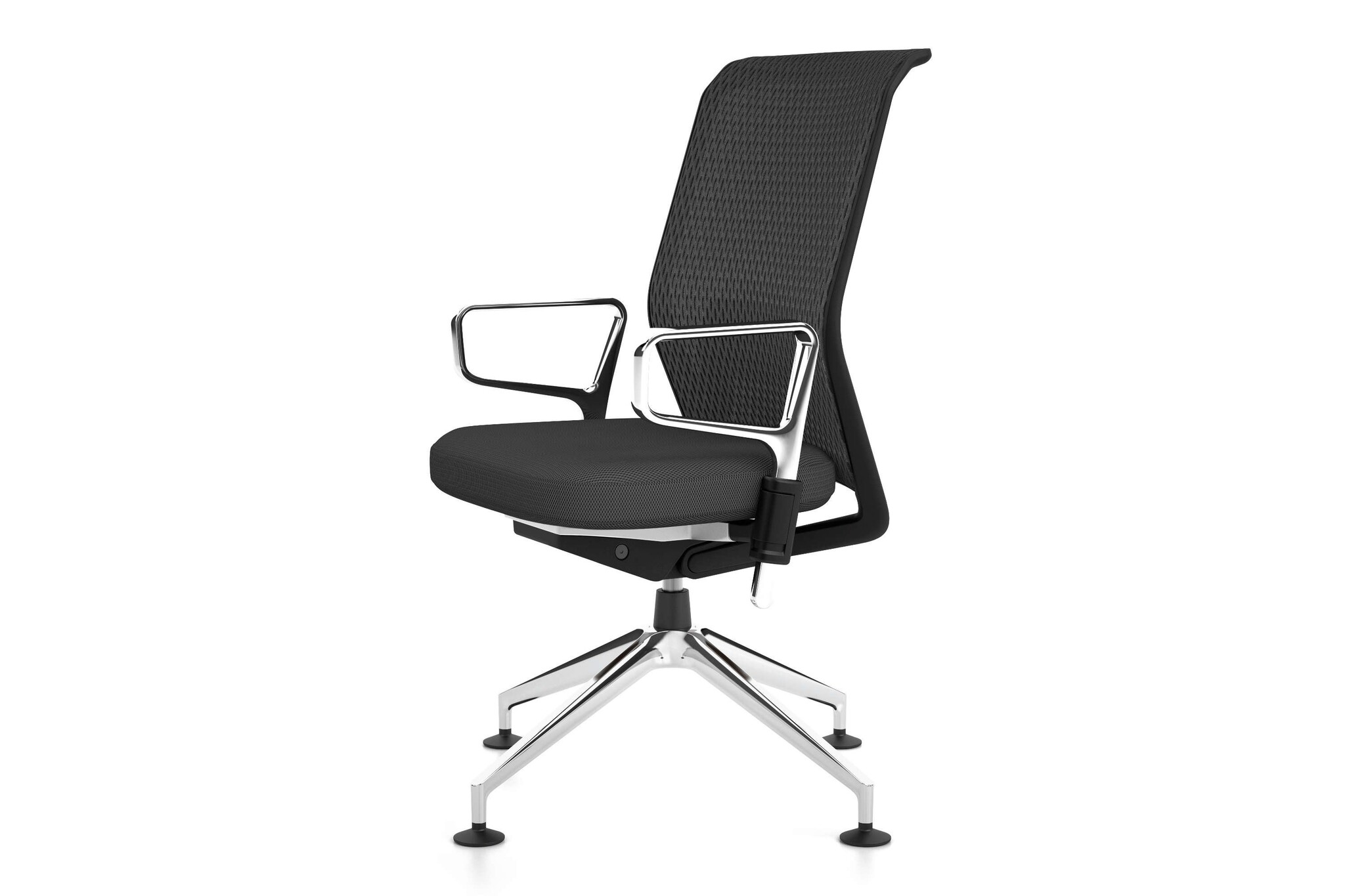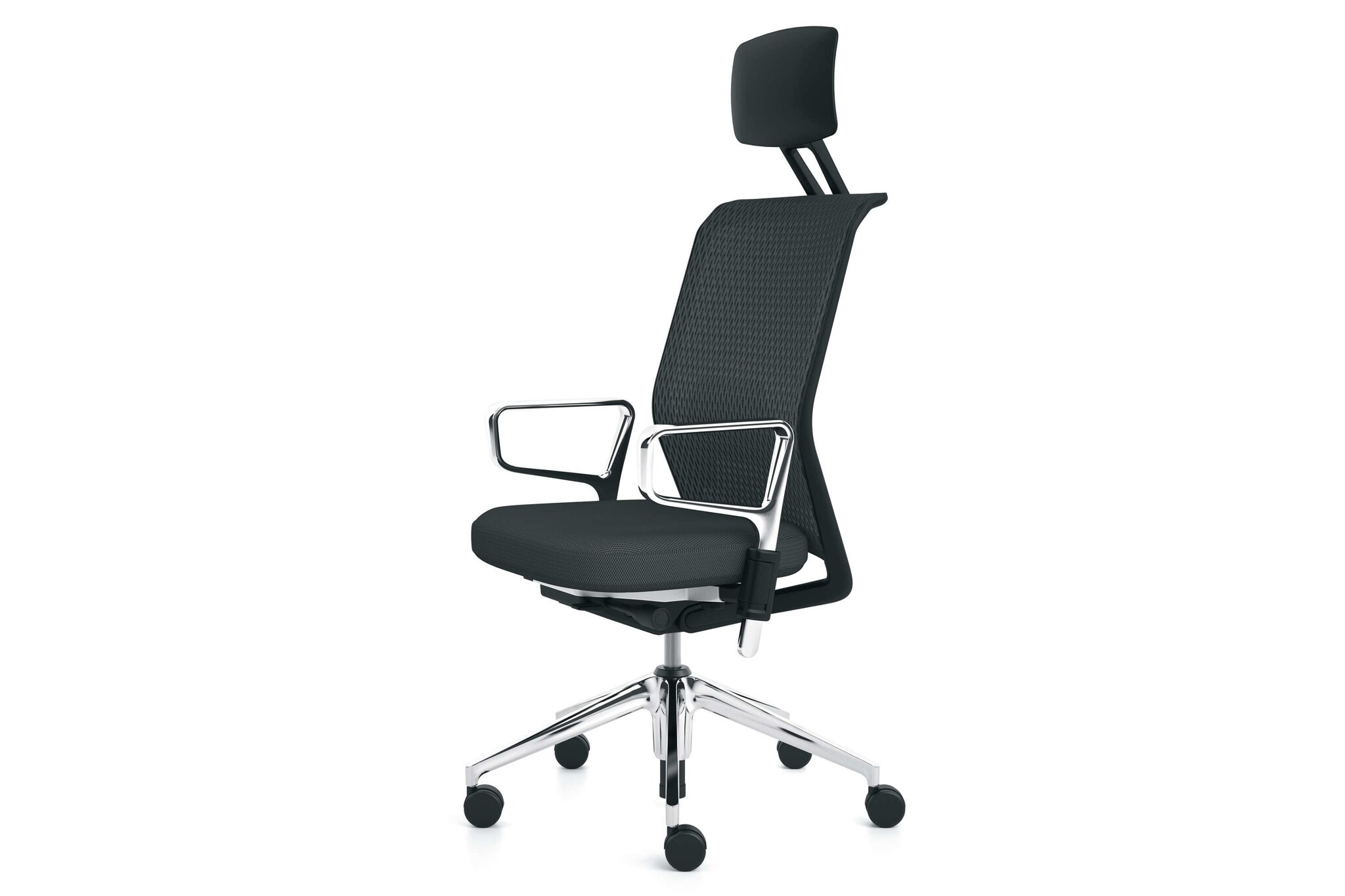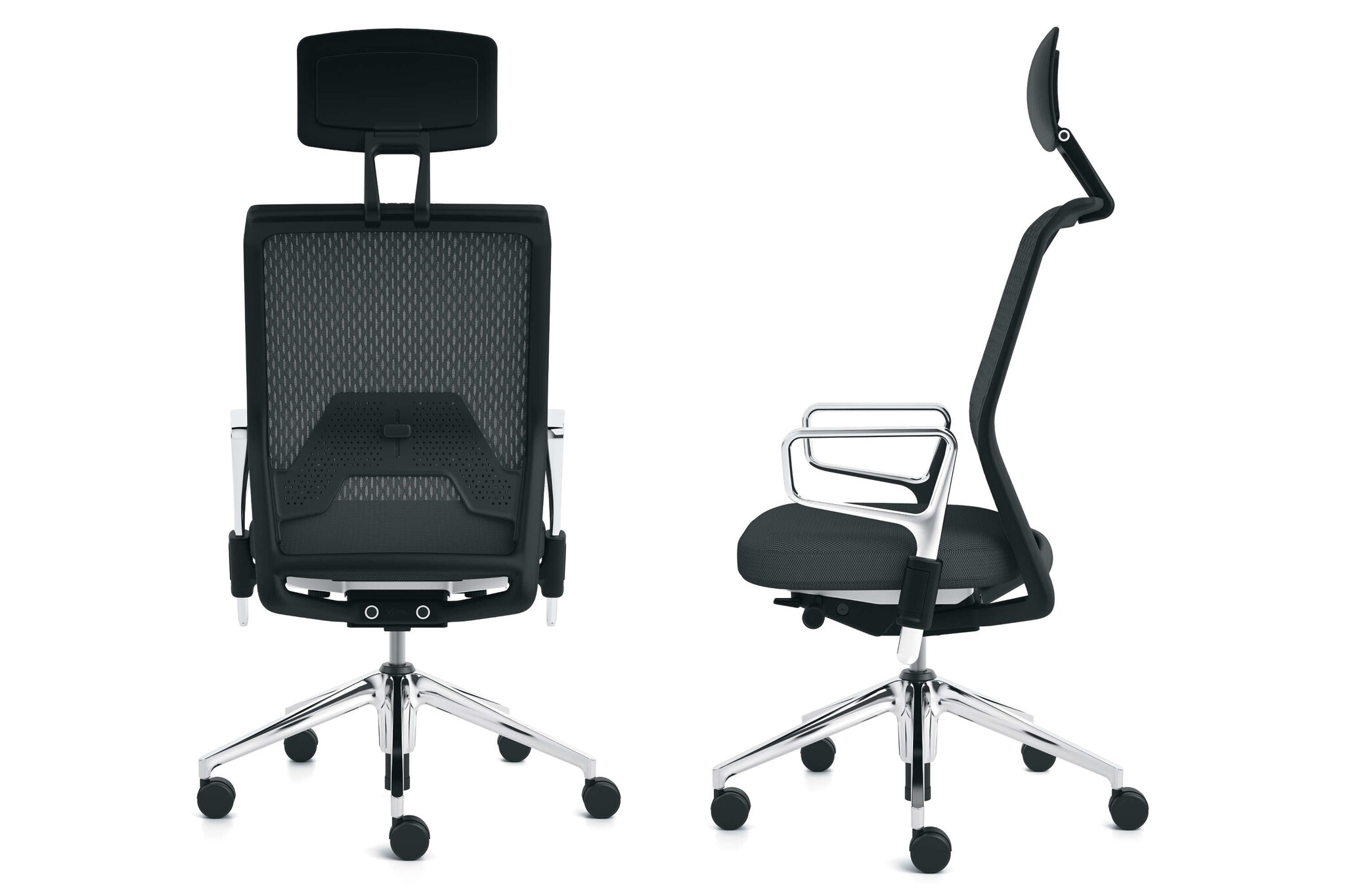 De ID Mesh heeft een vijfsteronderstel van polyamide in basic dark of gepolijst persgietaluminium met zwenkwielen (ø 60 mm) of met glijders.