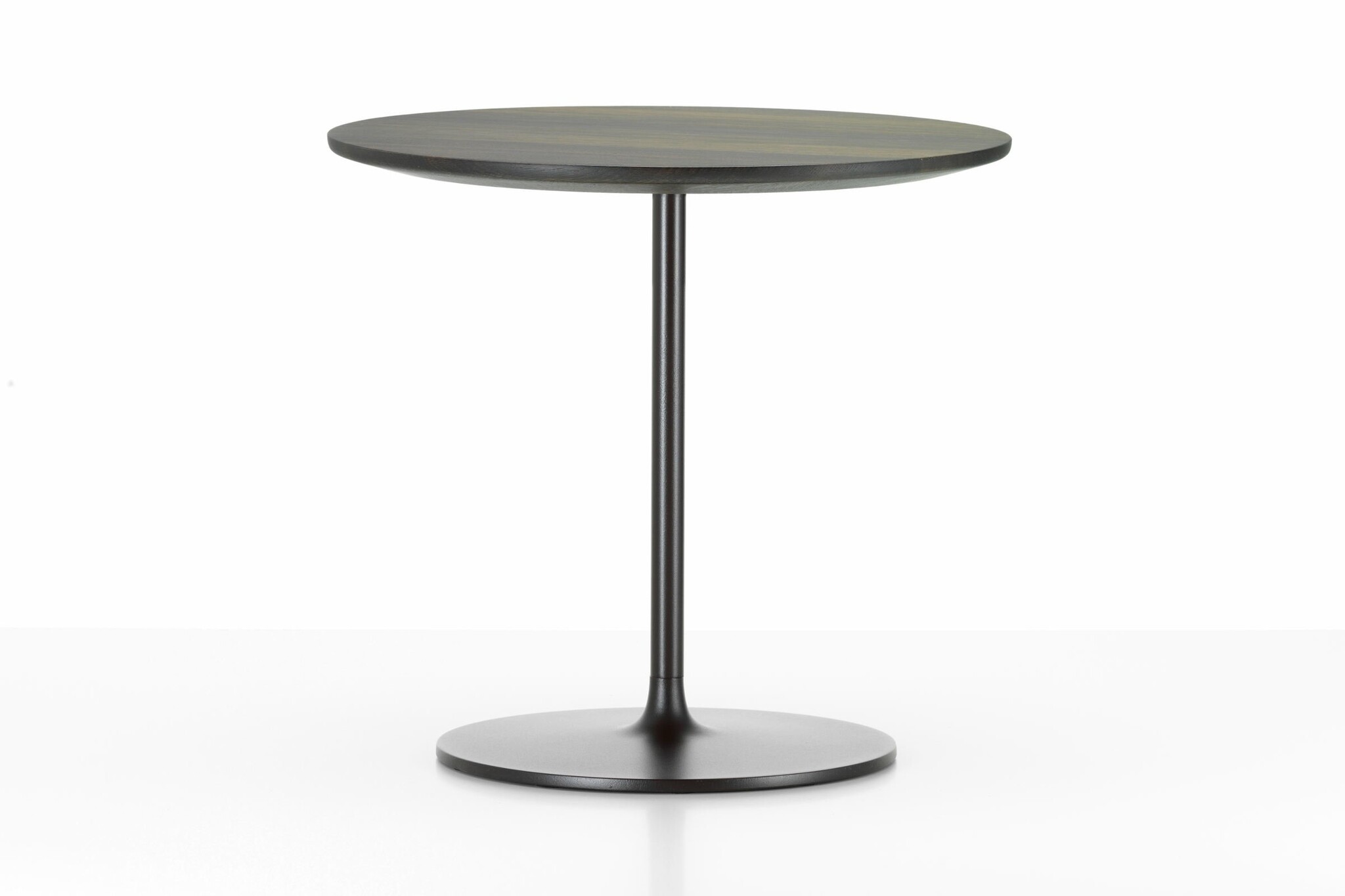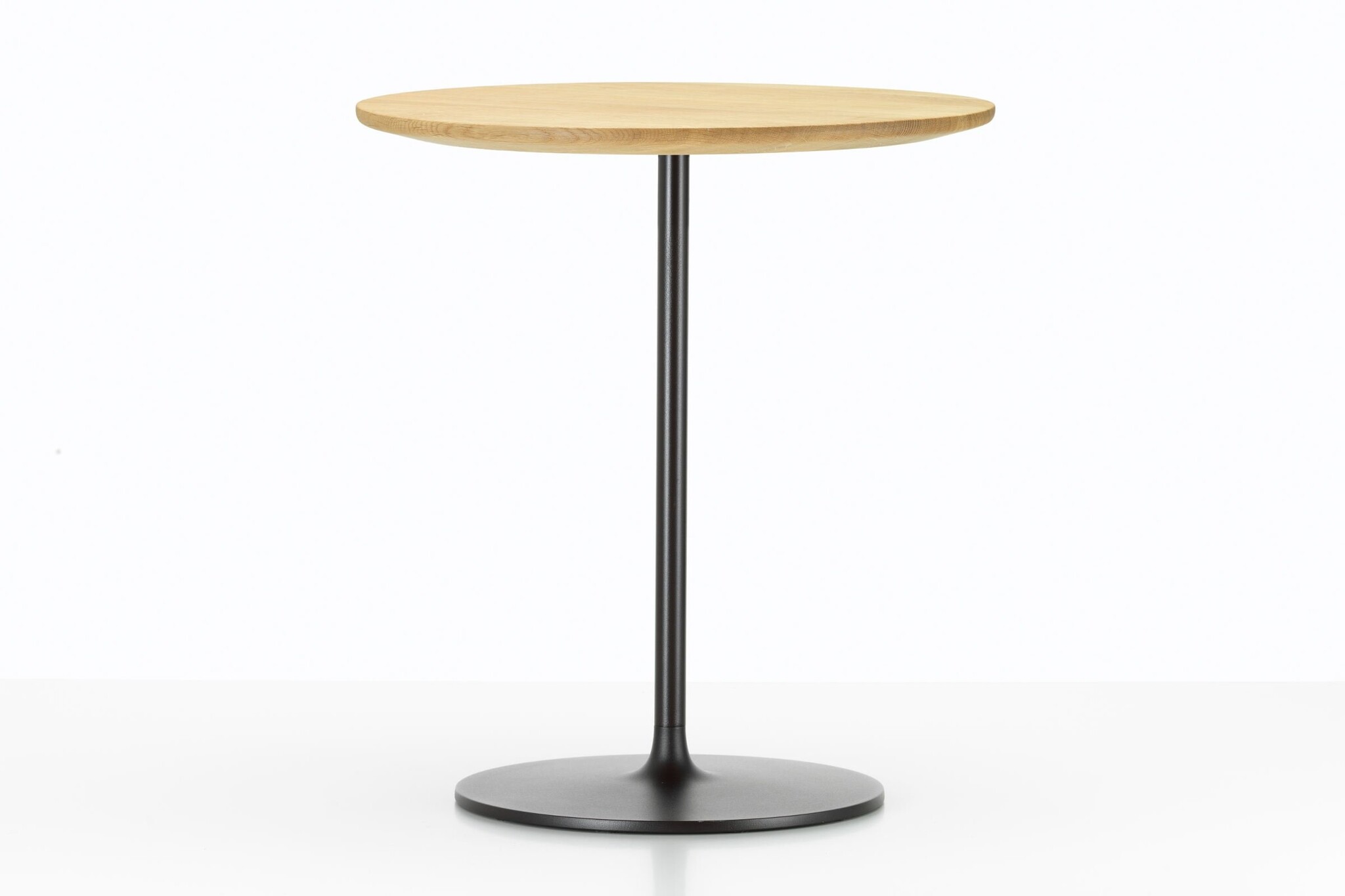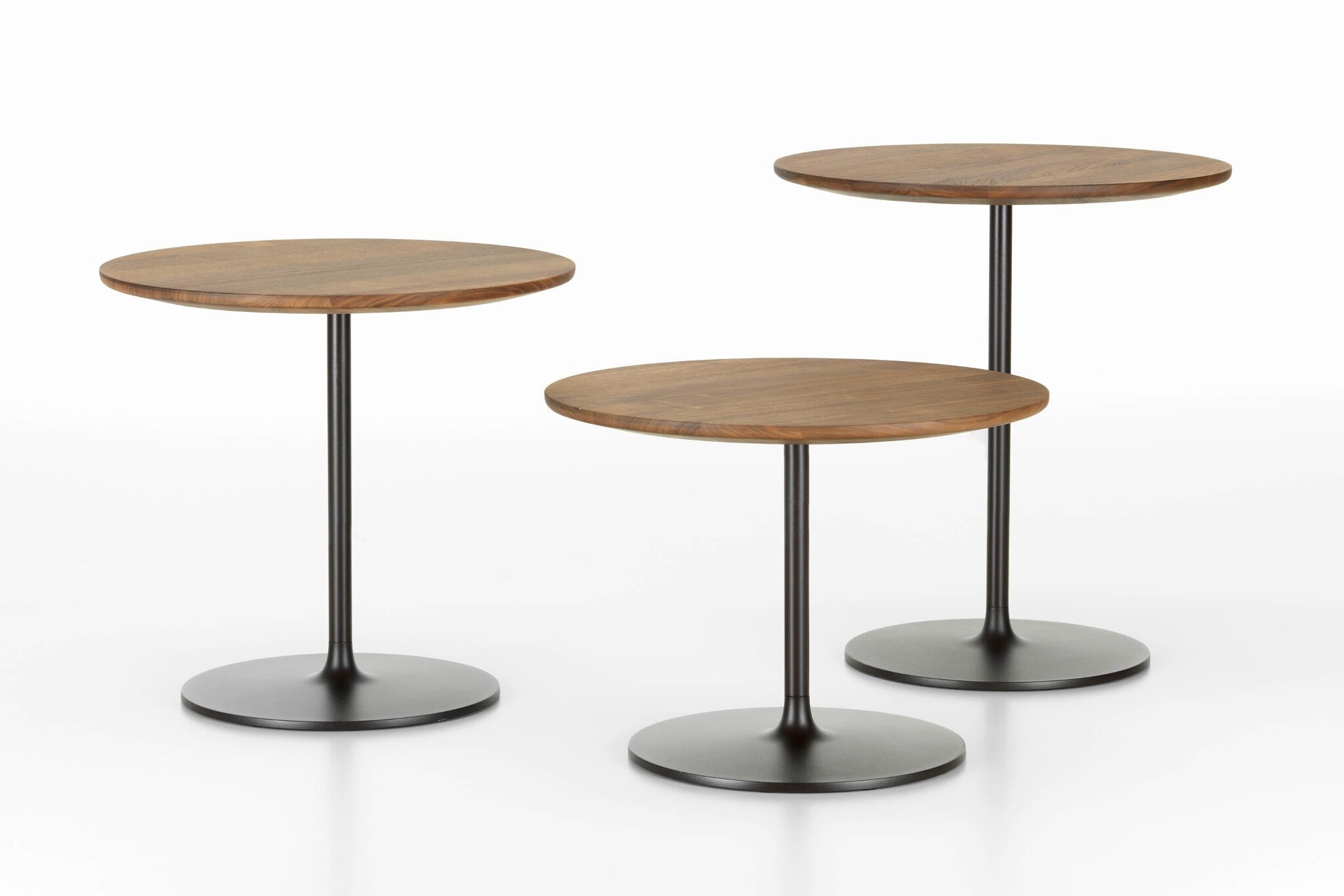 De kleine tafels met een stabiele metalen voet bestaan in drie hoogtes; van het niveau van een bijzettafel tot een standaard legplank, en met verfijnde tafelbladen met afgeschuinde randen, gemaakt van aluminium of kwaliteitsvol massief hout.