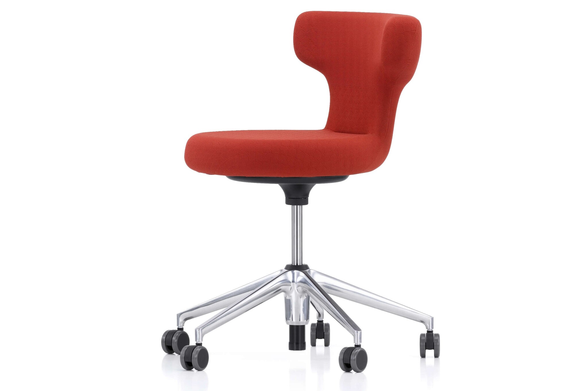 De Pivot Stool heeft een verstelbare zithoogte en een vijfsteronderstel van polyamide in basic dark of gepolijst persgietaluminium met zwenkwielen (Ø 60 mm) of glijders