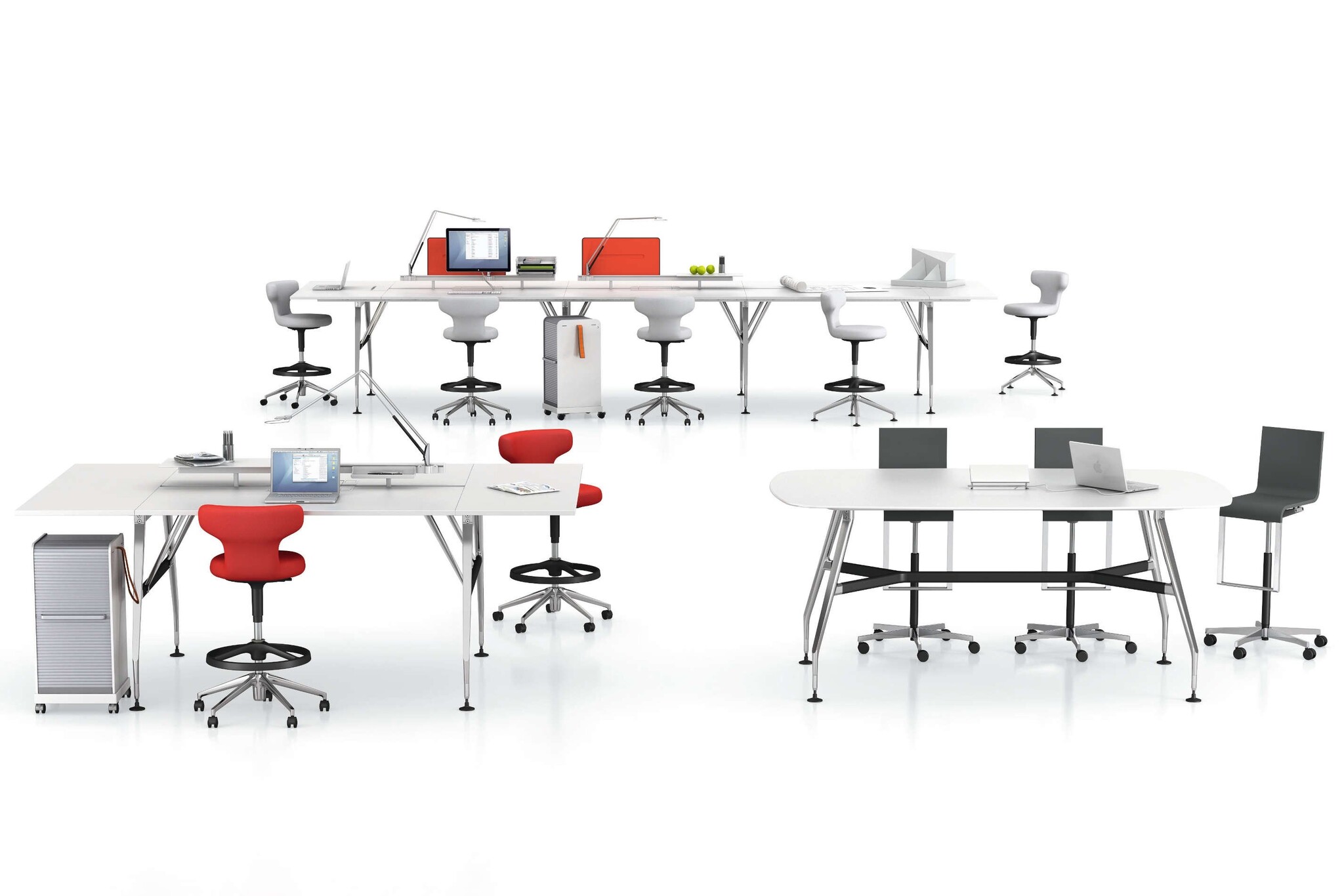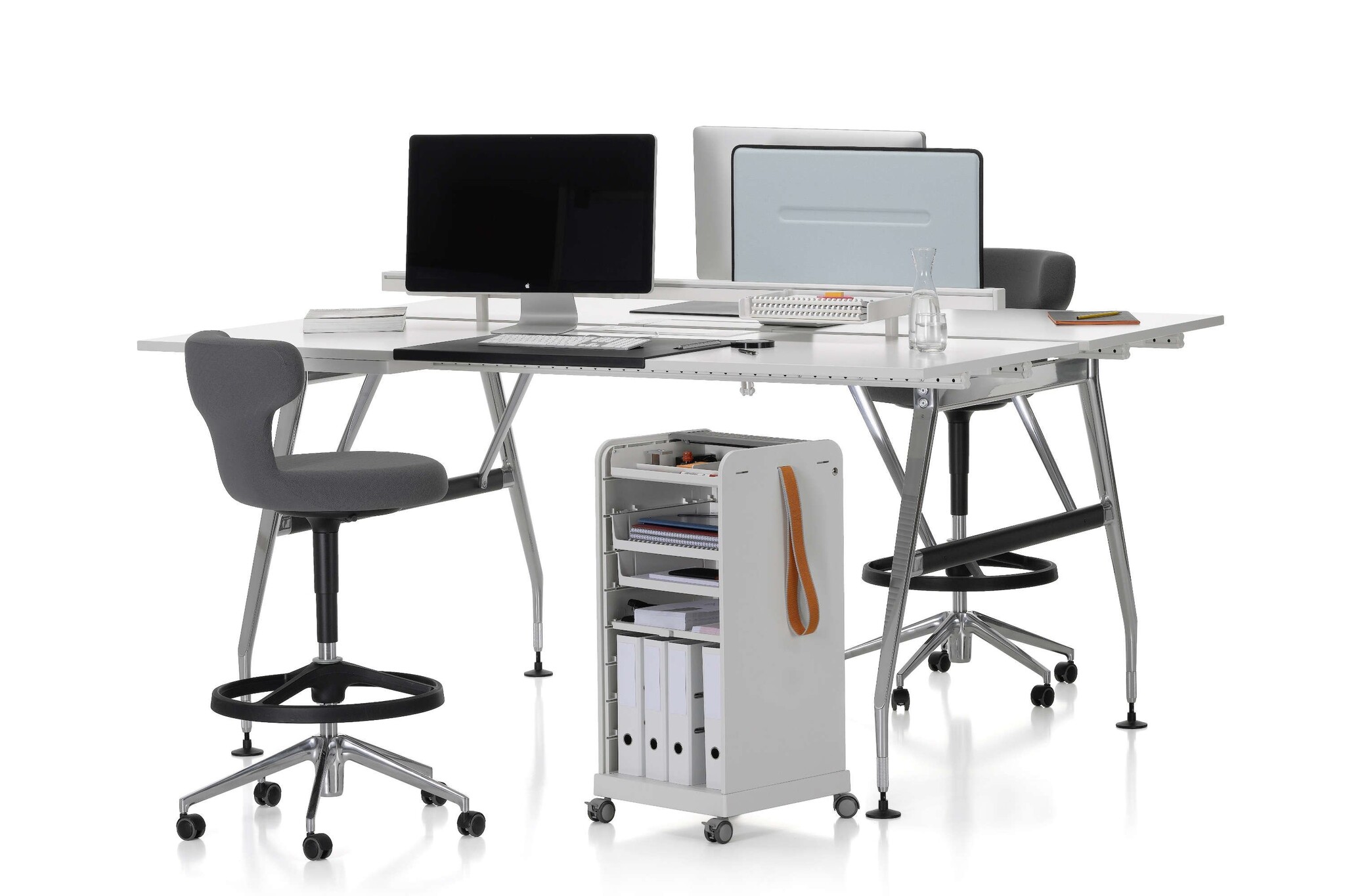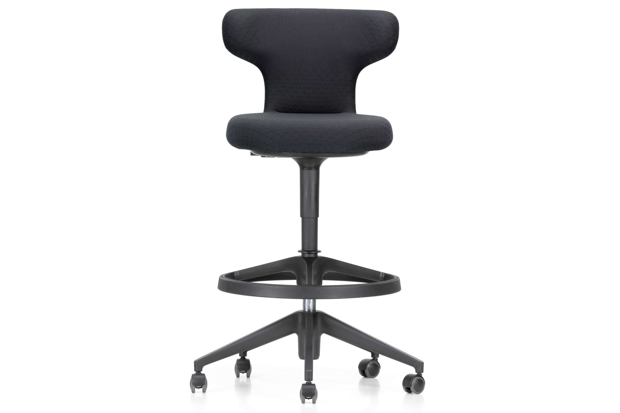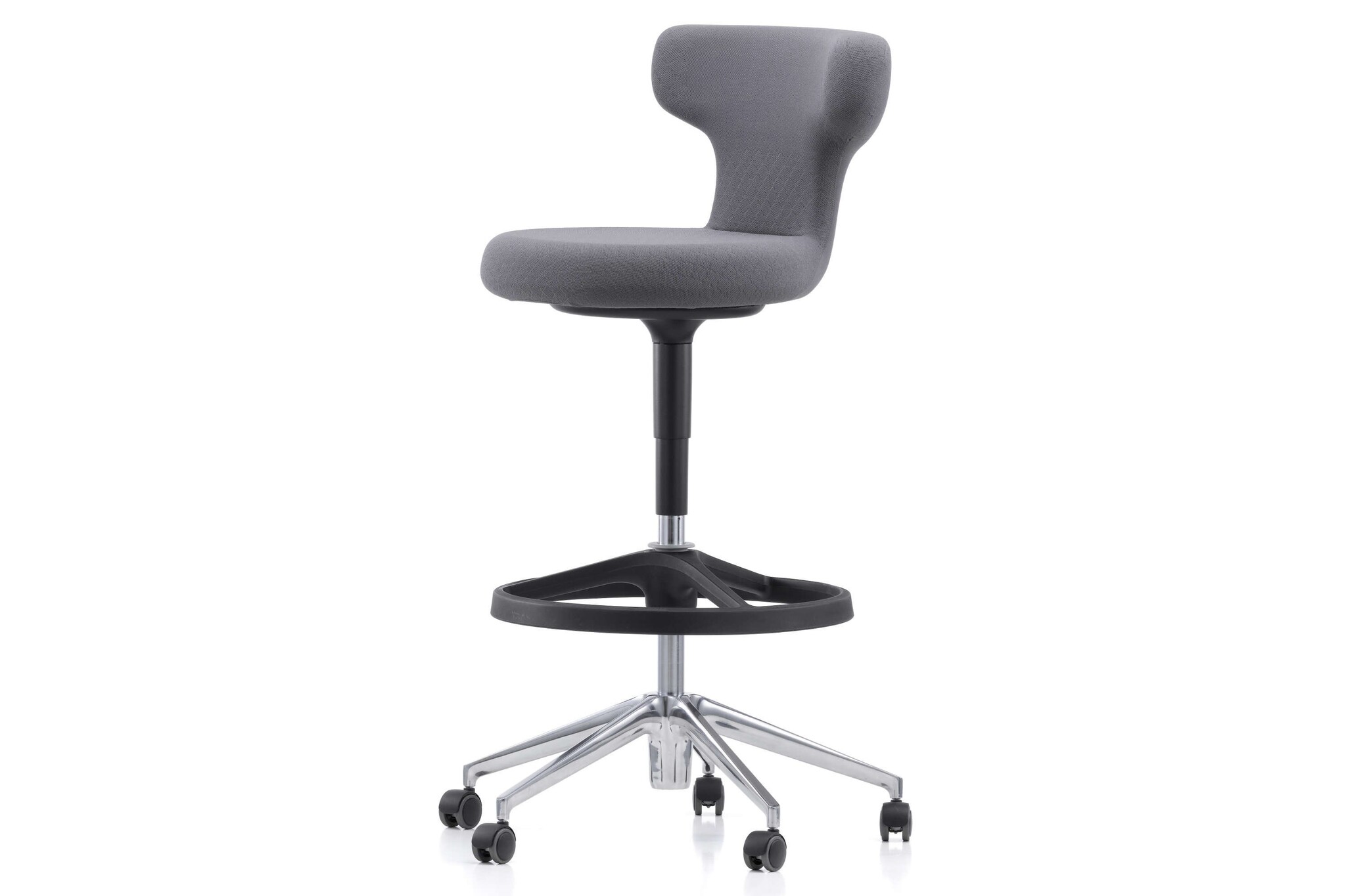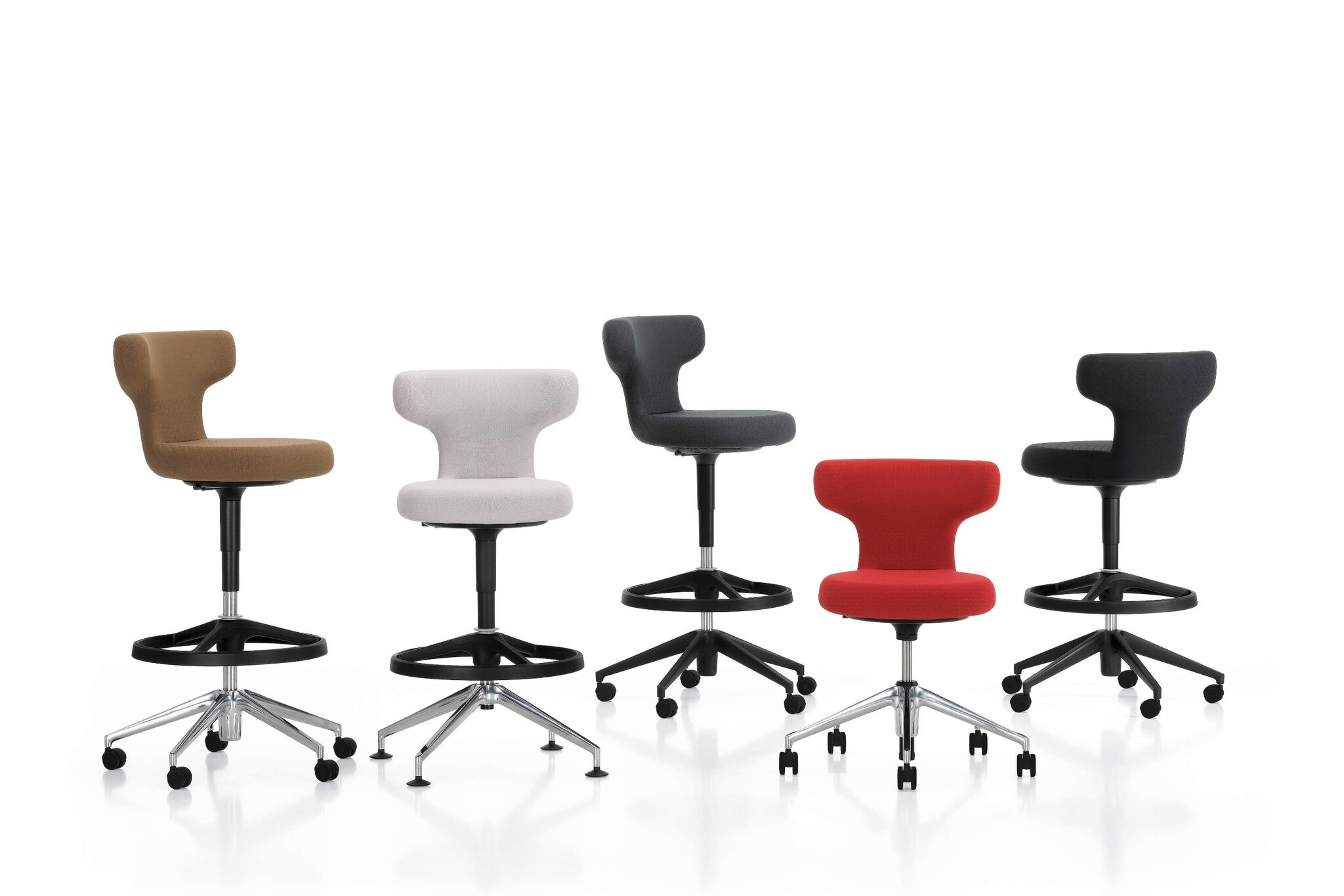 De Pivot serie bestaat uit een hoge werkstoel (High Stool) met een vijfsteronderstel van polyamide in basic dark of gepolijst persgietaluminium met omgekeerd geremde zwenkwielen.