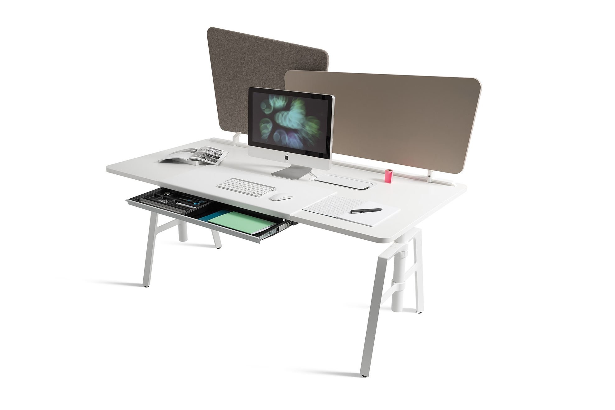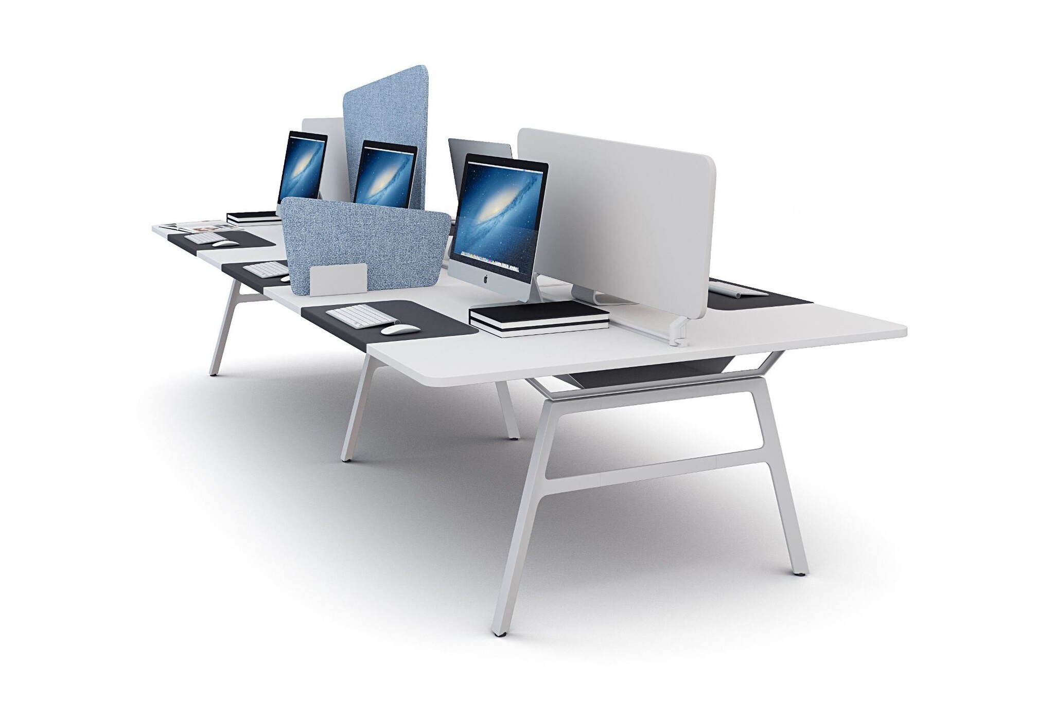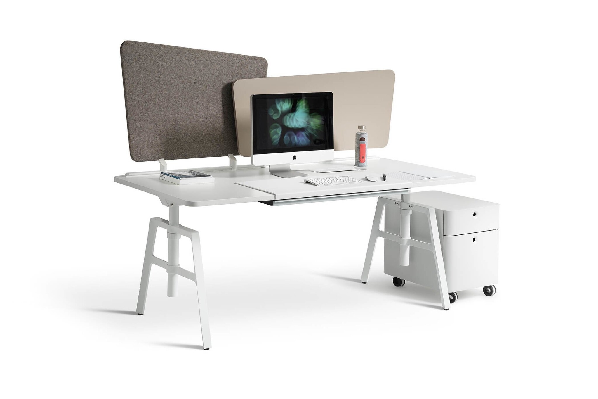 De Etio van Wiesner Hager is een kantoor tafelprogramma met verschillende mogelijkheden. Leverbaar als bureau met of zonder scheidingswanden om open of gesloten te werken. De tafel heeft een onderscheidende A-vormige aluminium poot. De hoogte van het tafelblad is eenvoudig verstelbaar, waardoor de tafel ideaal als bureau te gebruiken is door verschillende mensen. Makkelijk toepasbaar in ruimtes waar flexibel gewerkt wordt. Schermen | wanden van verschillende vormen en materialen zorgen voor het vereiste niveau van privacy. Schermen, monitors, bureaulampen of trays kunnen met behulp van een organisator rail gemonteerd worden aan het tafelblad.Kenmerken Wiesner Hager Etio werkplek