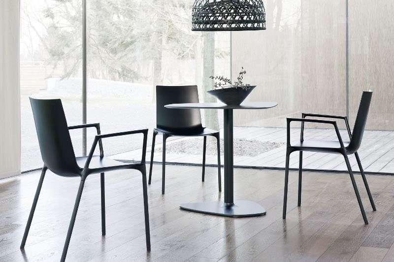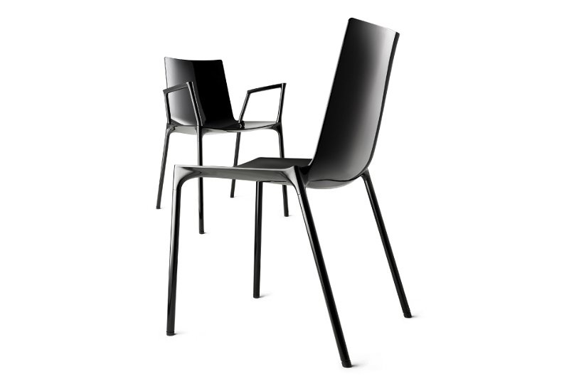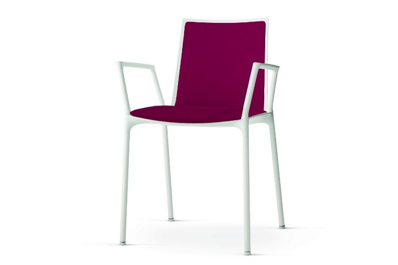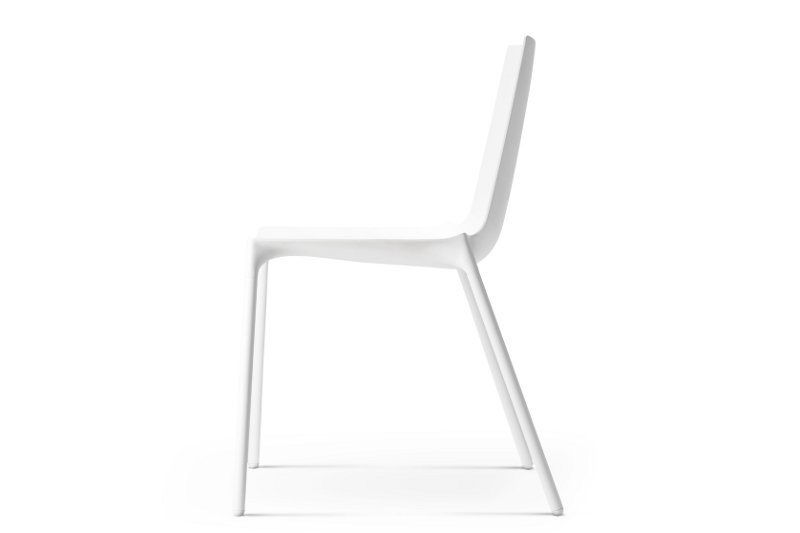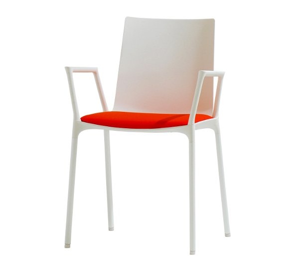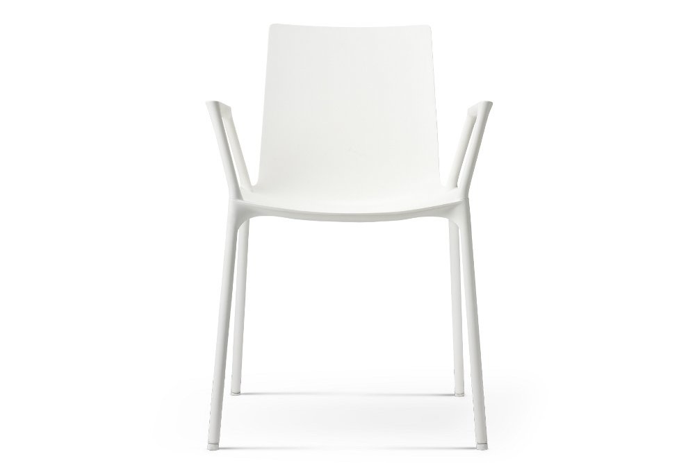Frame van stalen precisiebuis, geluidsarme universele kunststof glijders voor zowel zachte als harde ondergrond. Metalen oppervlakken met poedercoating. Zitschaal en armleggers: Polypropyleen (kunststof), kleur wit of zwart.