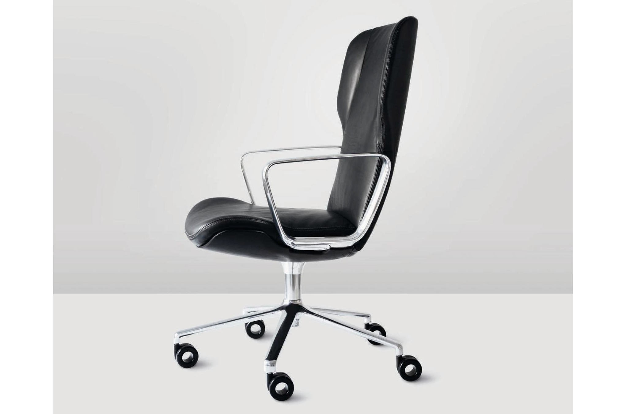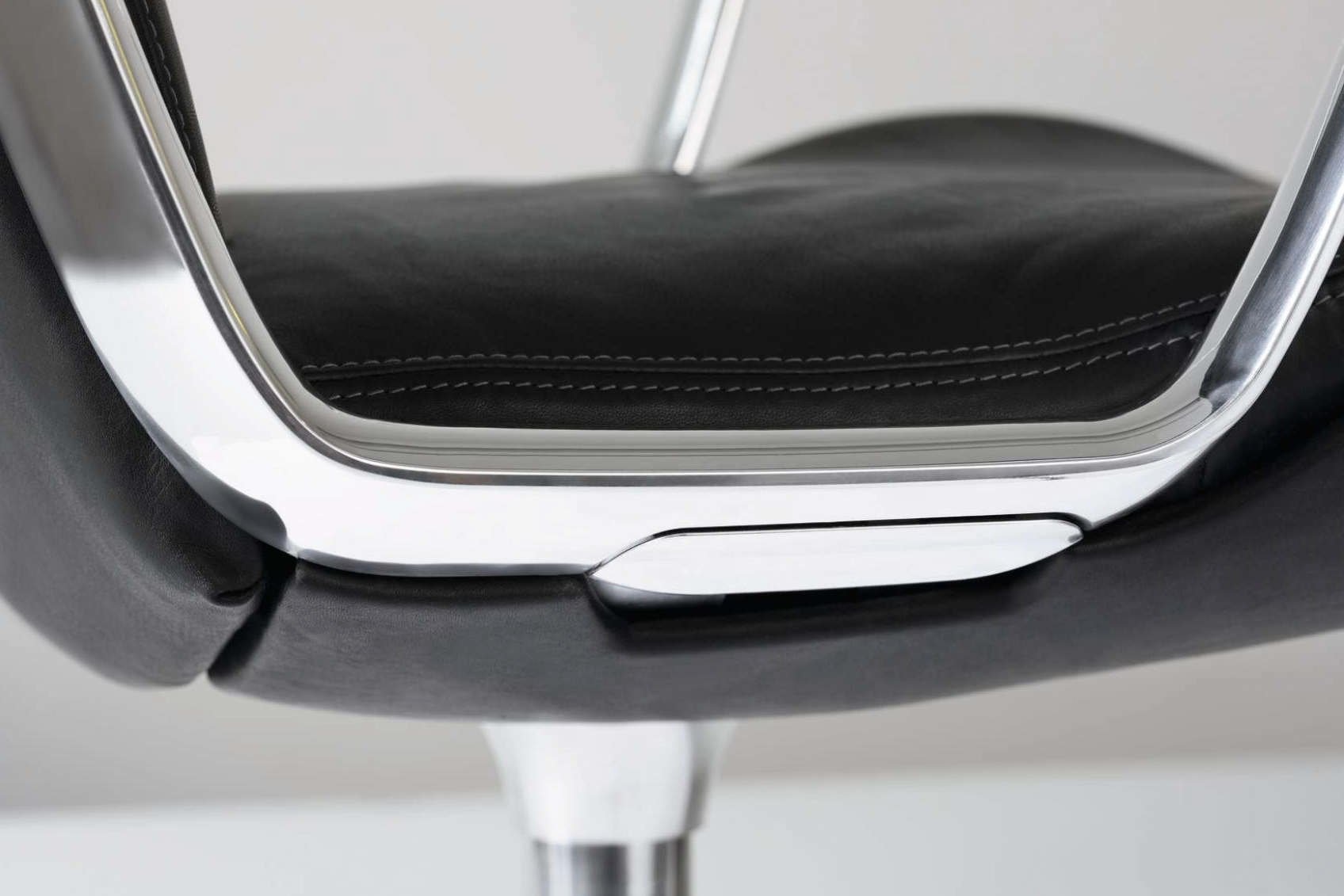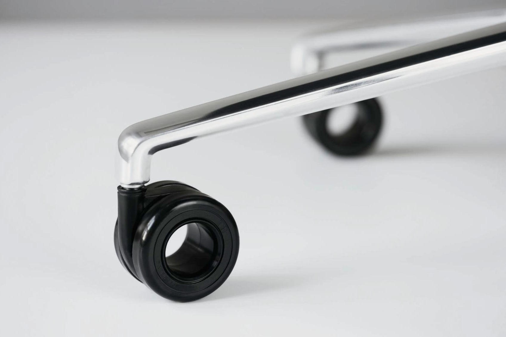 Onderstel is 5-poots (stervoet) in gegoten aluminium, helder verchroomd, mat gepolijst en gecoat in zwart of wit met een gestructureerde matte afwerking.