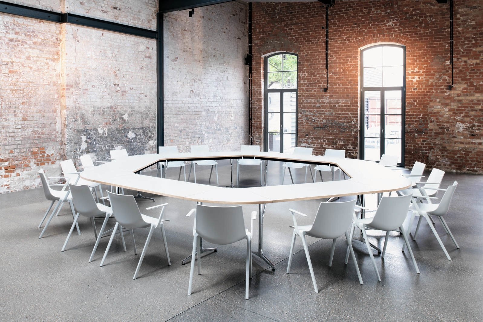 Vele tafelopstellingen mogelijk: met drie tafelvoeten, zes dieptes, acht breedtes, stand-alone en systeemtafels, die bladeren en tafels met elkaar verbinden in een rechte lijn of in een hoek worden geplaatst.